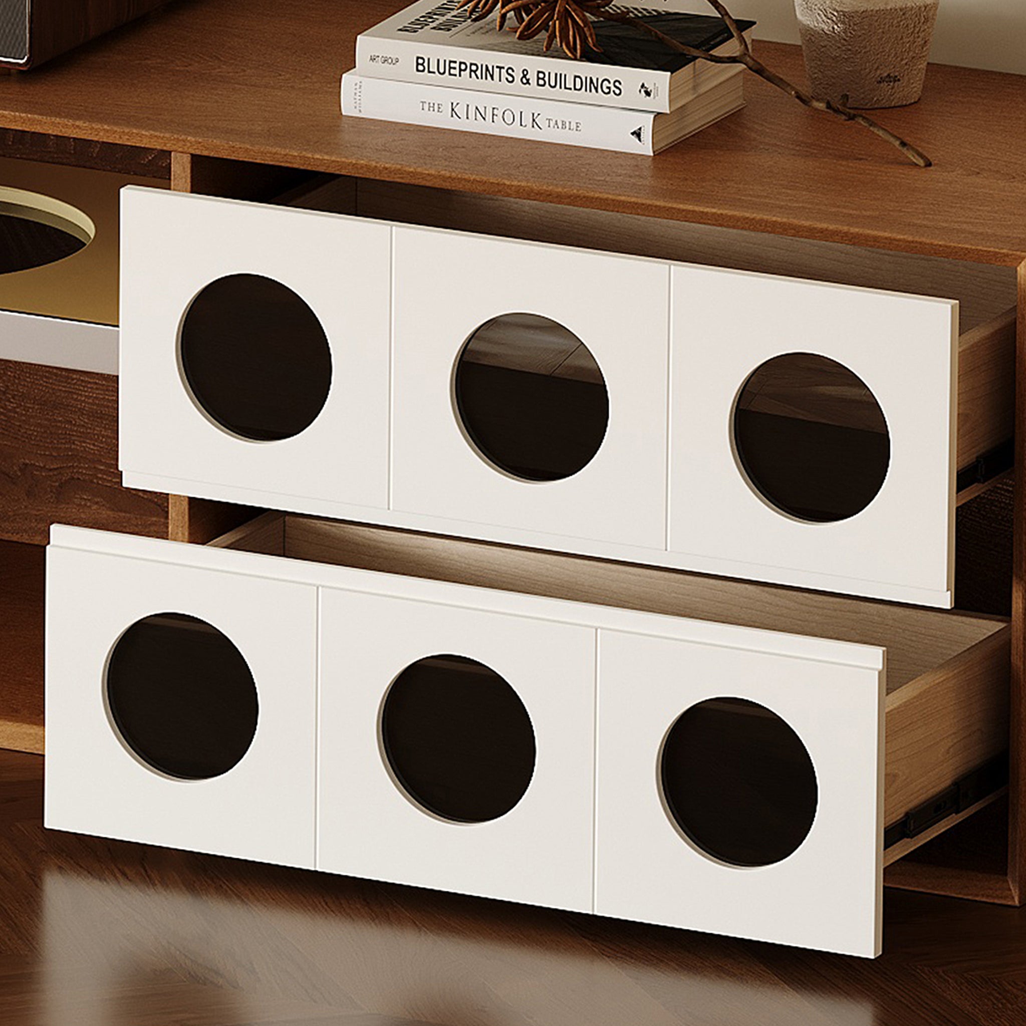 Thoughtfully designed interior shelving offers ample room for dinnerware, books, media, or décor—keeping your space organized without sacrificing style.