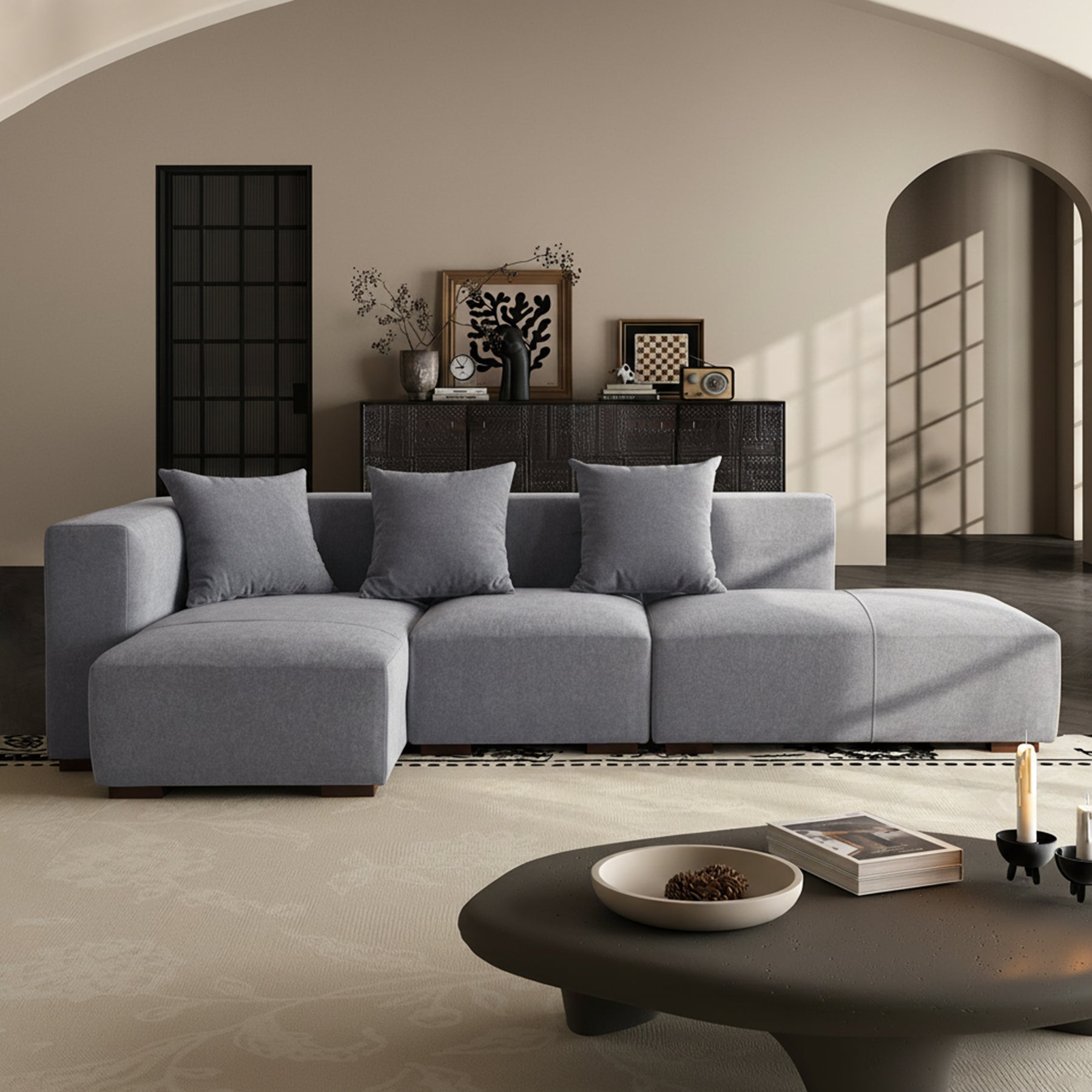 Ricky Sectional looks like Orange Ricky in Tetris. With two perpendicular chaises, you can cuddle with your loved ones cozily on the sectional. Its soft and breathable fabric and low thick wooden legs add a warm and relaxing vibe to your home. With plump seats and straight-cut edges, it's a sectional for charm and beauty. The softness and comfort make Ricky Sectional your perfect oasis to capture a serene aesthetic. Its elegance and minimalism are destined to last for eternity.