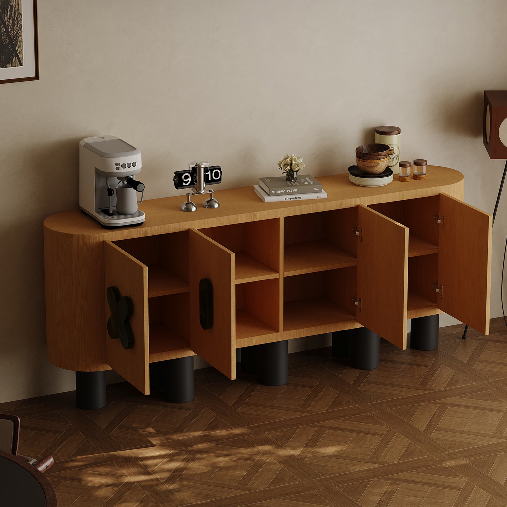 Thoughtfully designed interior shelving offers ample room for dinnerware, books, media, or décor—keeping your space organized without sacrificing style.
