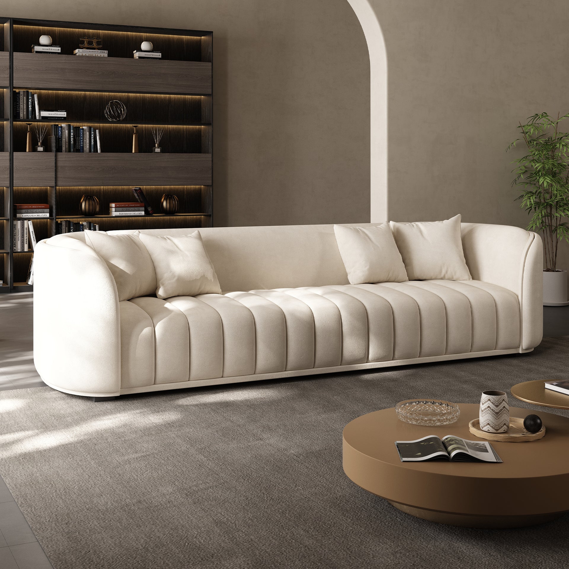 This luxury white boucle sofa combines mid-century modern style with retro charm, enhancing any living space.
