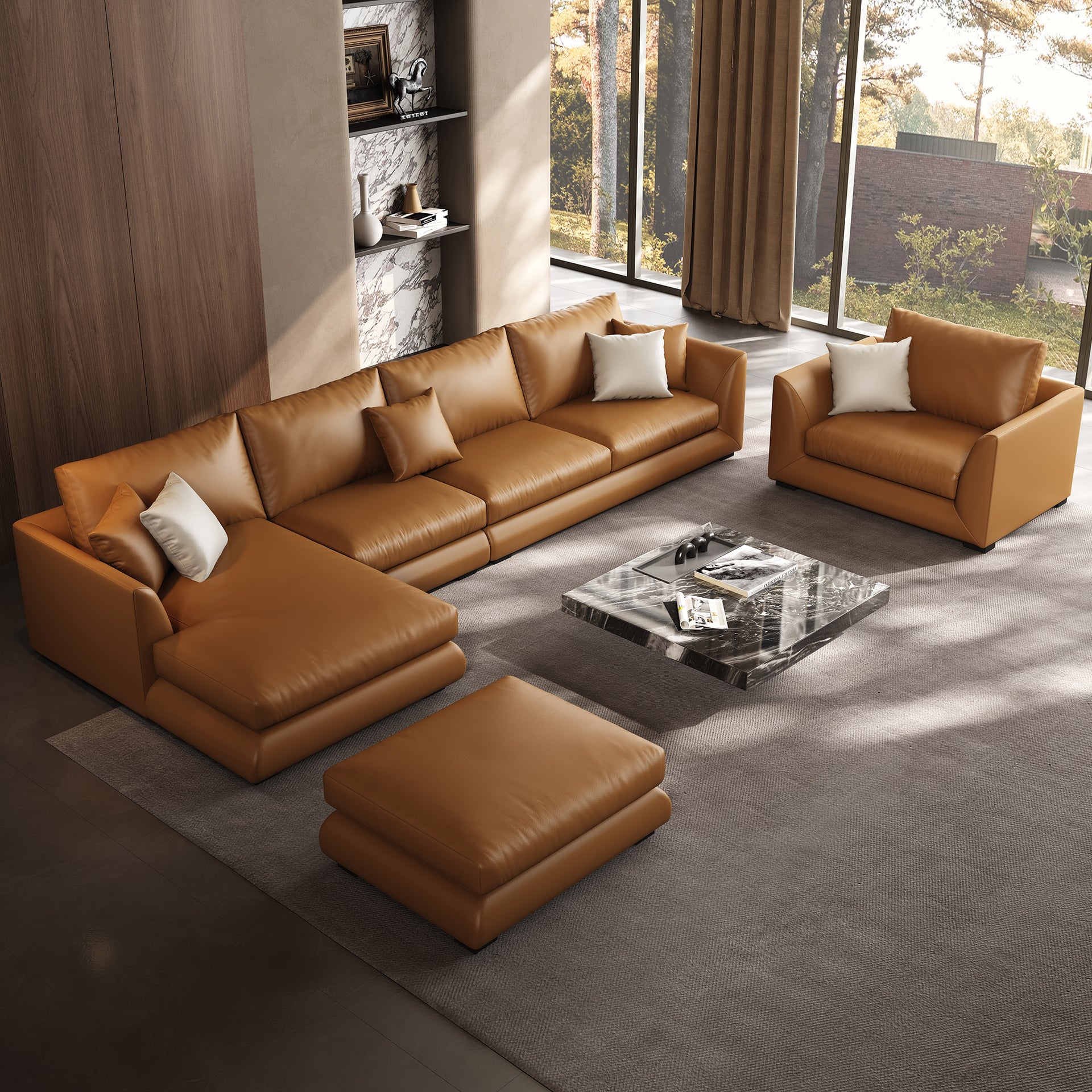 - Genuine Leather Feathers Sofa SetBrown / L-Shaped + Single Chair + Ottoman
