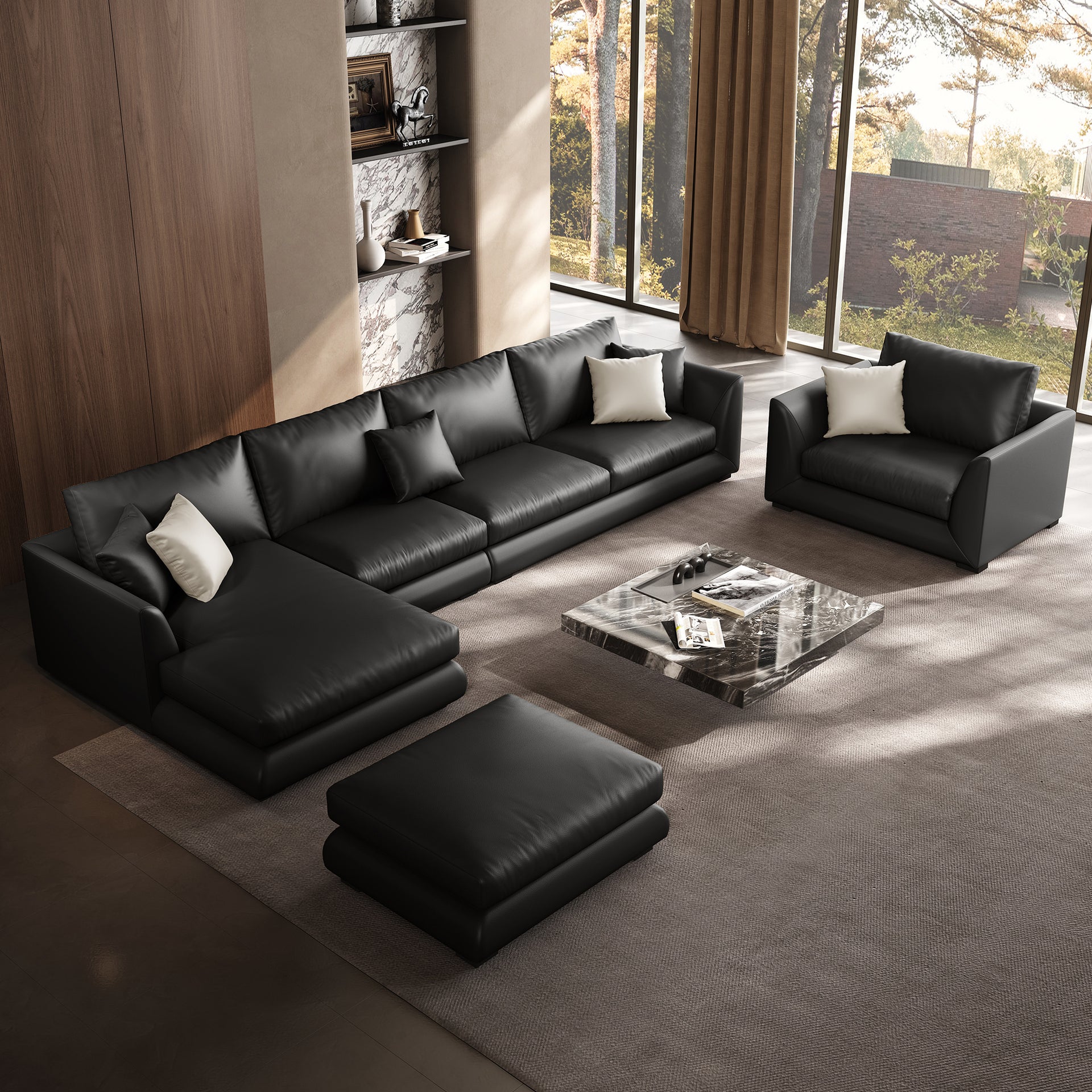 - Genuine Leather Feathers Sofa SetBlack / L-Shaped + Single Chair + Ottoman