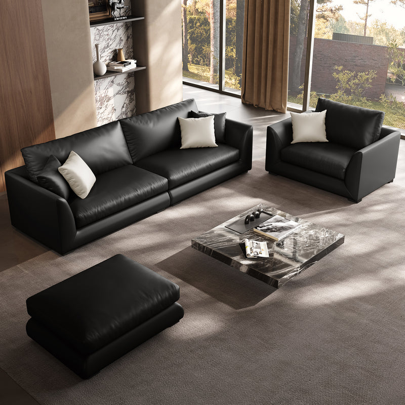 - Genuine Leather Feathers Sofa SetBlack / 4 Seater + Single Chair + Ottoman