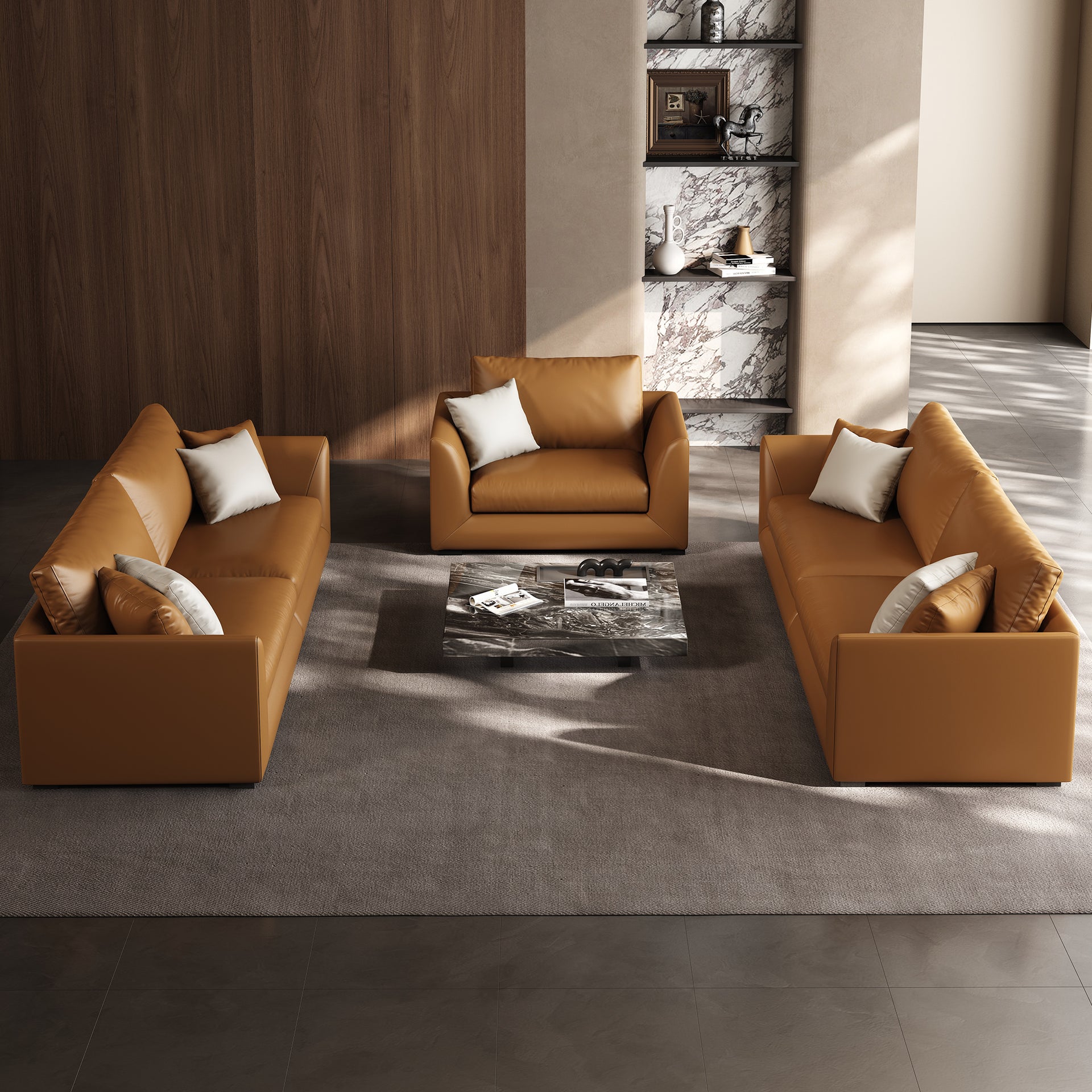 - Genuine Leather Feathers Sofa SetBrown / 4 Seater + 4 Seater + Single Chair