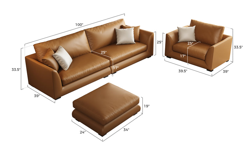 - Genuine Leather Feathers Sofa SetBrown / 4 Seater + Single Chair + Ottoman