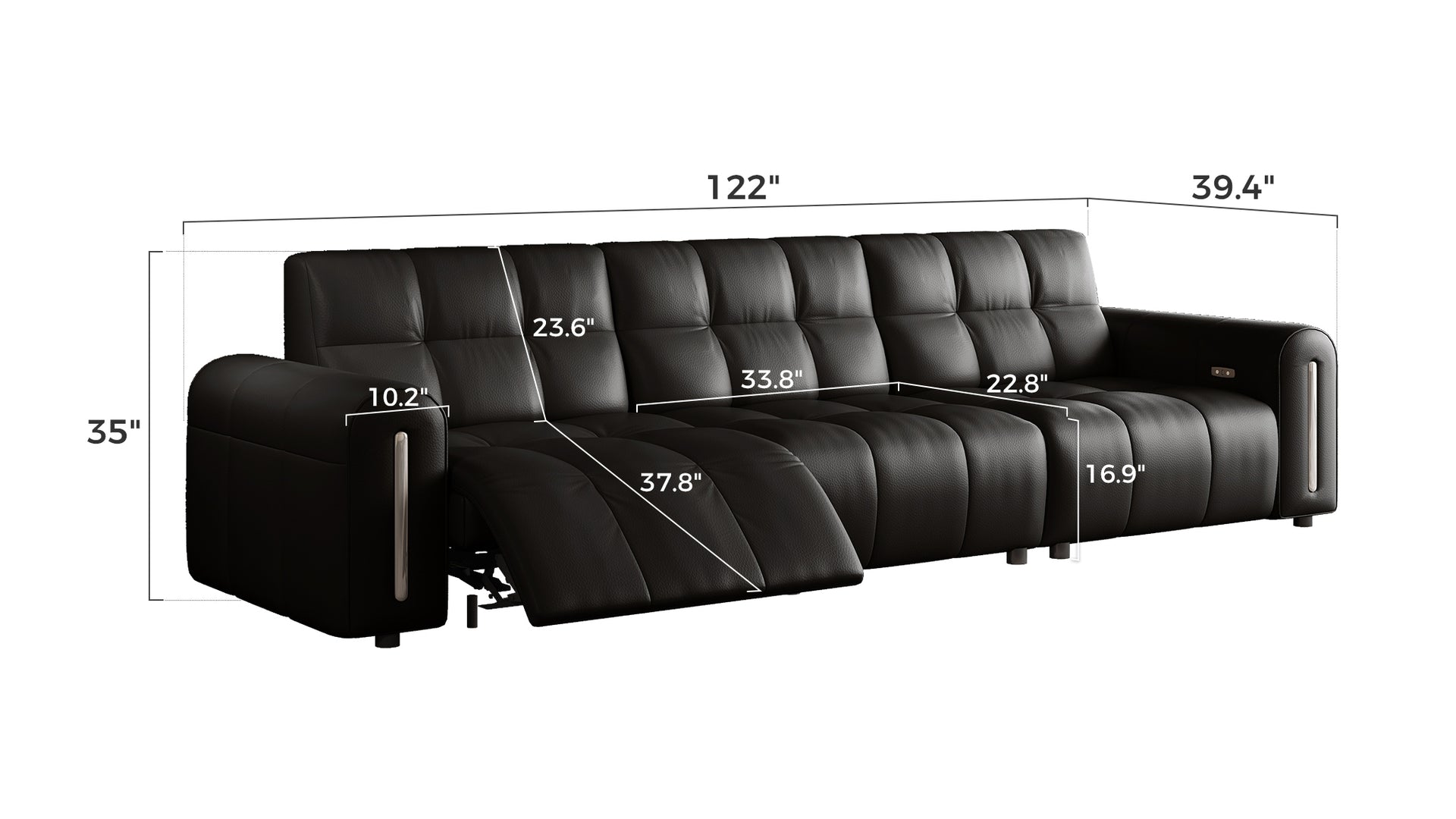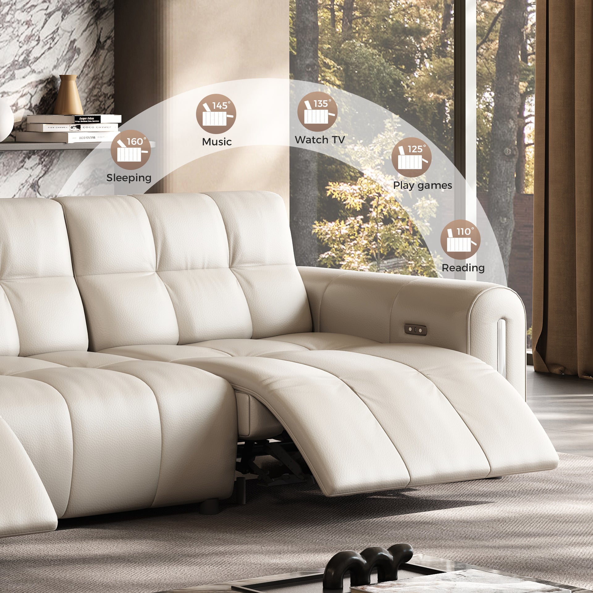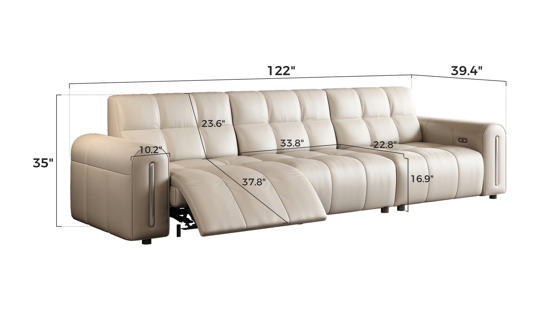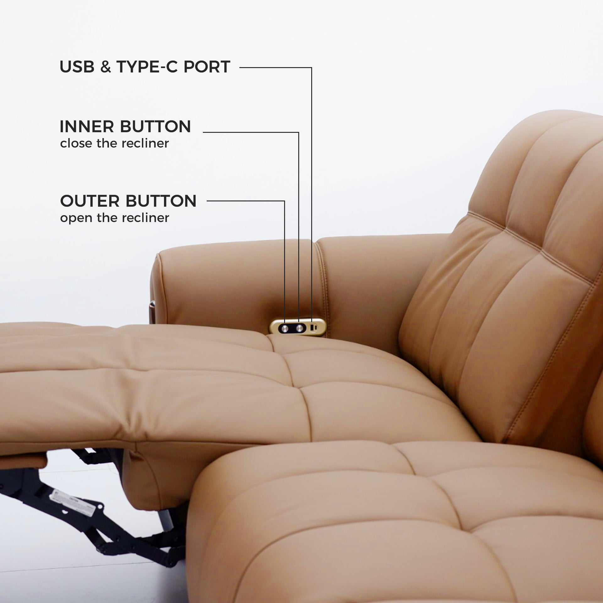 Two user-friendly buttons control reclining — one for opening, one for closing — while the integrated USB port allows you to charge devices conveniently while seated.