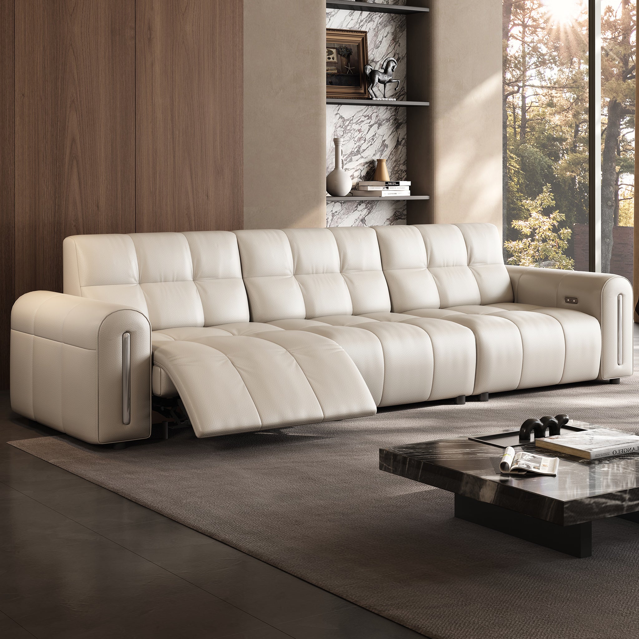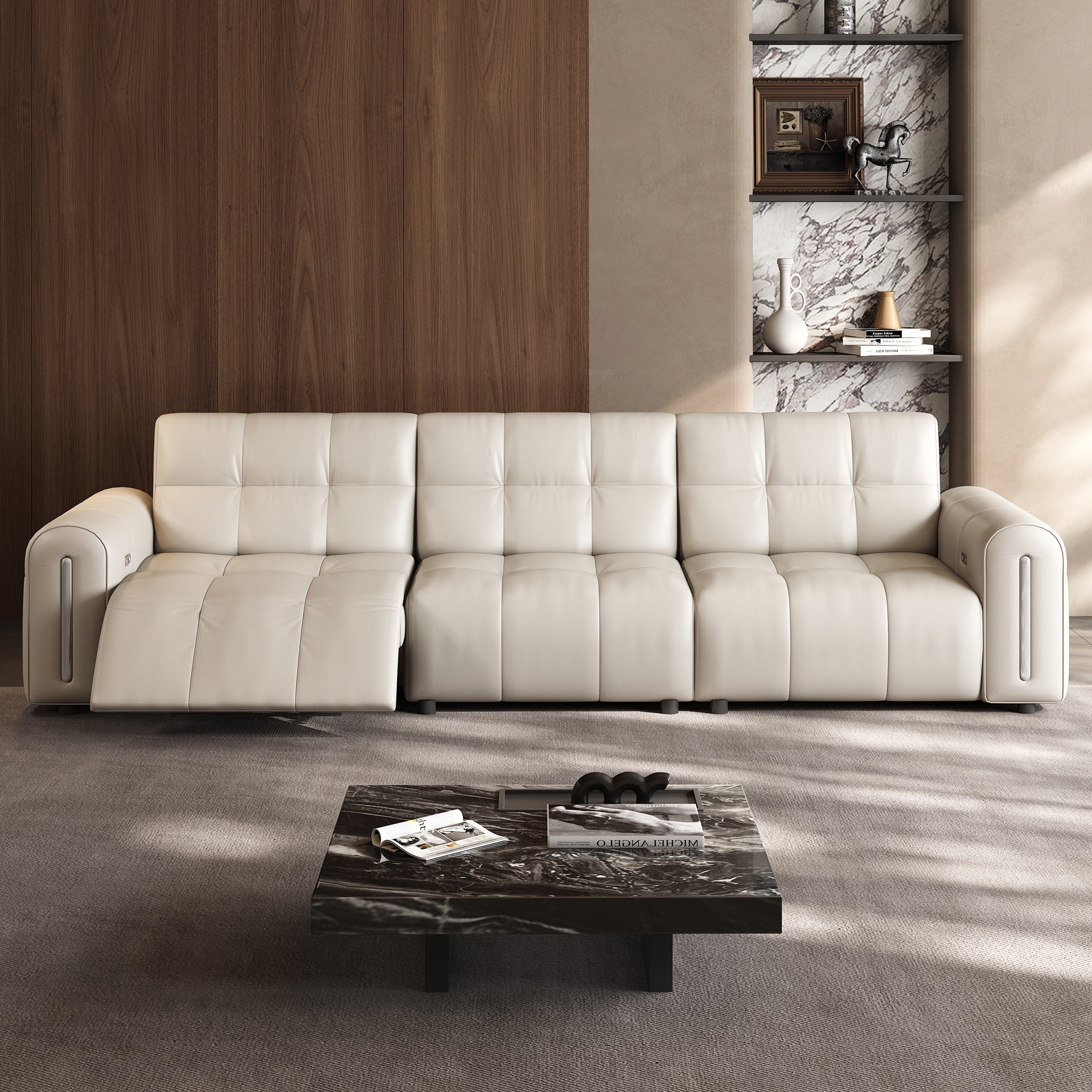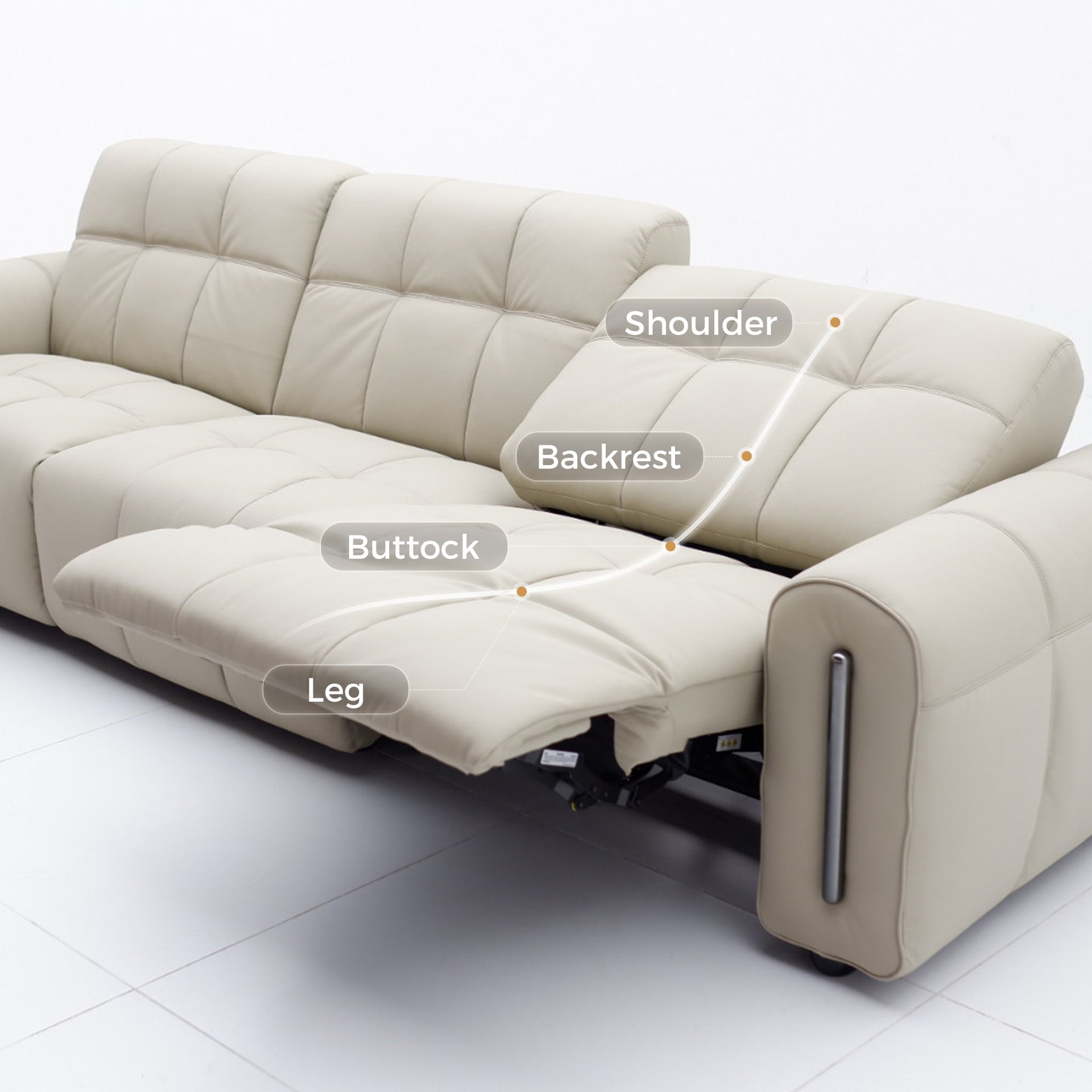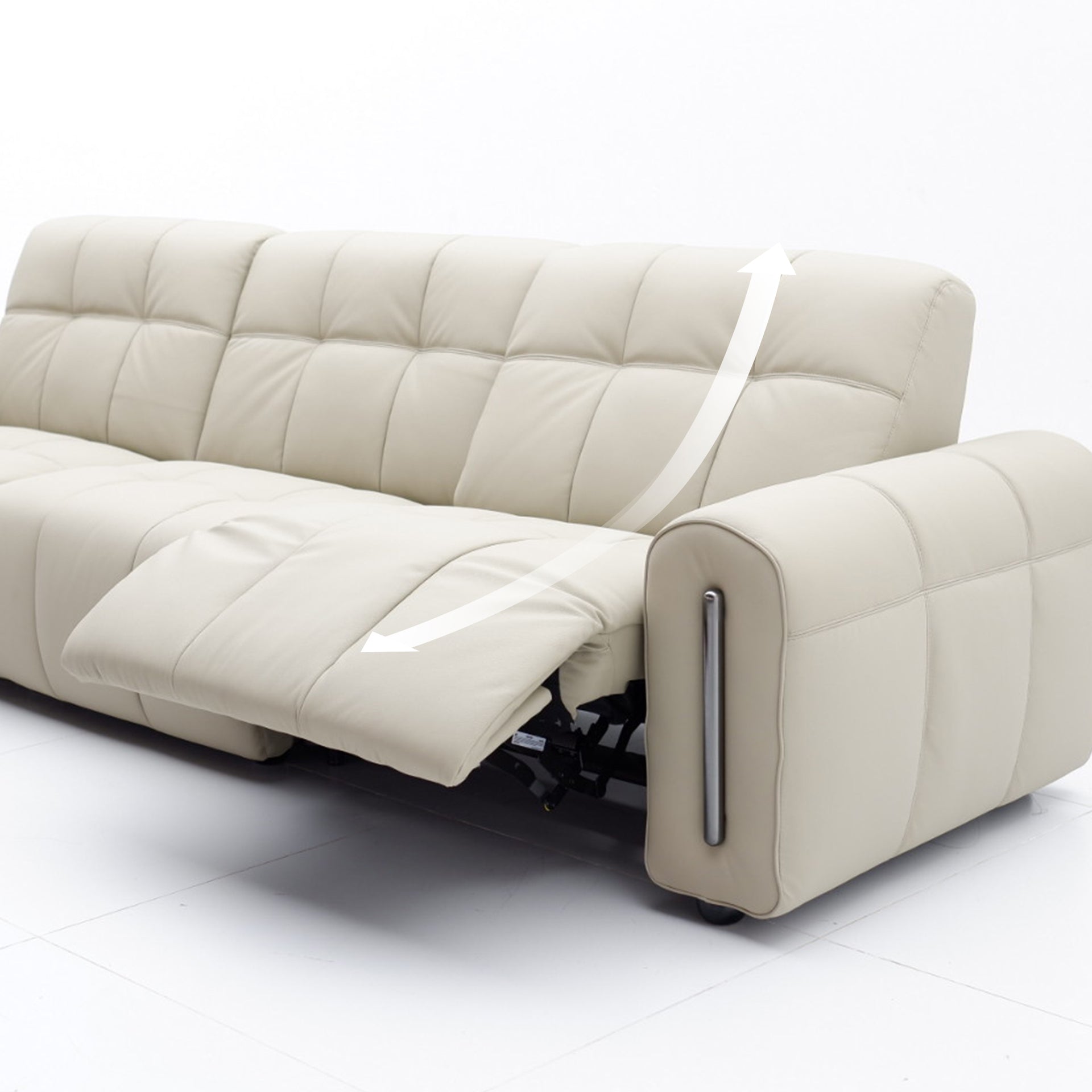 The reclining mechanism glides the seat forward, allowing the sofa to sit flush against the wall without risk of collision, saving space while keeping full functionality.