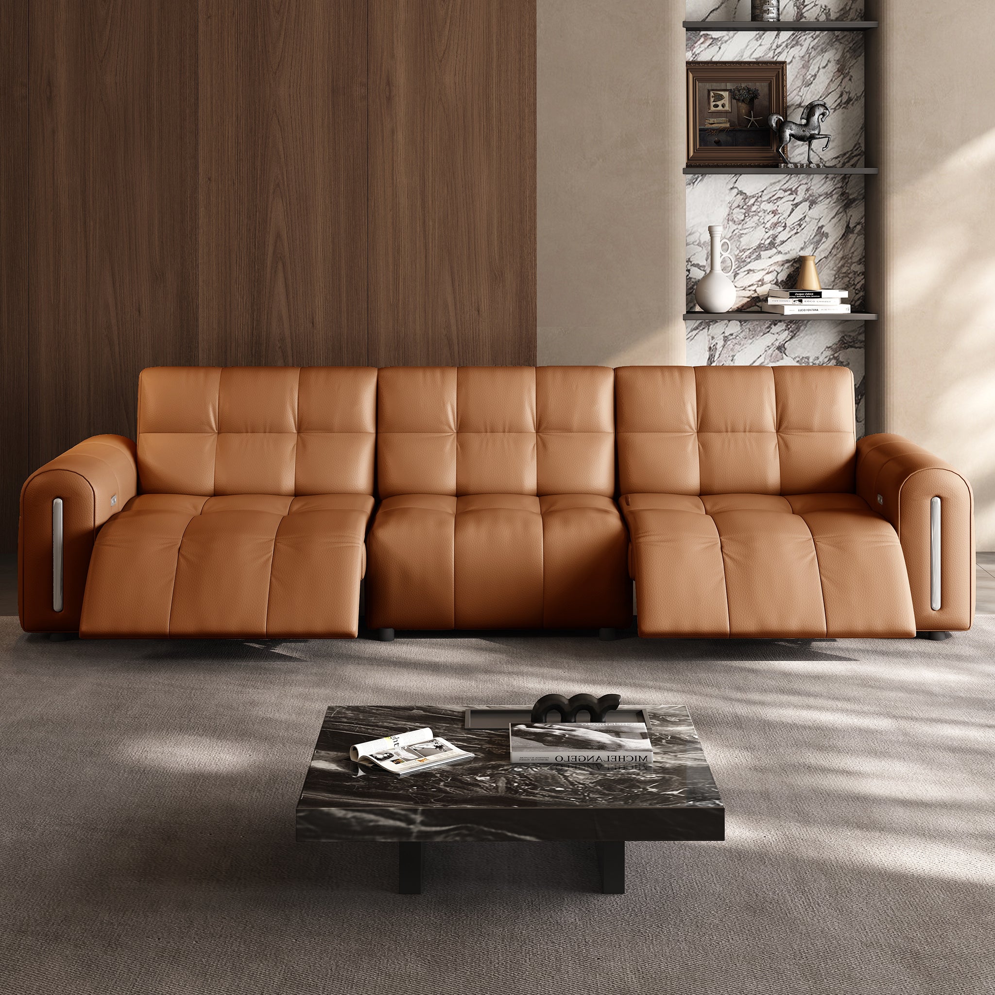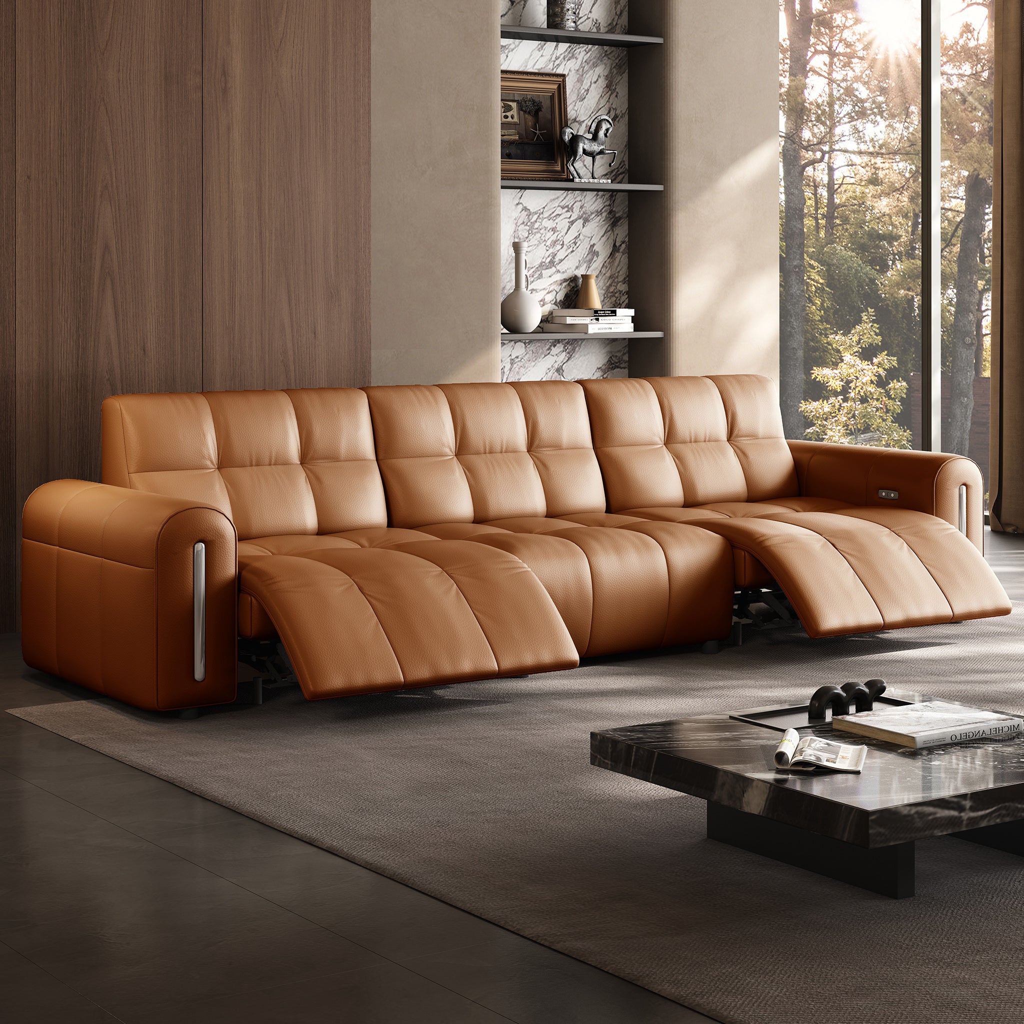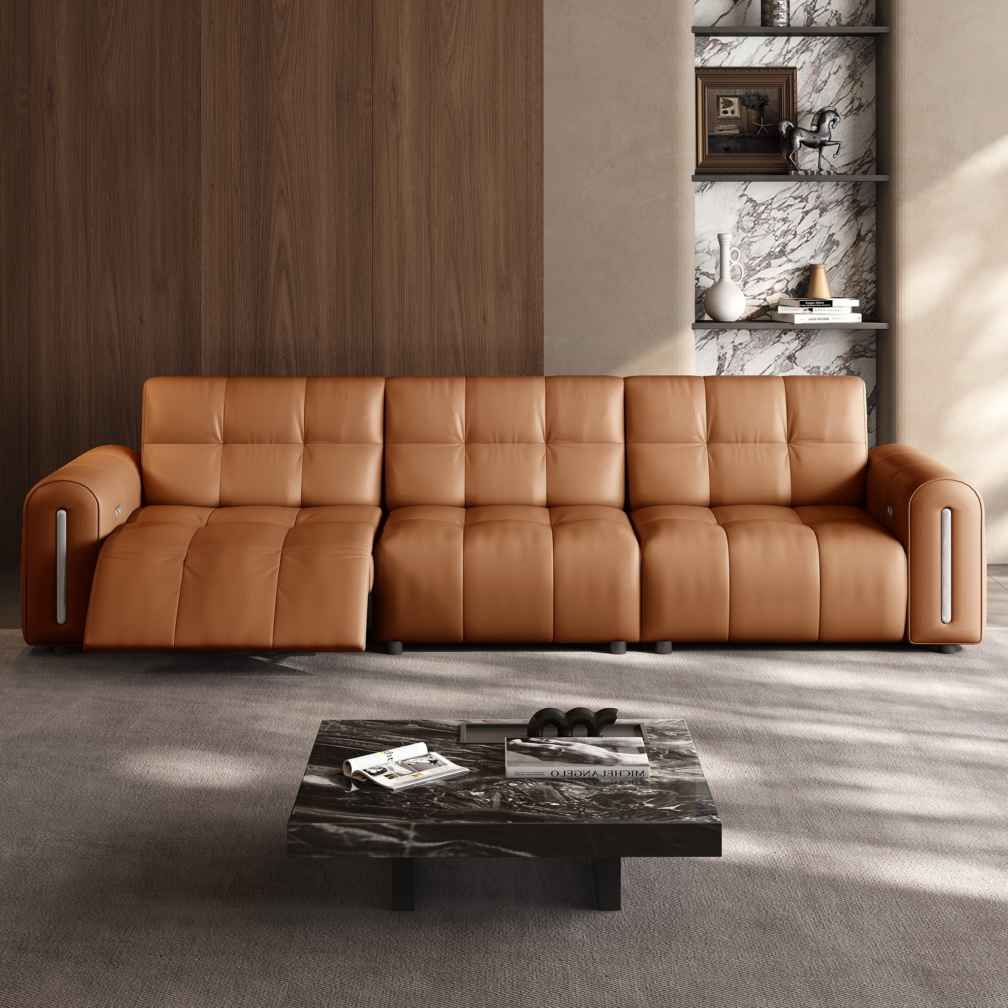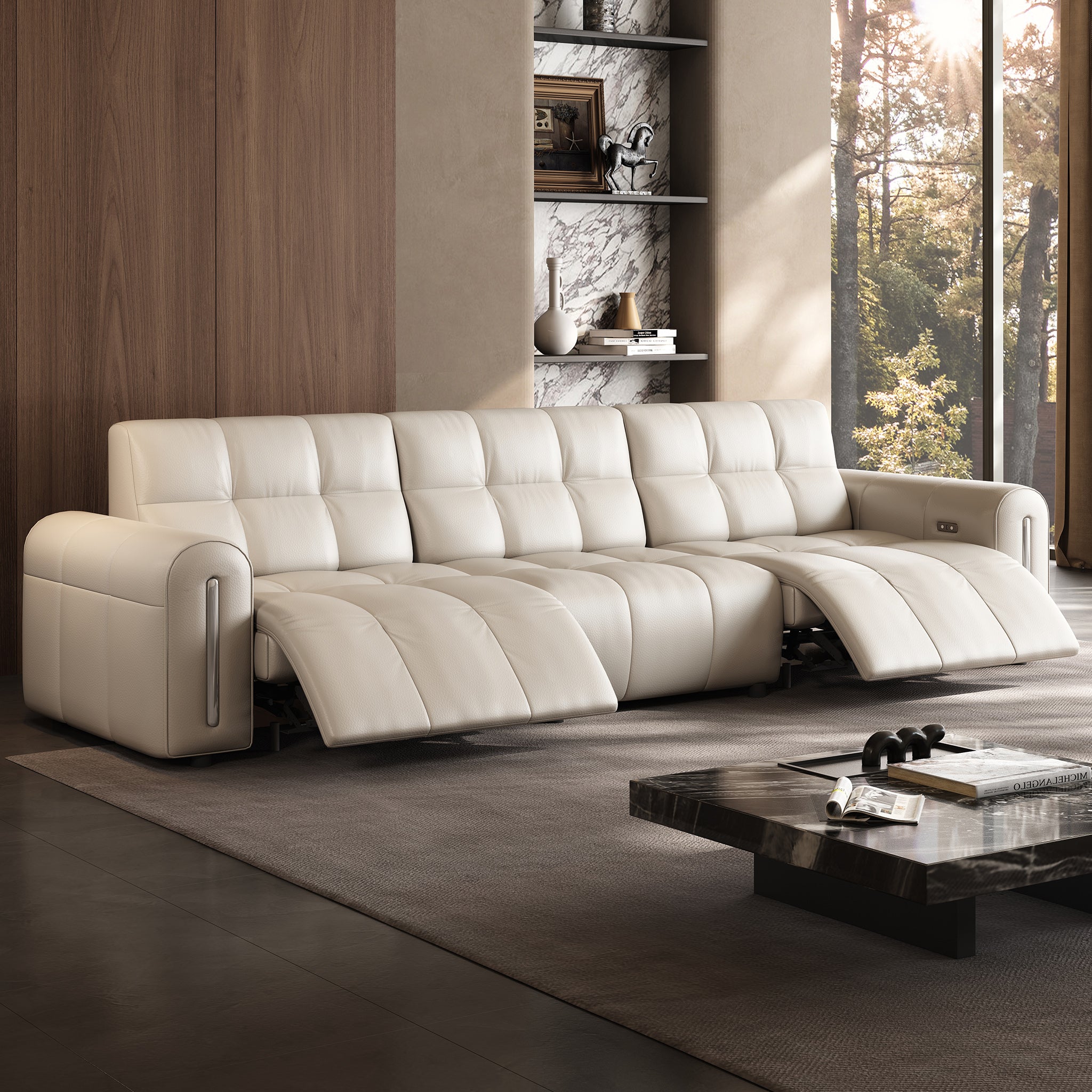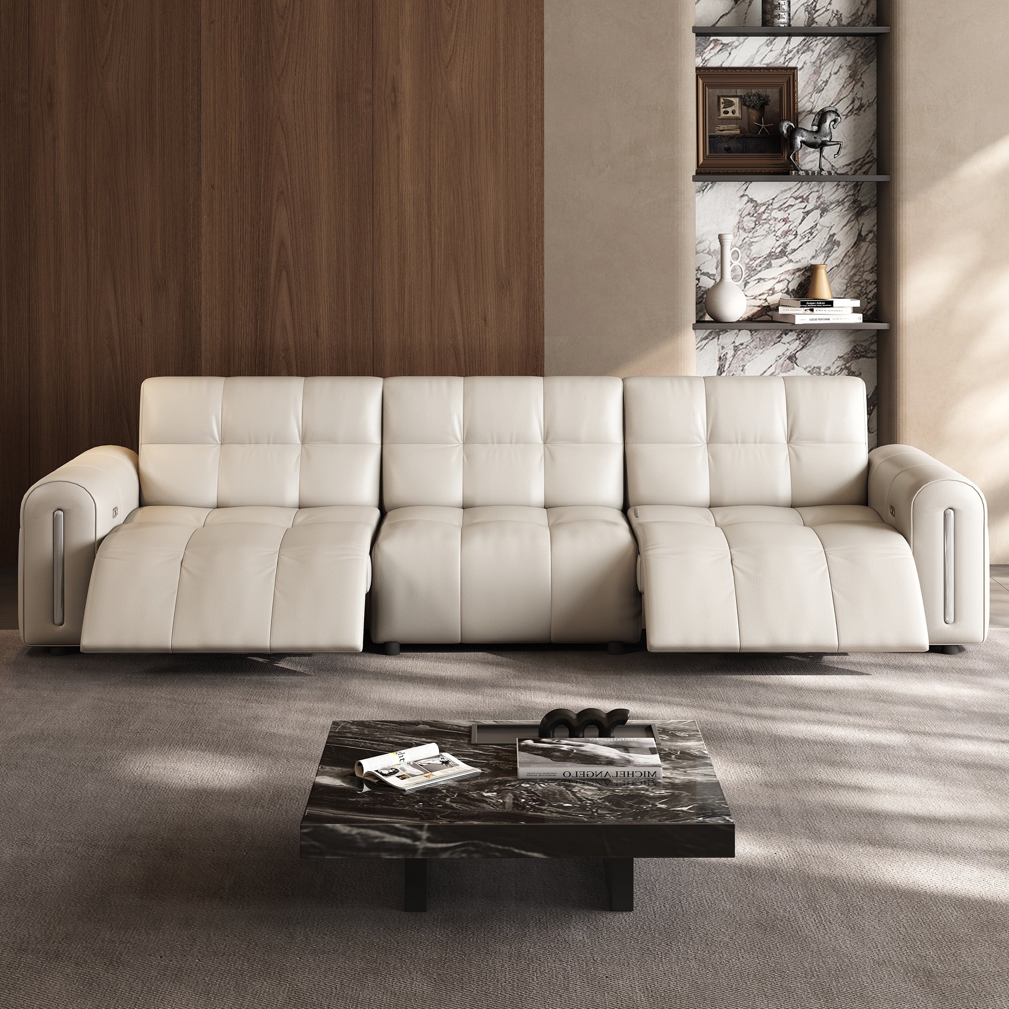 The reclining mechanism glides the seat forward, allowing the sofa to sit flush against the wall without risk of collision, saving space while keeping full functionality.