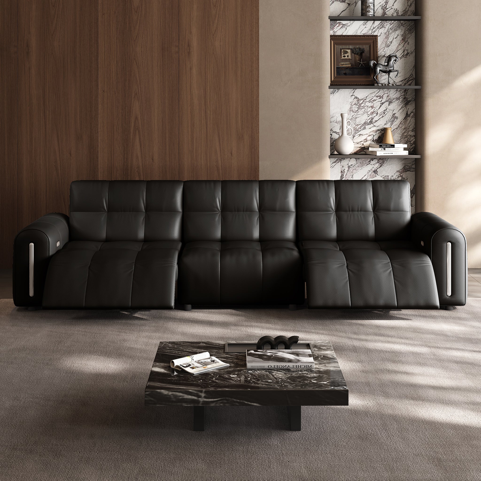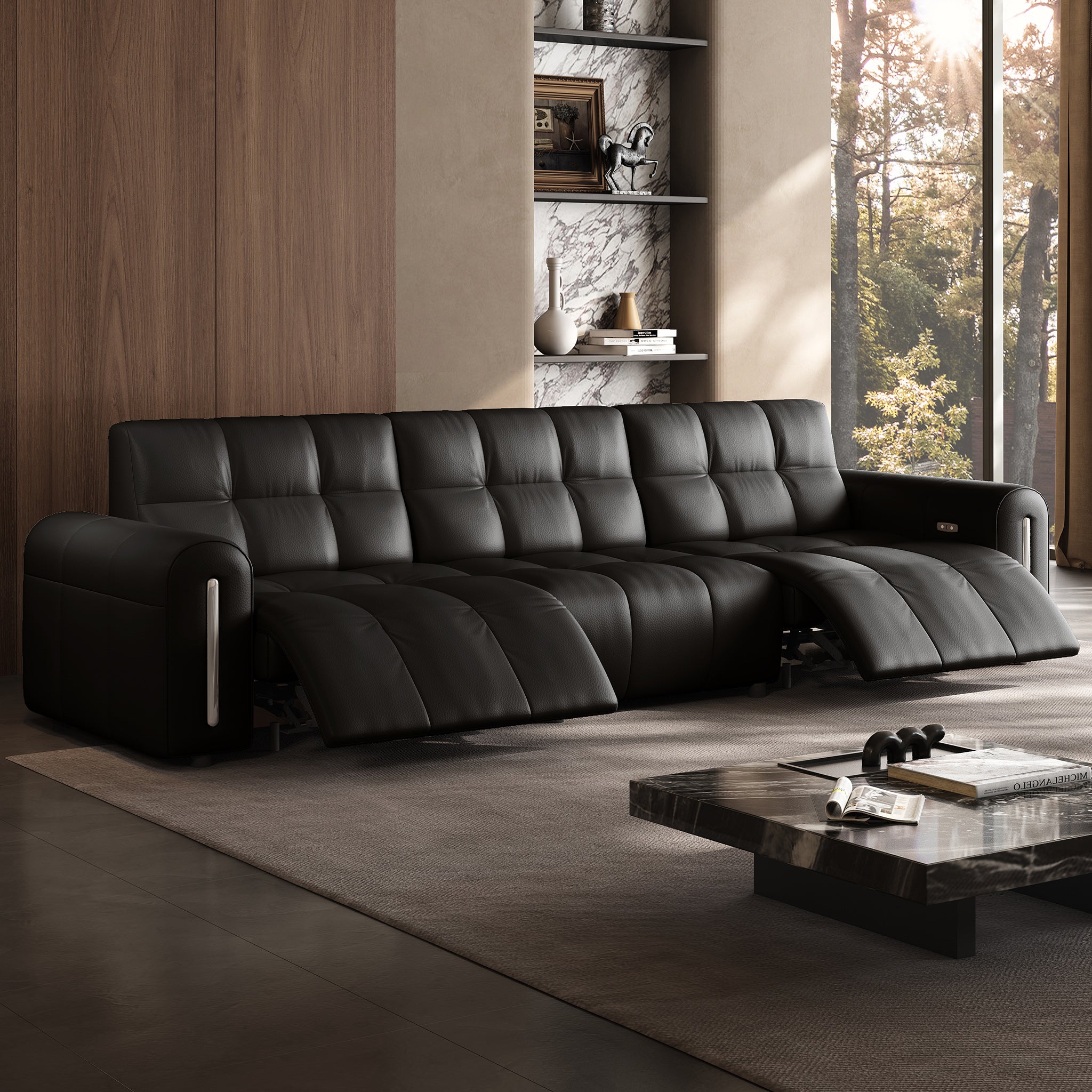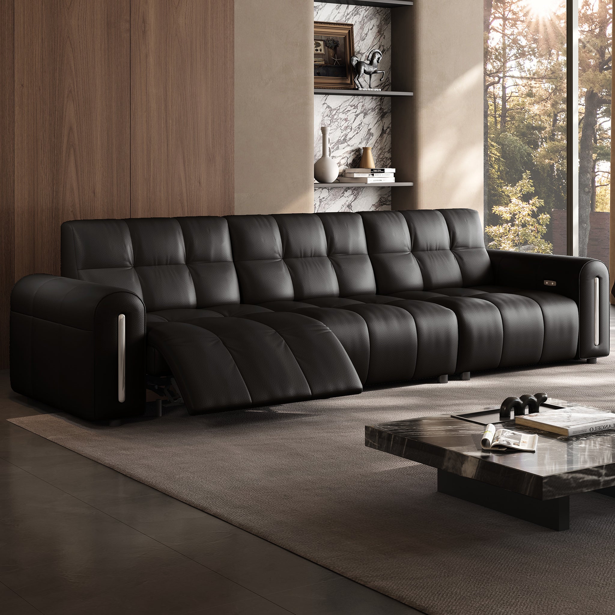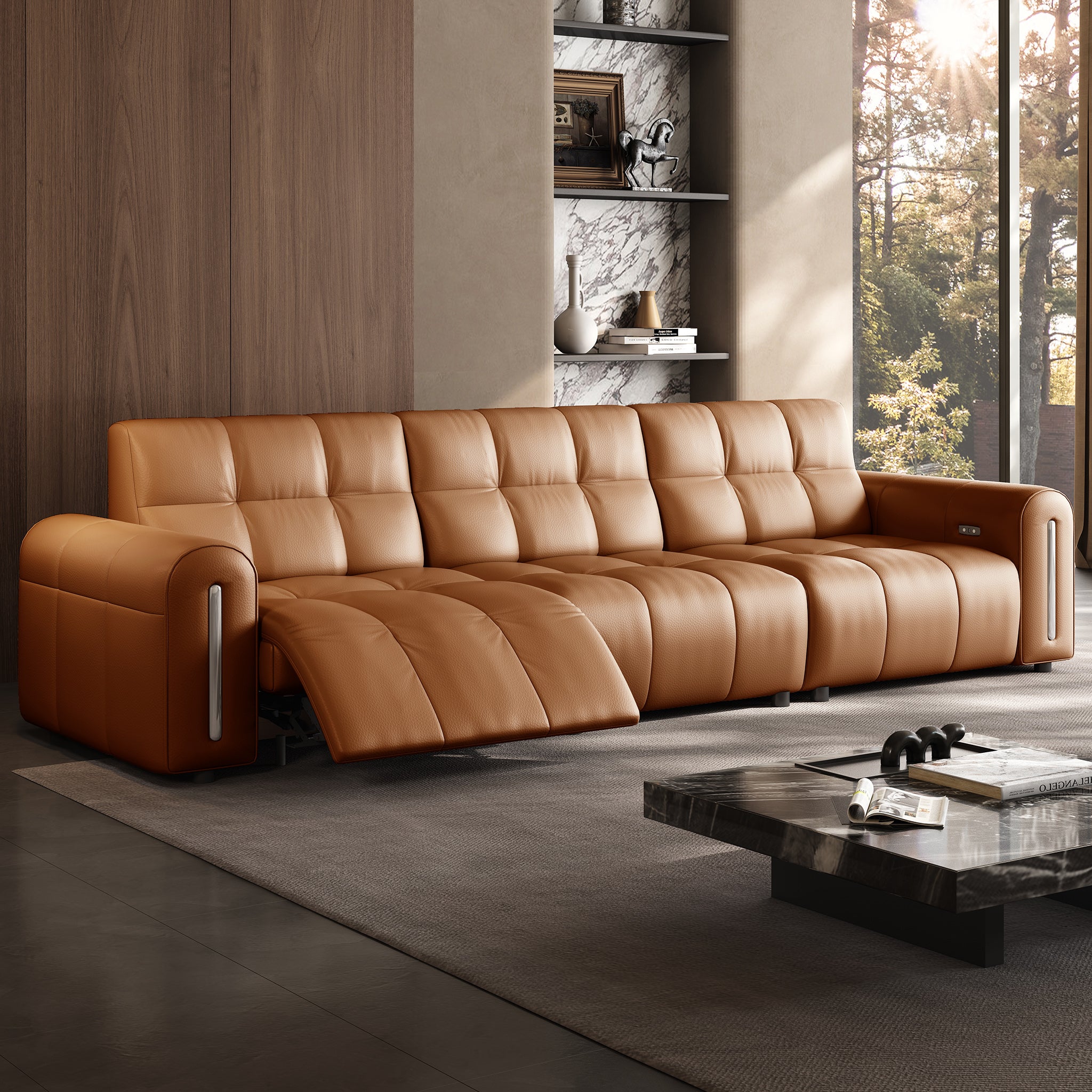 The reclining mechanism glides the seat forward, allowing the sofa to sit flush against the wall without risk of collision, saving space while keeping full functionality.