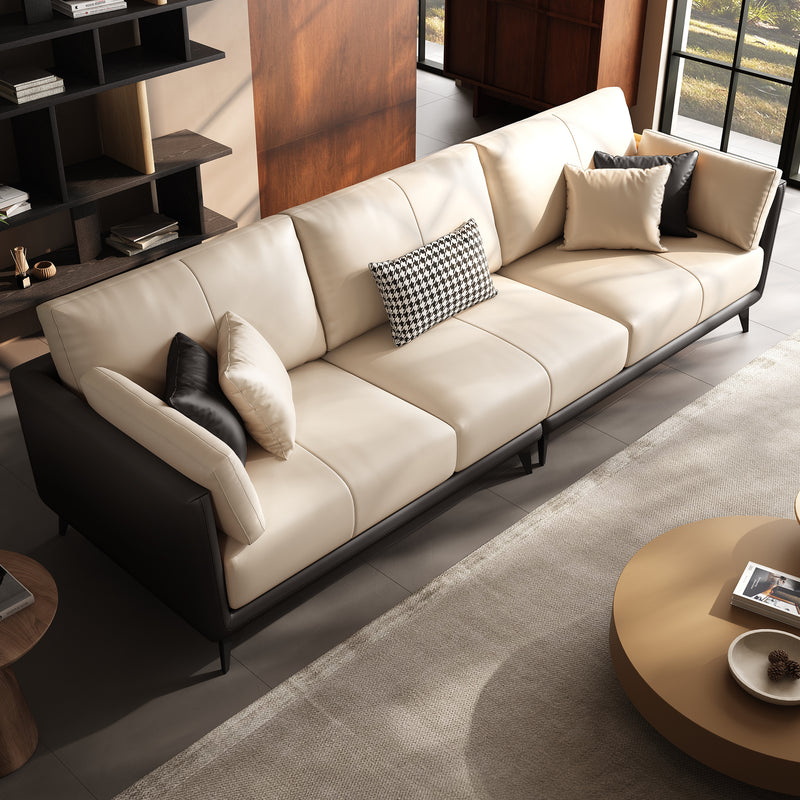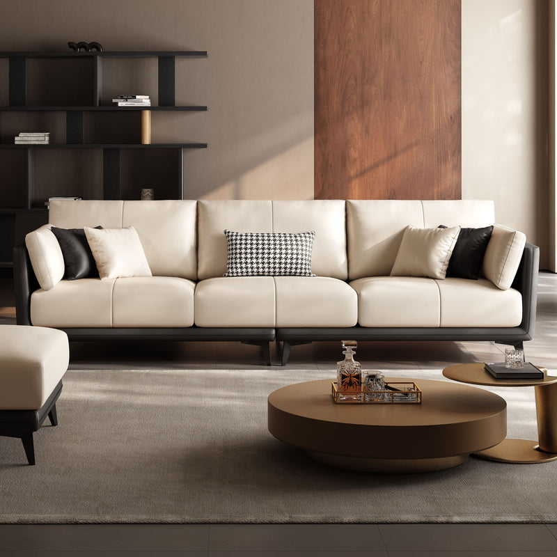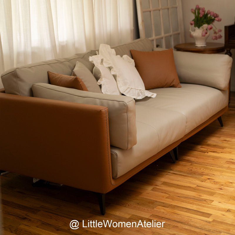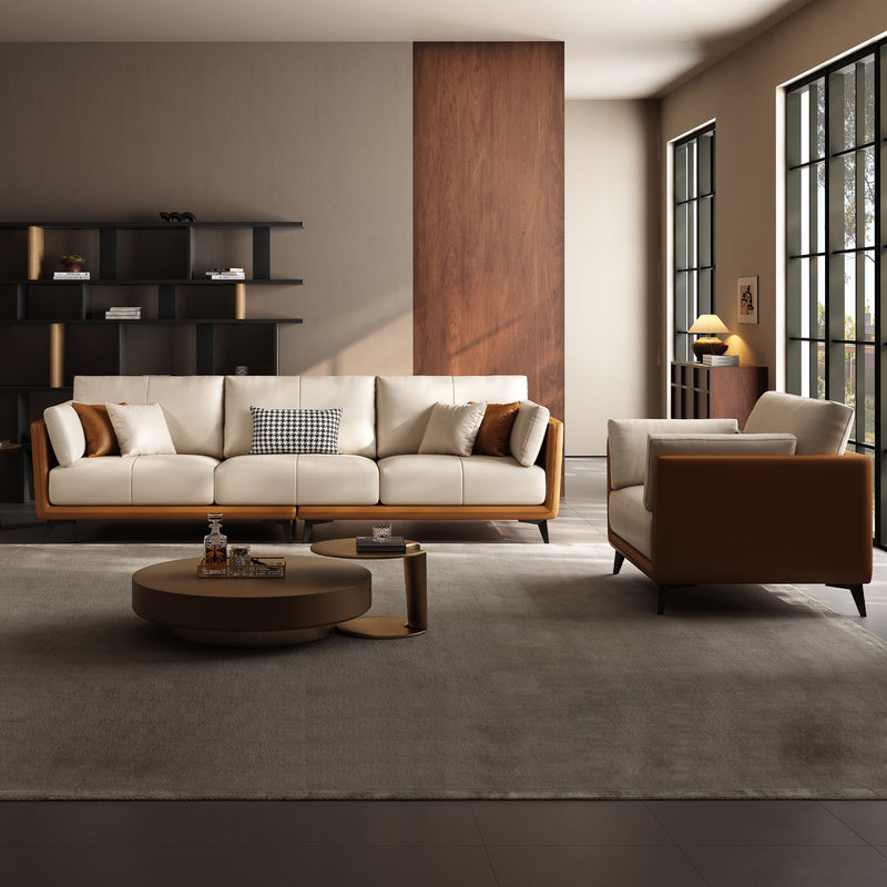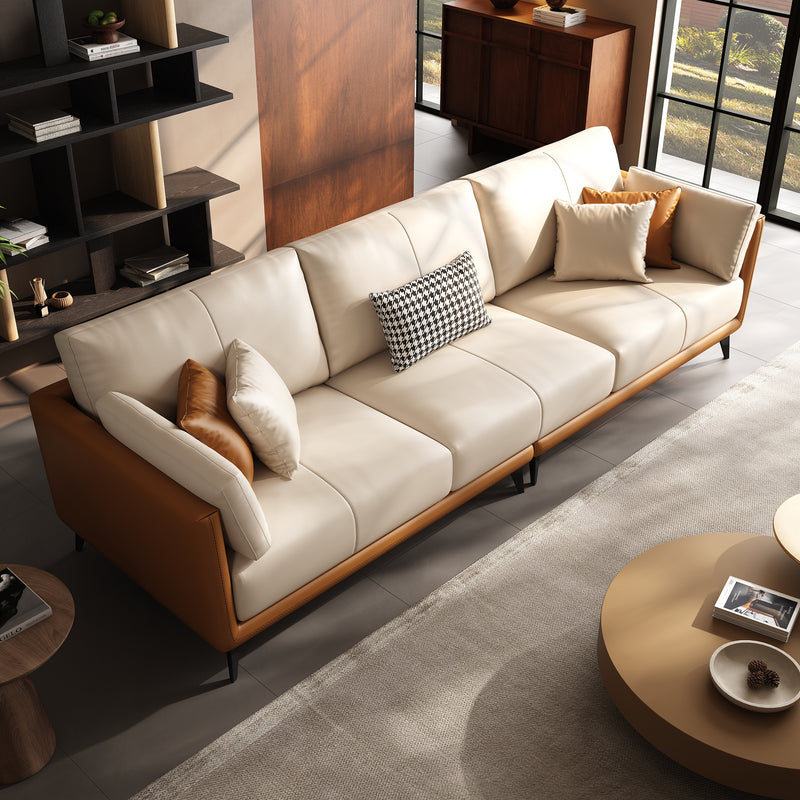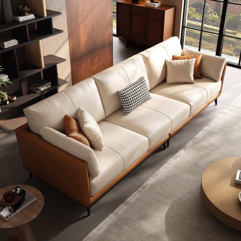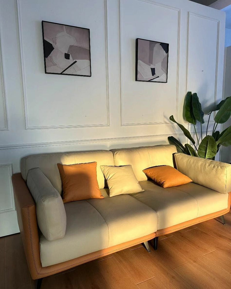 Relax into a sofa made to last.Wrapped in premium genuine leather with vegan leather accents, it balances supple softness with enduring support. Perfect for cozy nights, slow mornings, or relaxed afternoons, this sofa brings quiet confidence to your space—comfortable, durable, and beautifully understated.