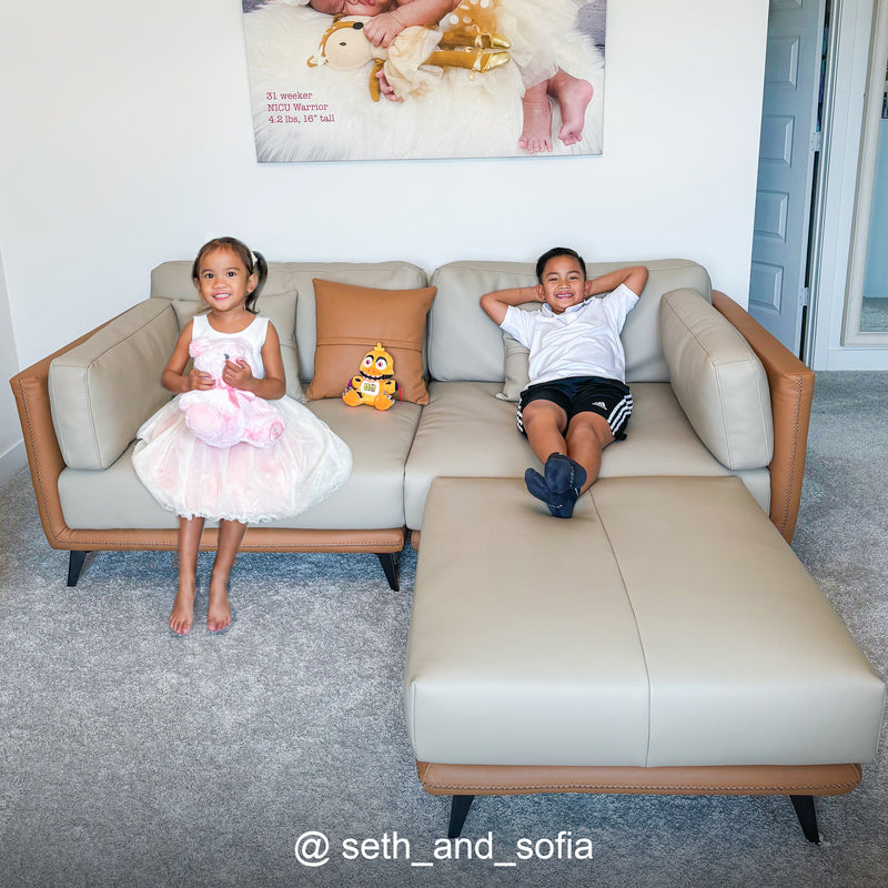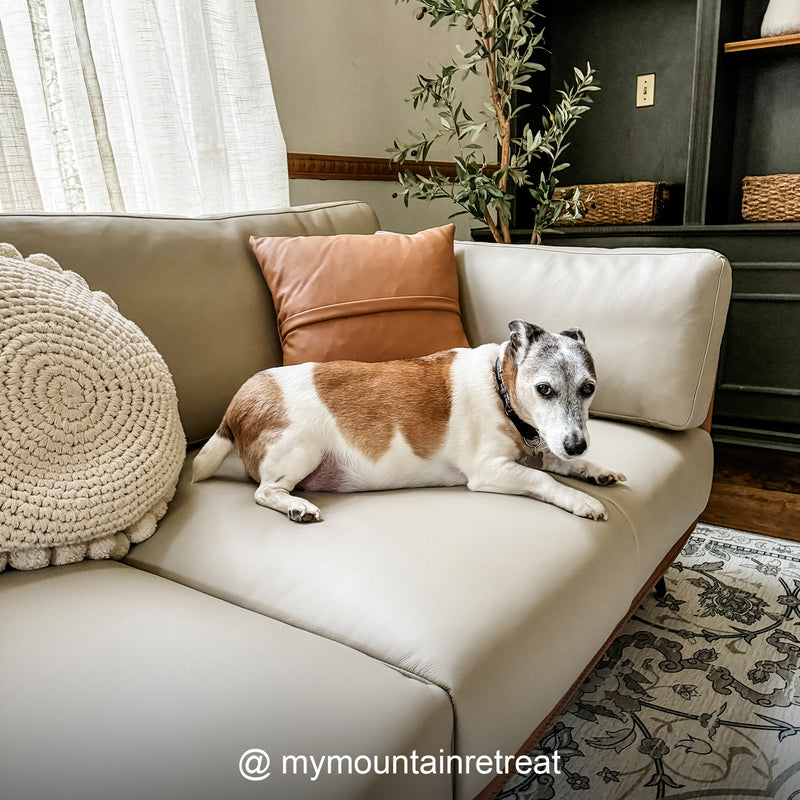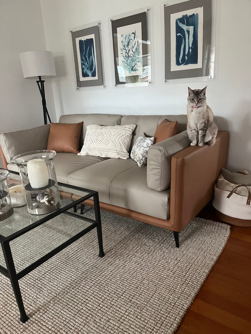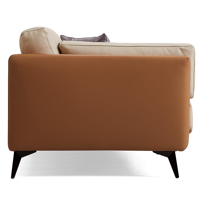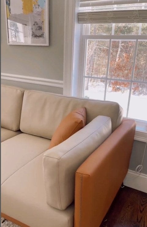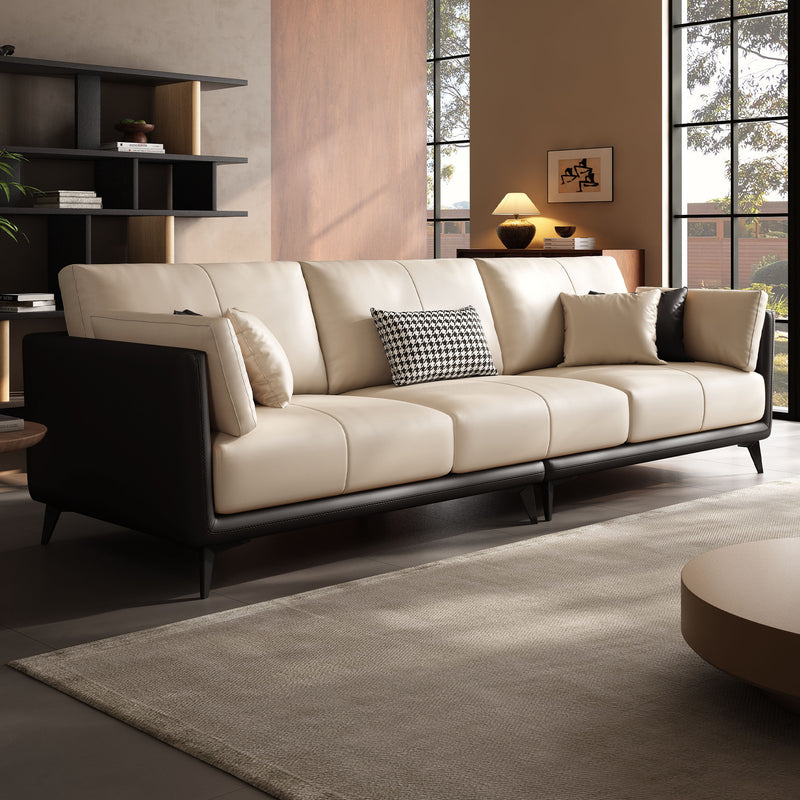 Relax into a sofa made to last.Wrapped in premium genuine leather with vegan leather accents, it balances supple softness with enduring support. Perfect for cozy nights, slow mornings, or relaxed afternoons, this sofa brings quiet confidence to your space—comfortable, durable, and beautifully understated.