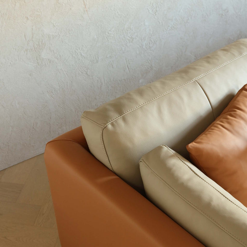 Relax into a sofa made to last.Wrapped in premium genuine leather with vegan leather accents, it balances supple softness with enduring support. Perfect for cozy nights, slow mornings, or relaxed afternoons, this sofa brings quiet confidence to your space—comfortable, durable, and beautifully understated.