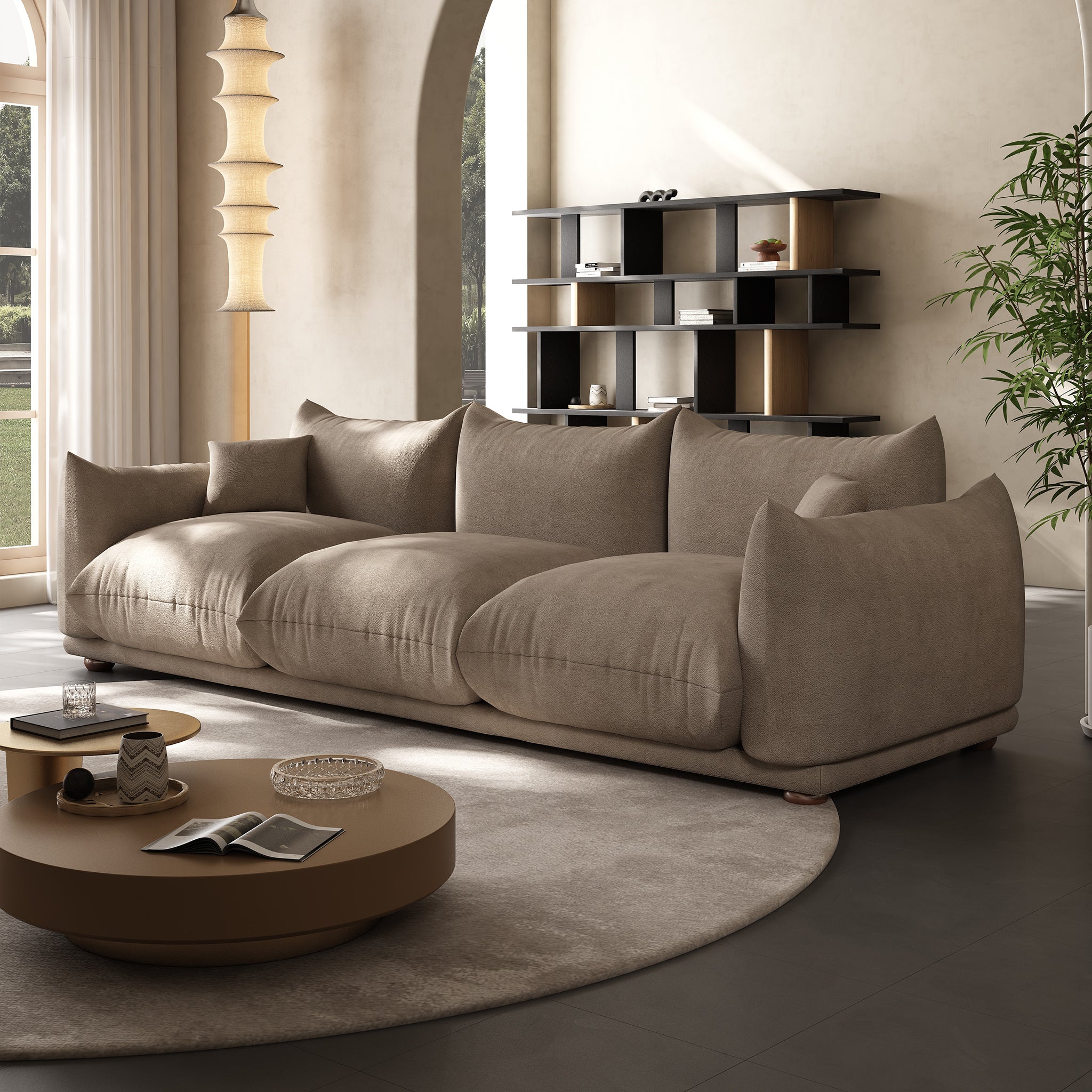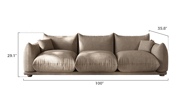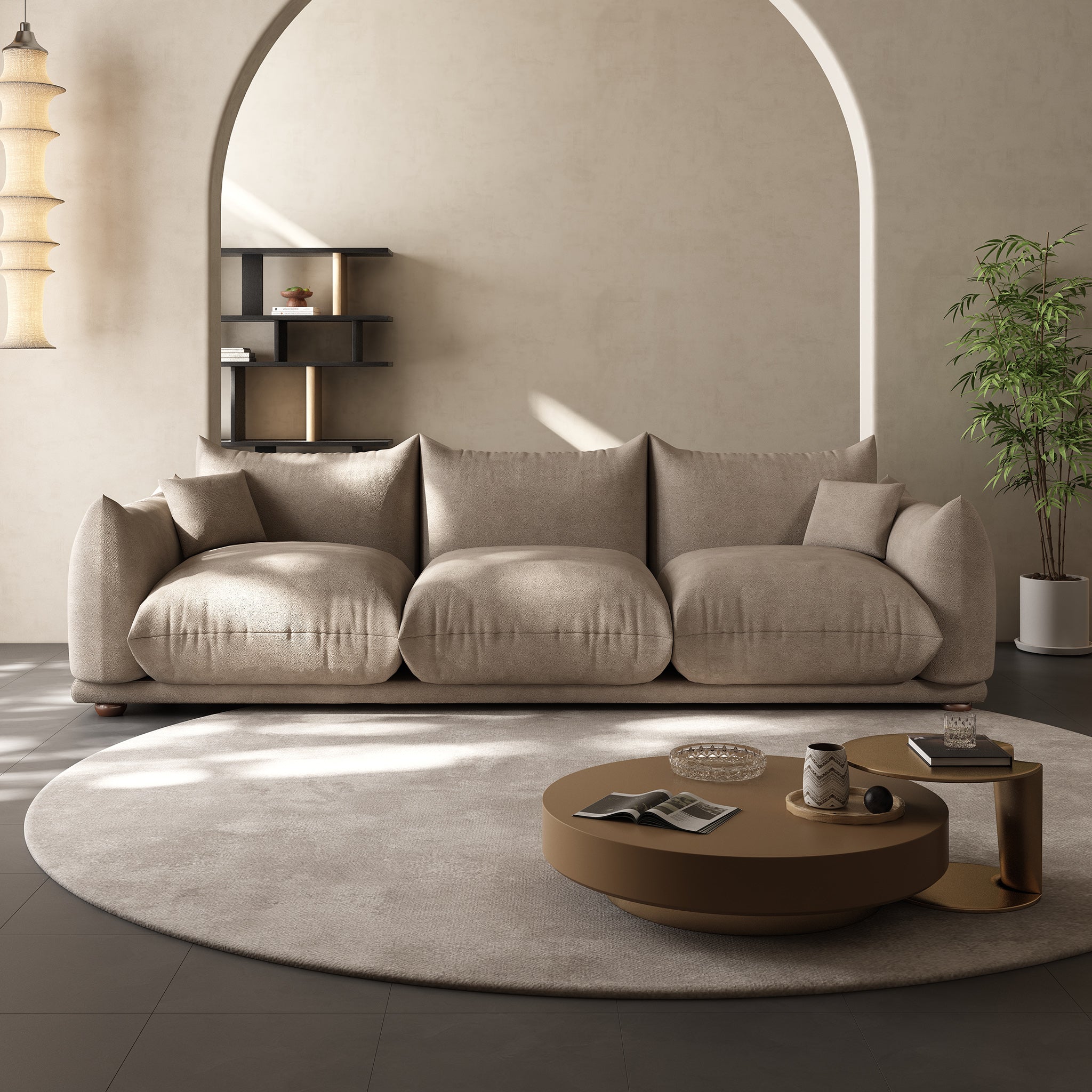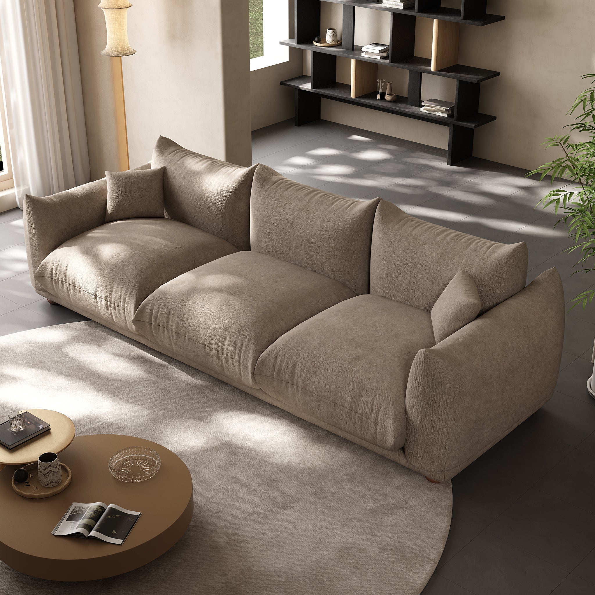 The Kely 100'' Mocha Boucle Sofa is a chic and adaptable addition to living rooms, game rooms, or entertainment spaces.