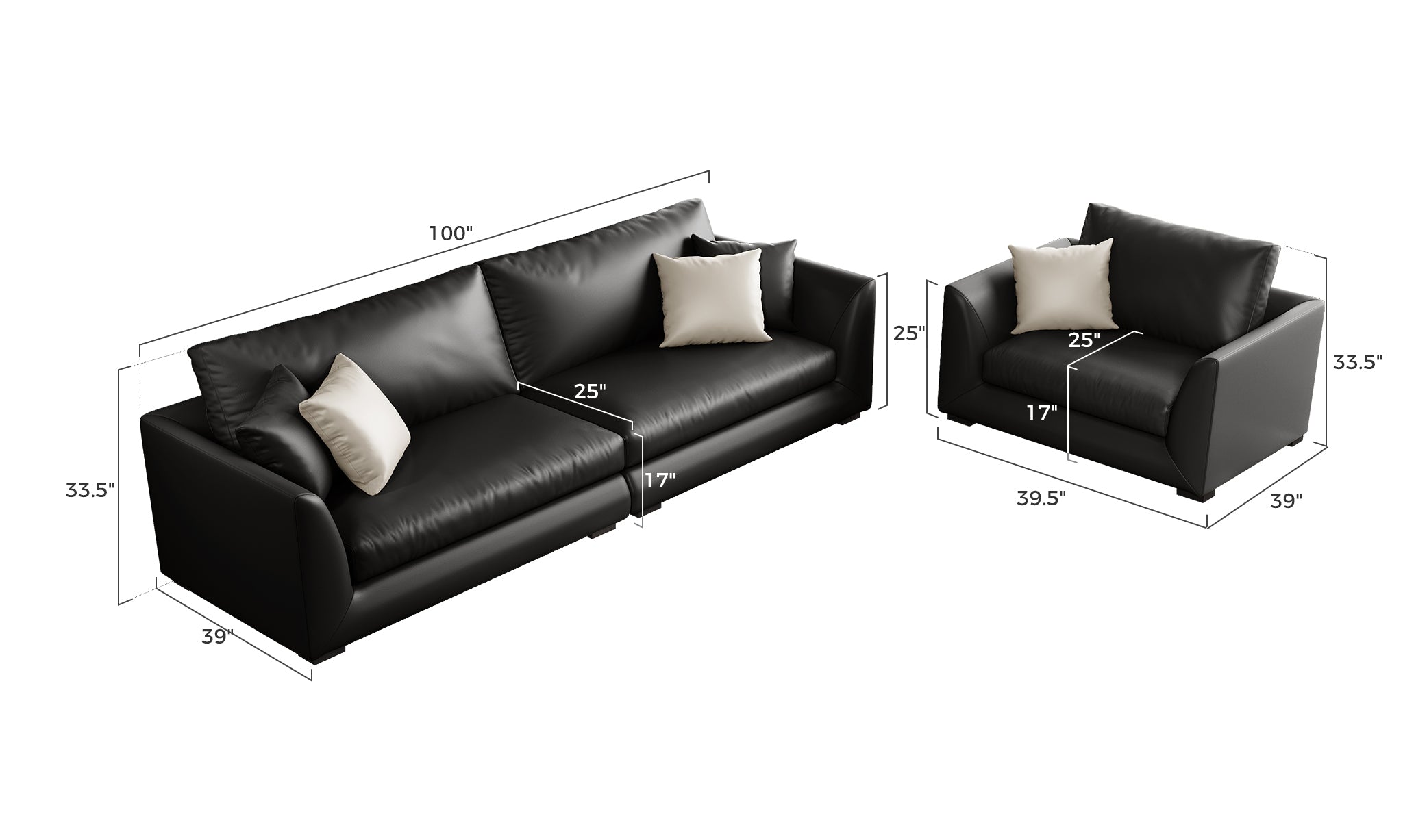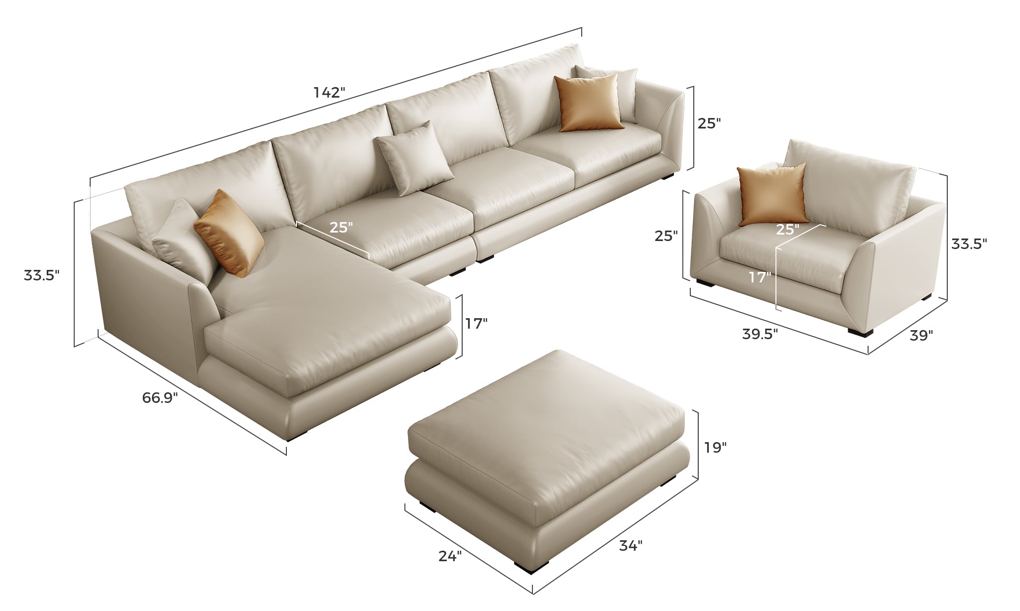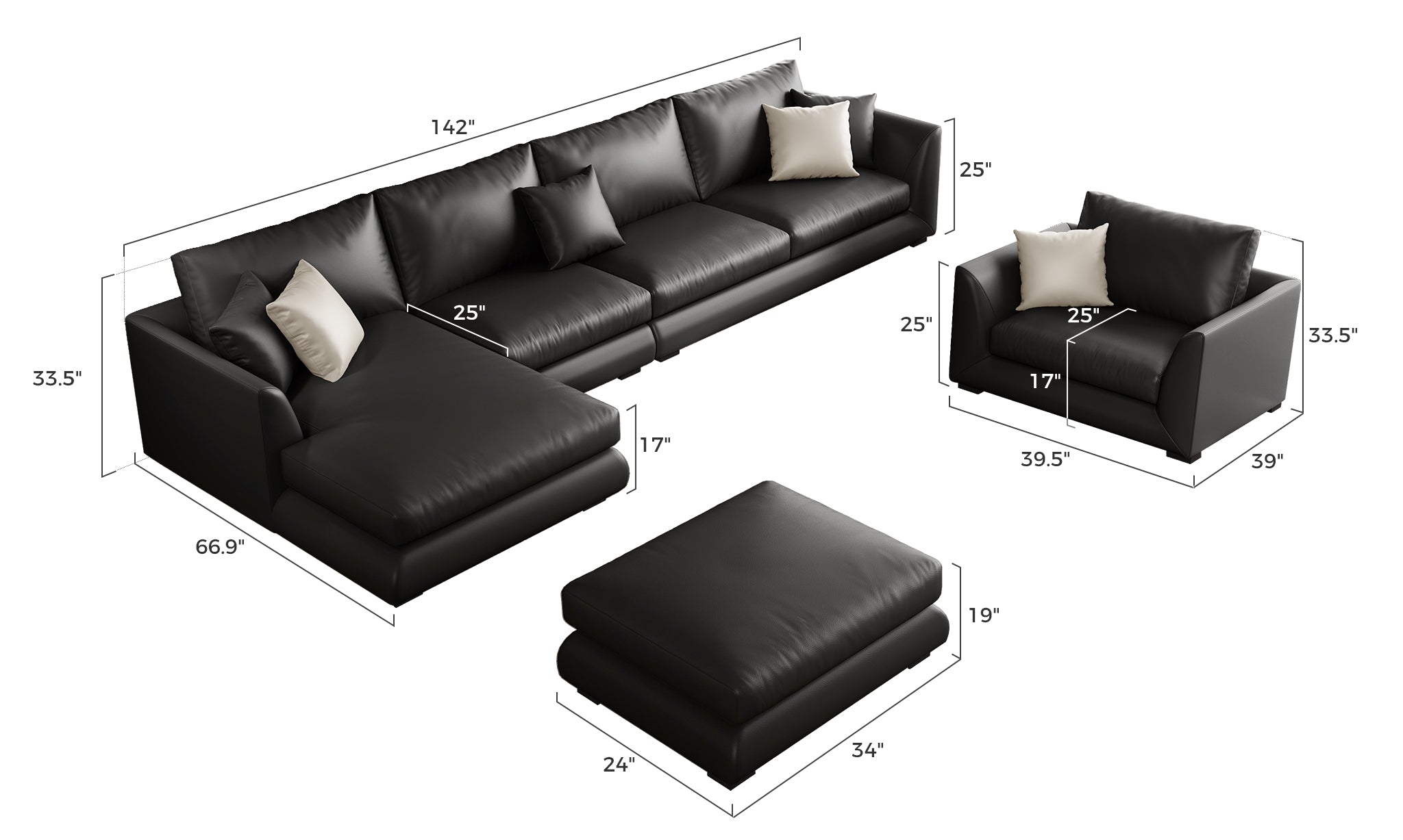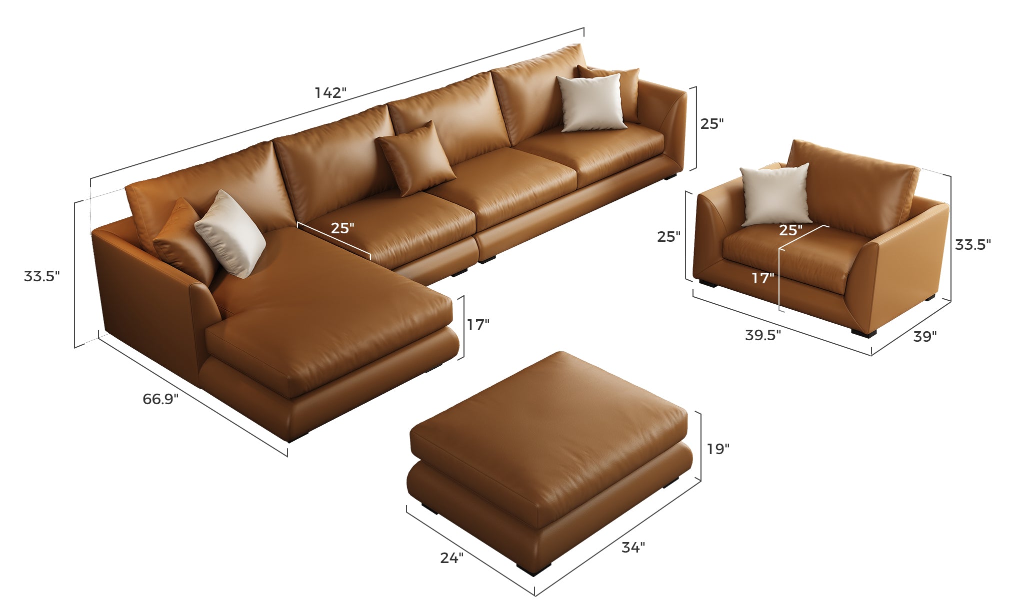 • Genuine Leather Feathers Sofa SetBrown / 4 Seater + Single Chair + Ottoman