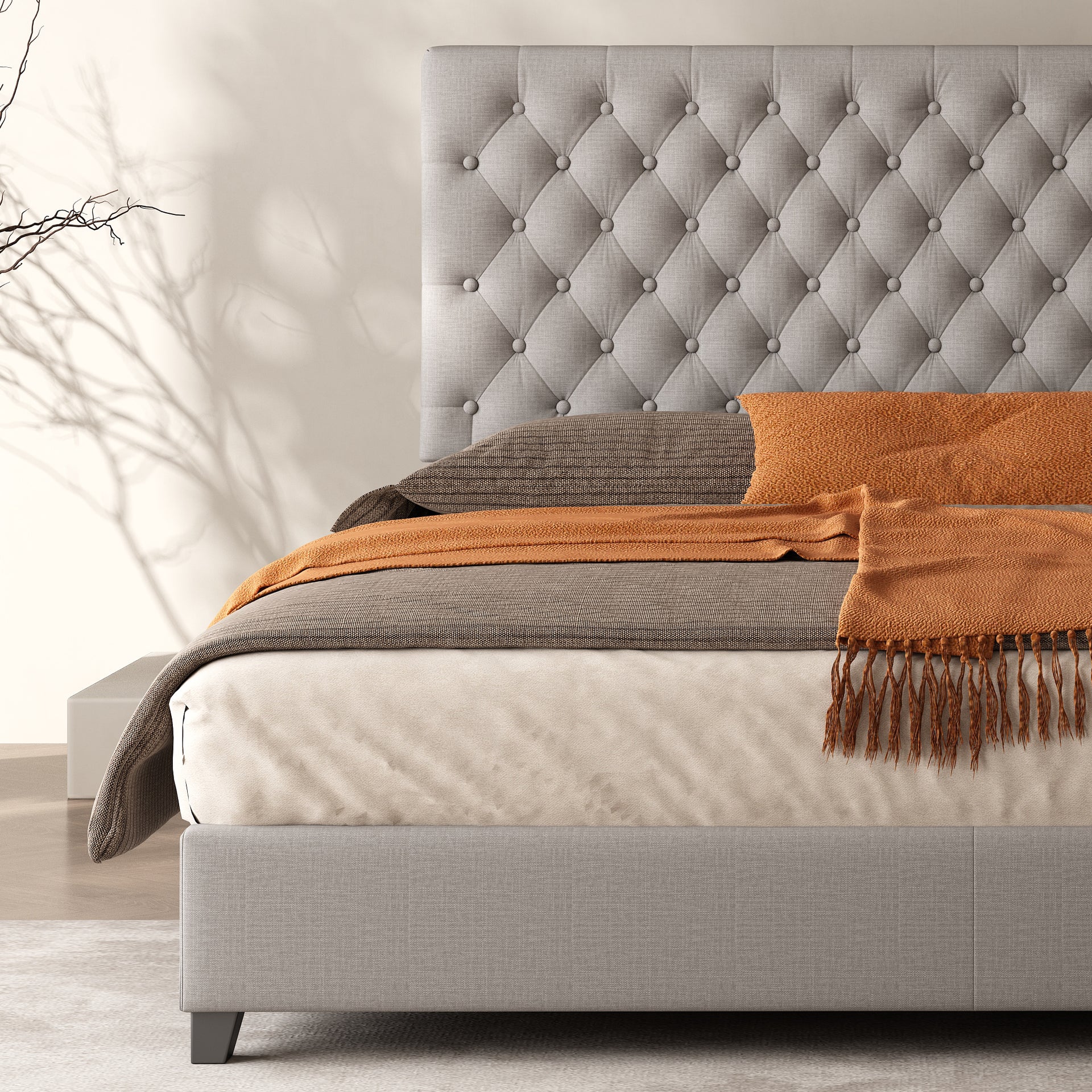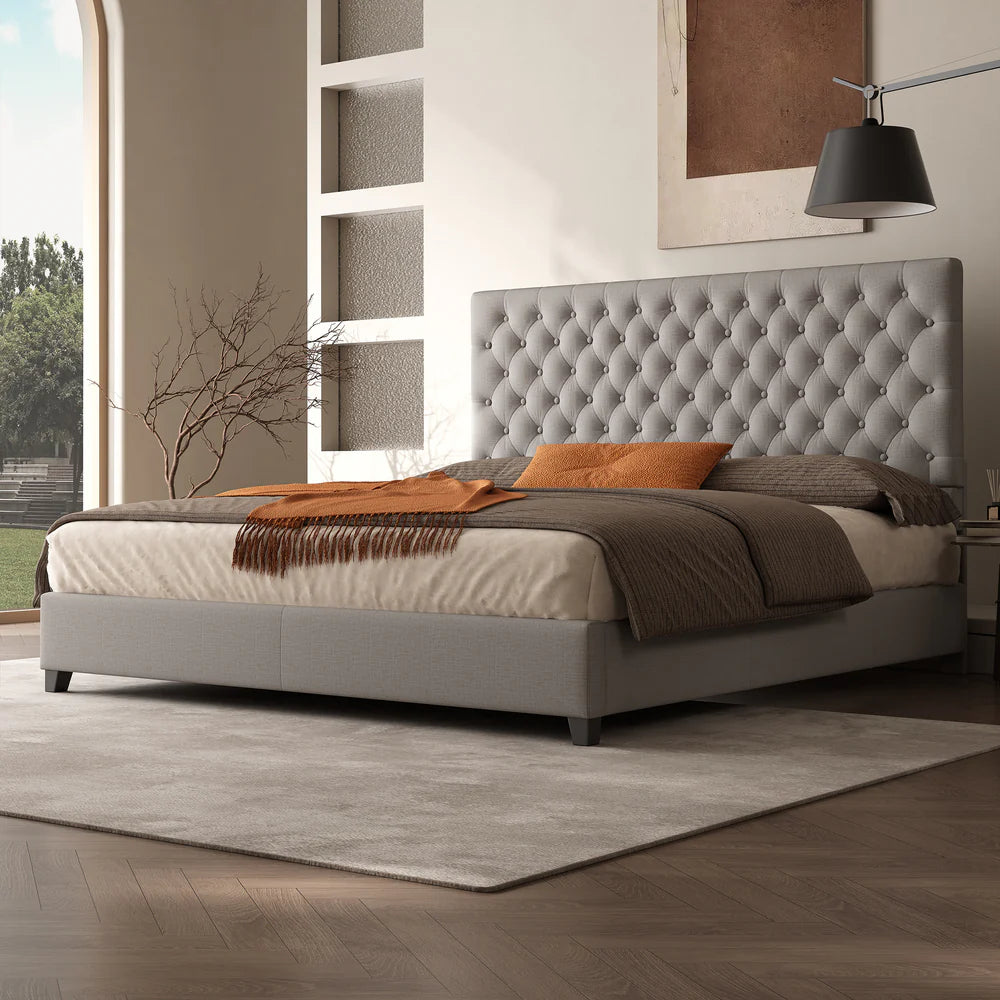 This platform bed sets the scene for a classic bedroom aesthetic we love. It's made from solid wood and upholstered in a neutral polyester fabric that goes with a variety of color schemes. The panel headboard strikes a rectangular silhouette and features a repeating diamond button-tufted design.