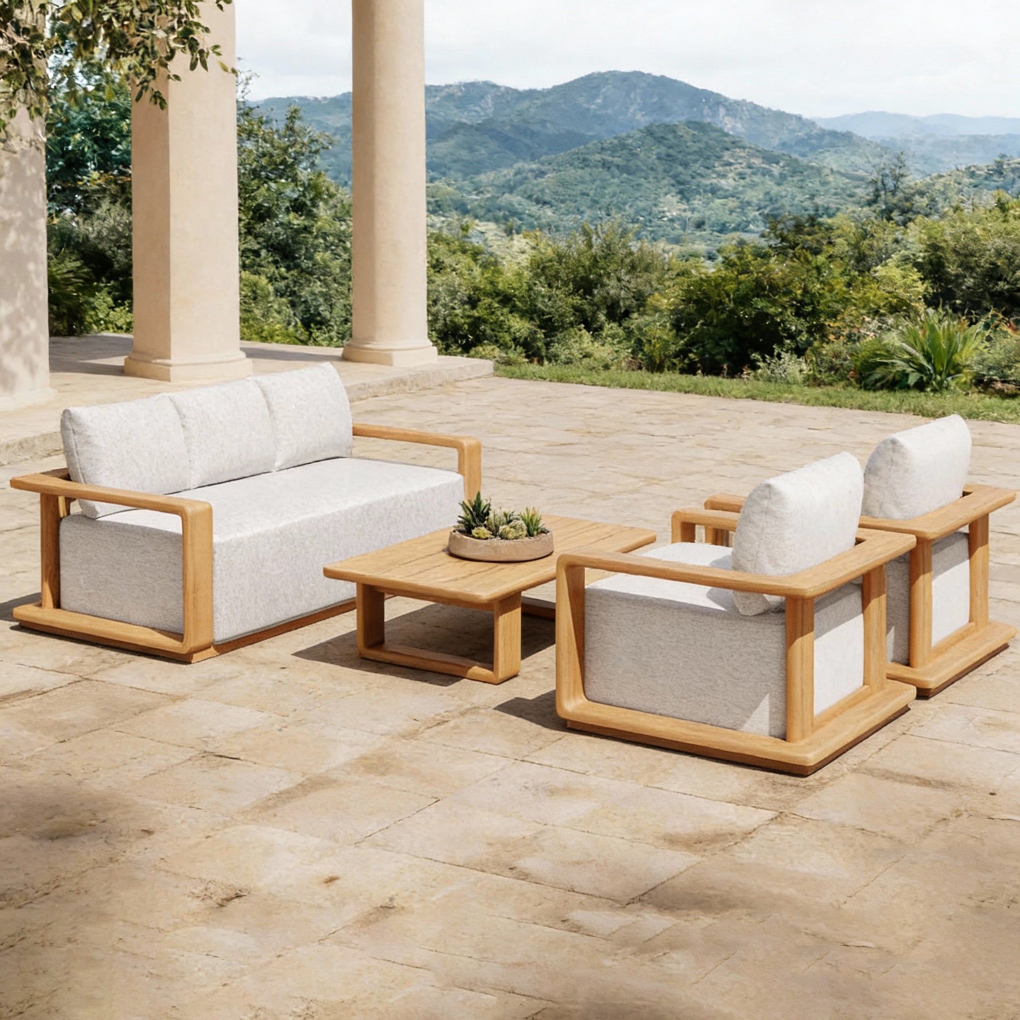 Designed for modern outdoor lifestyles, this table blends organic textures with understated elegance. The natural teak finish, combined with comfortable foam cushioning and weather-ready fabric, creates a welcoming space for long meals, conversations, and gatherings under open skies.