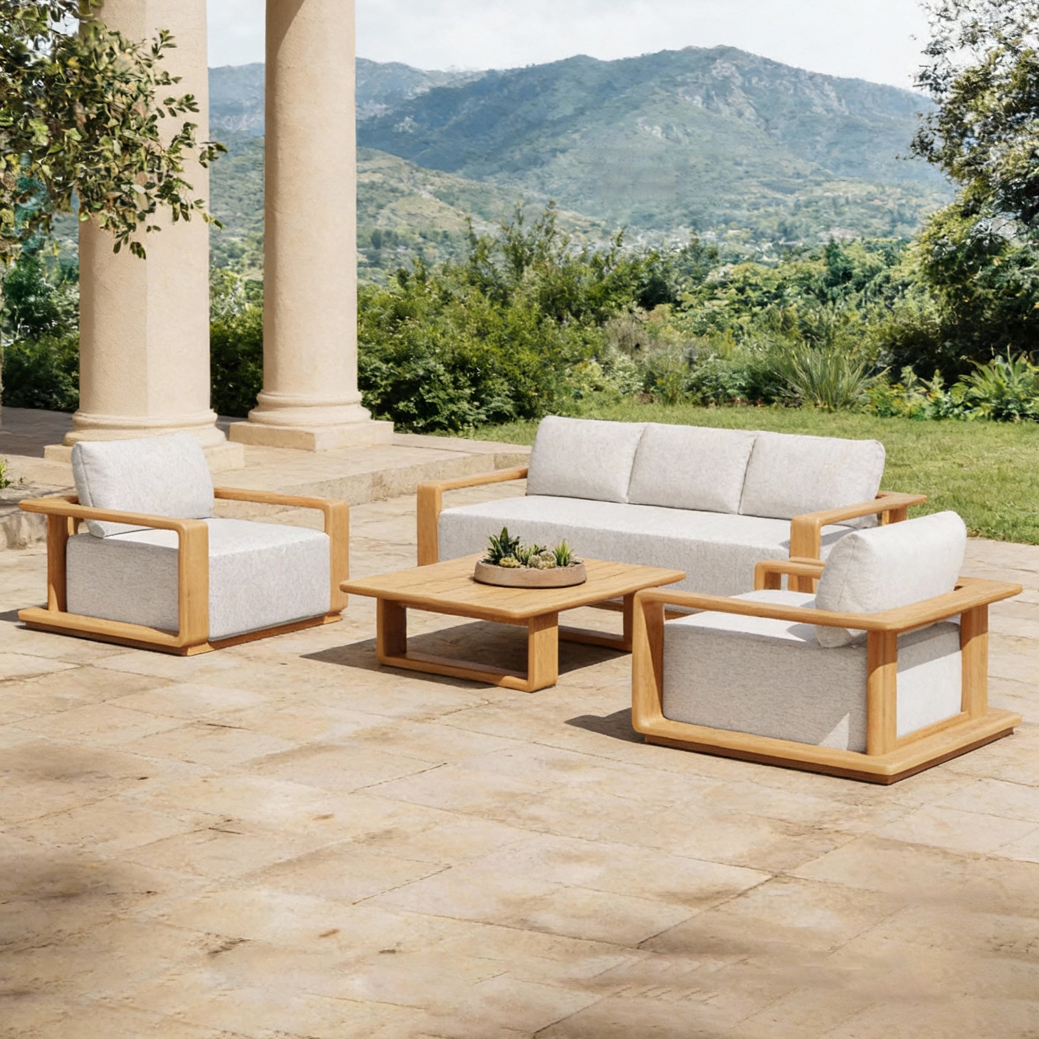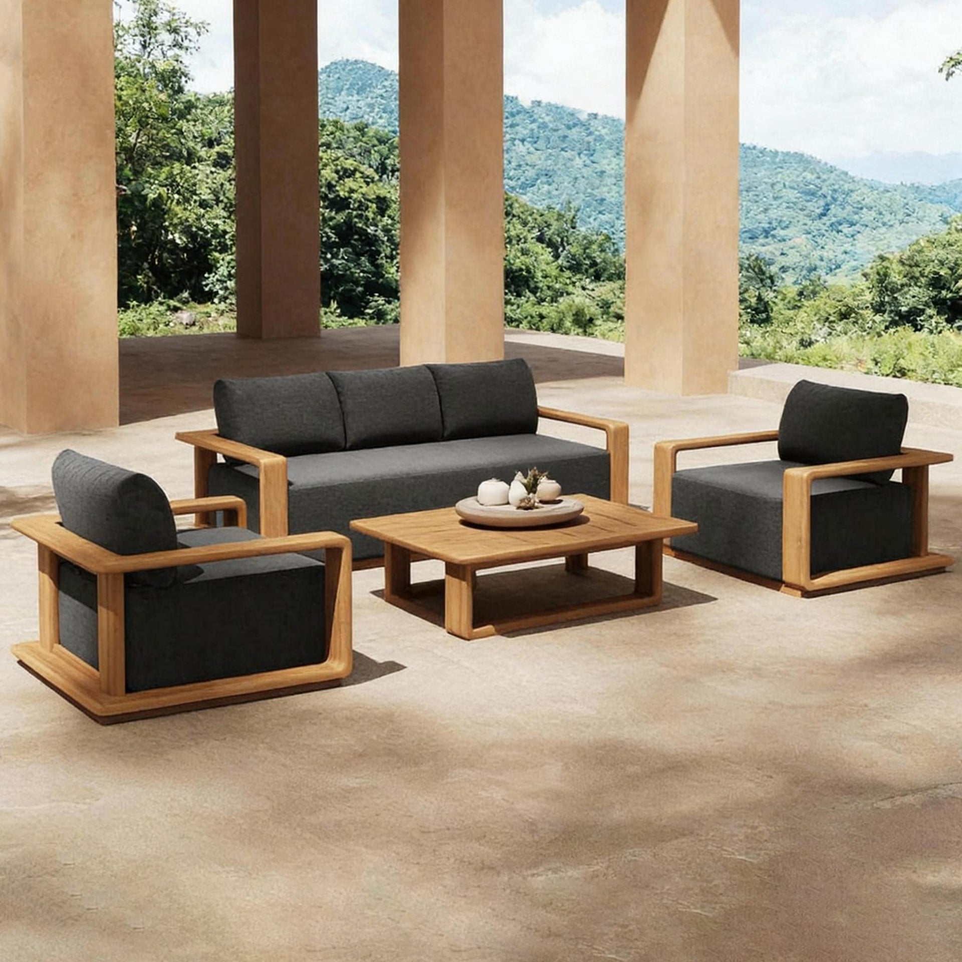 Designed for modern outdoor lifestyles, this table blends organic textures with understated elegance. The natural teak finish, combined with comfortable foam cushioning and weather-ready fabric, creates a welcoming space for long meals, conversations, and gatherings under open skies.