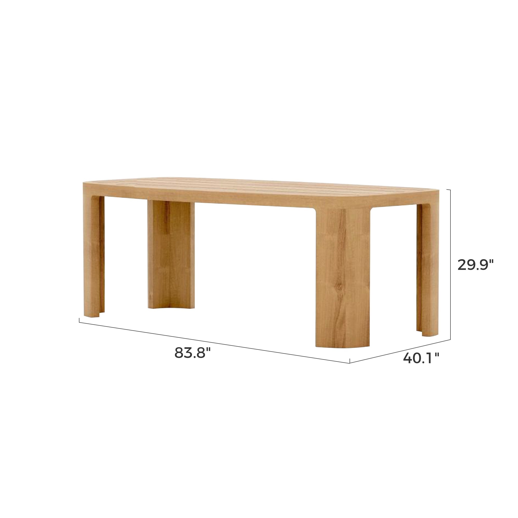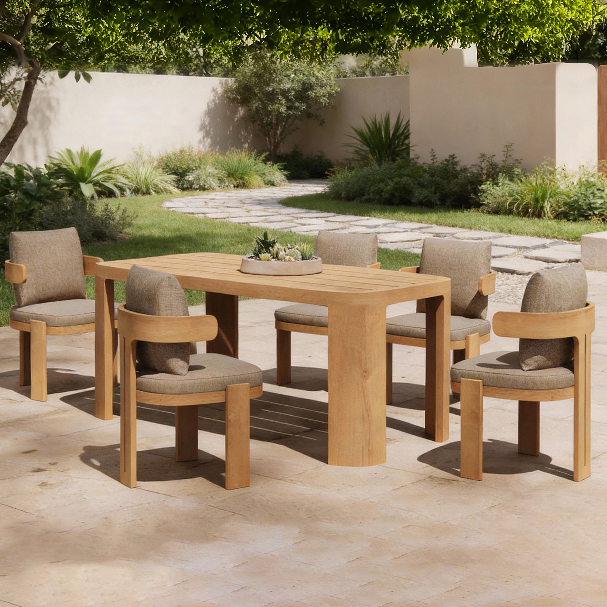 Defined by clean lines and natural textures, this outdoor dining design offers a refined yet relaxed presence. The balance of teak wood, supportive cushioning, and durable outdoor fabric creates an inviting setting for both private patios and commercial terraces.