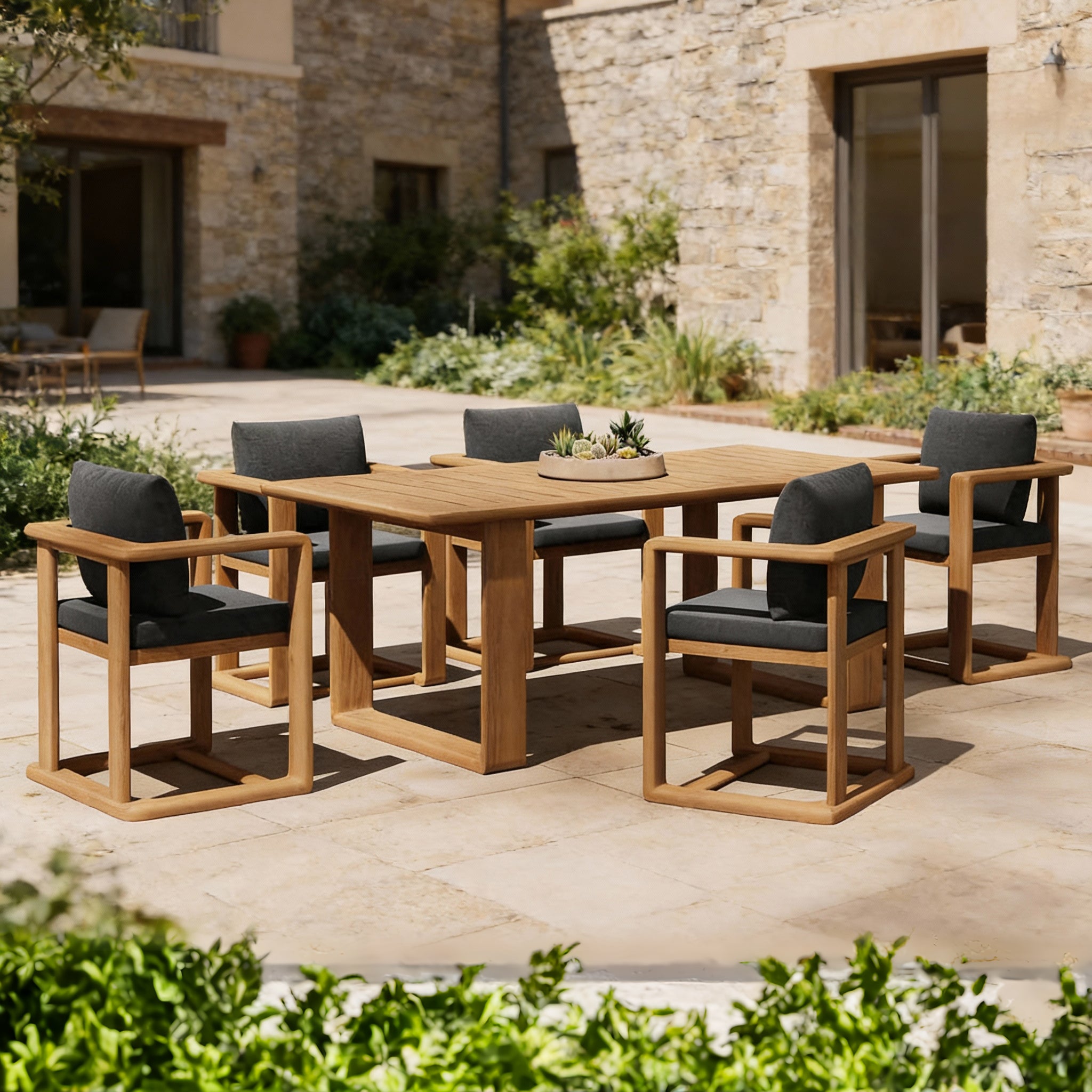Designed with attention to form and material balance, this outdoor dining piece elevates open-air spaces with quiet confidence. Teak textures, resilient foam cushioning, and outdoor fabric work together for both everyday use and hospitality settings.