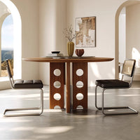 With its generous round shape, this table encourages conversation and connection, ideal for cozy family dinners or stylish entertaining.Complementing the table are chairs designed for both comfort and style, featuring cushioned seats with soft PU leather upholstery, high-resilience sponge filling, and a sleek stainless steel frame for lasting support.