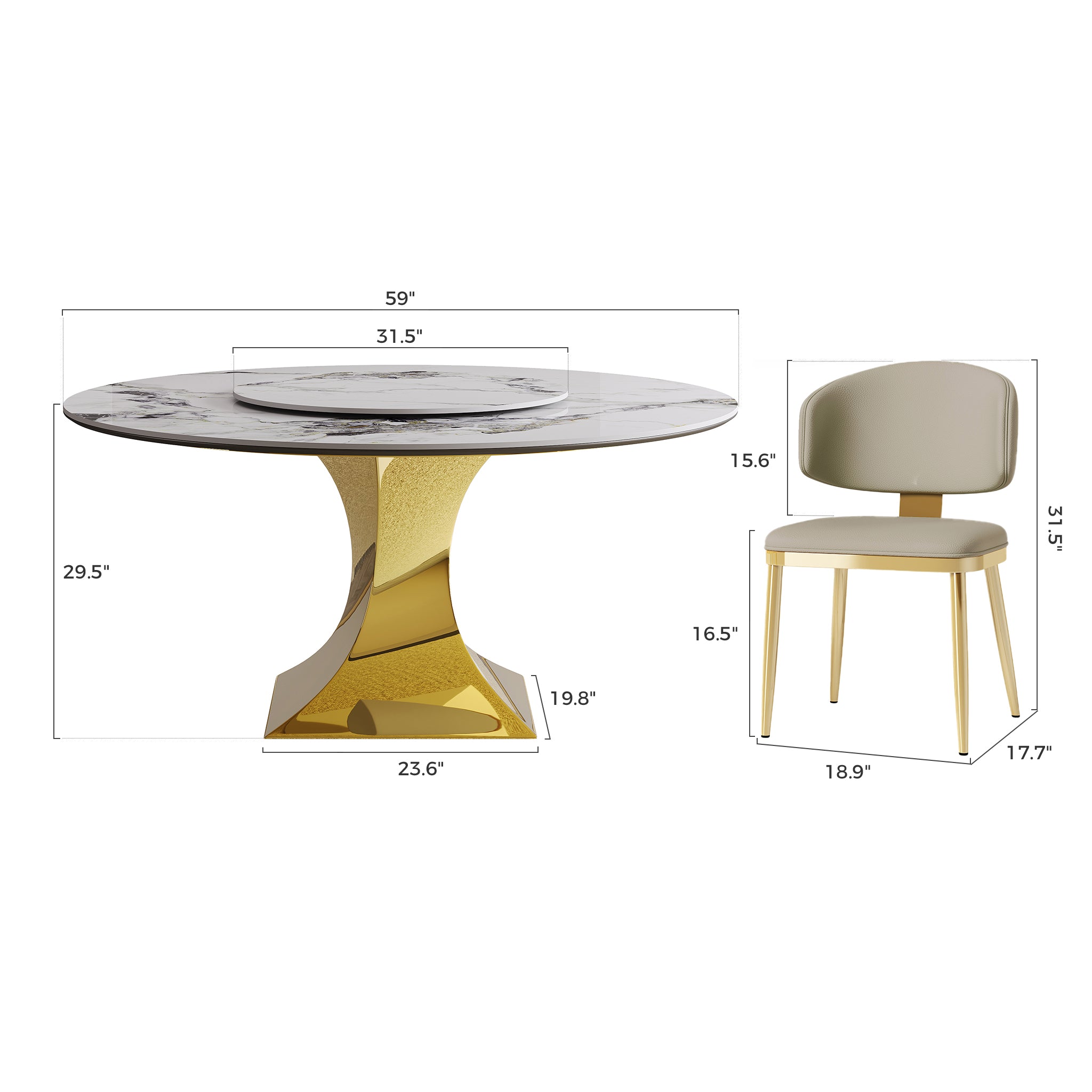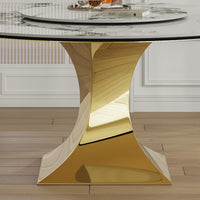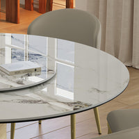 Modern Minimalist Round Dining Table for 6-8, White Sintered Stone Top with Stainless Steel Base and Lazy Susan