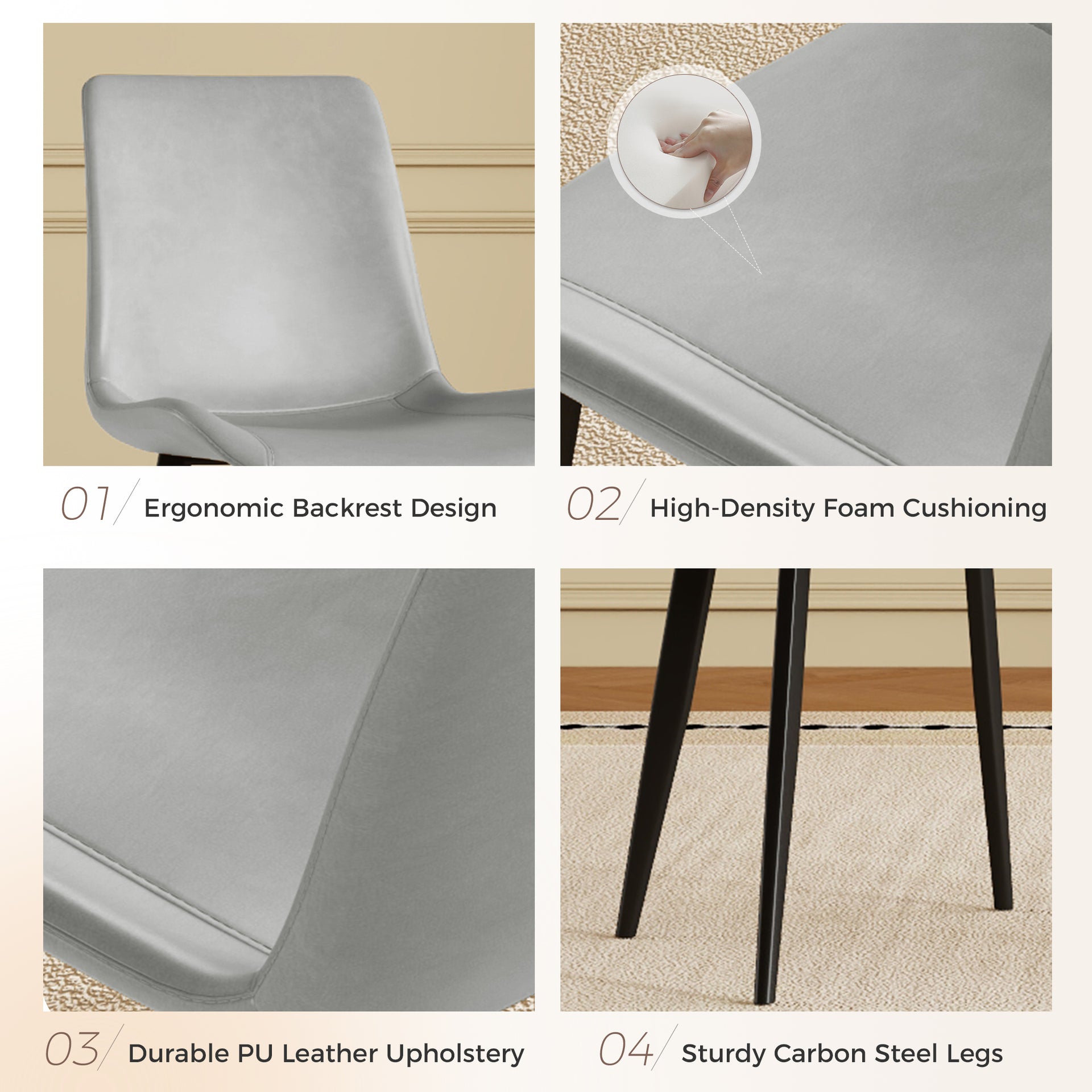Enjoy all-day comfort with our modern dining chairs featuring an ergonomic backrest and soft high-density foam cushion. Sleek PU leather resists spills and stains, while sturdy carbon steel legs support up to 250 lbs. Stylish, durable, and effortlessly comfortable—perfect for any home or gathering.