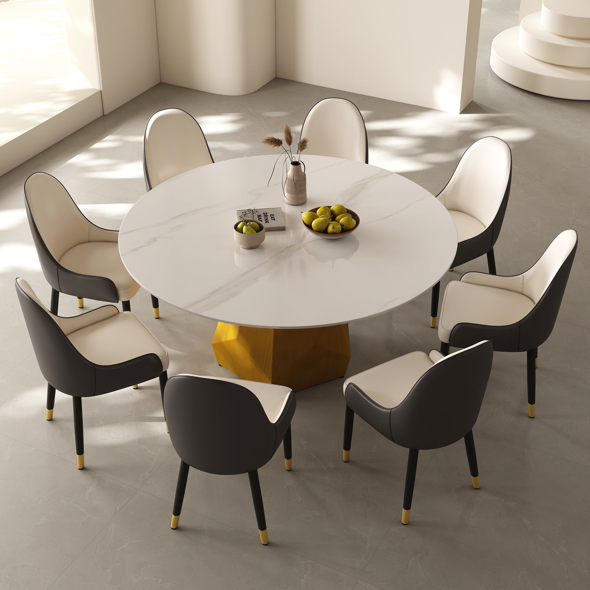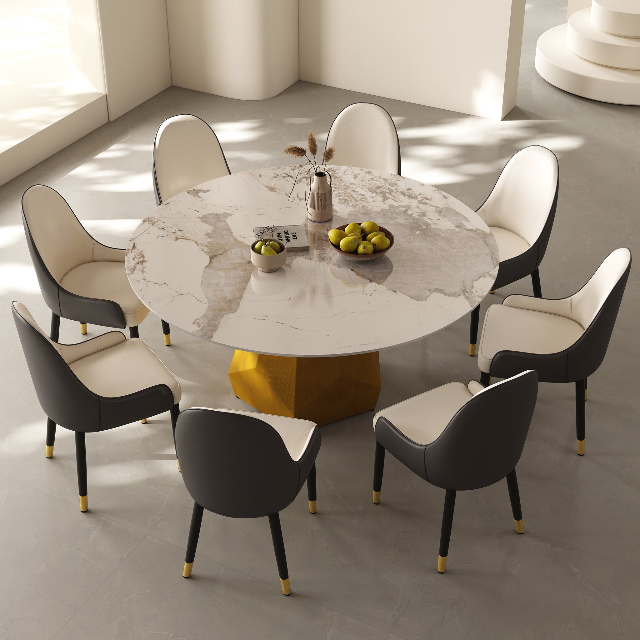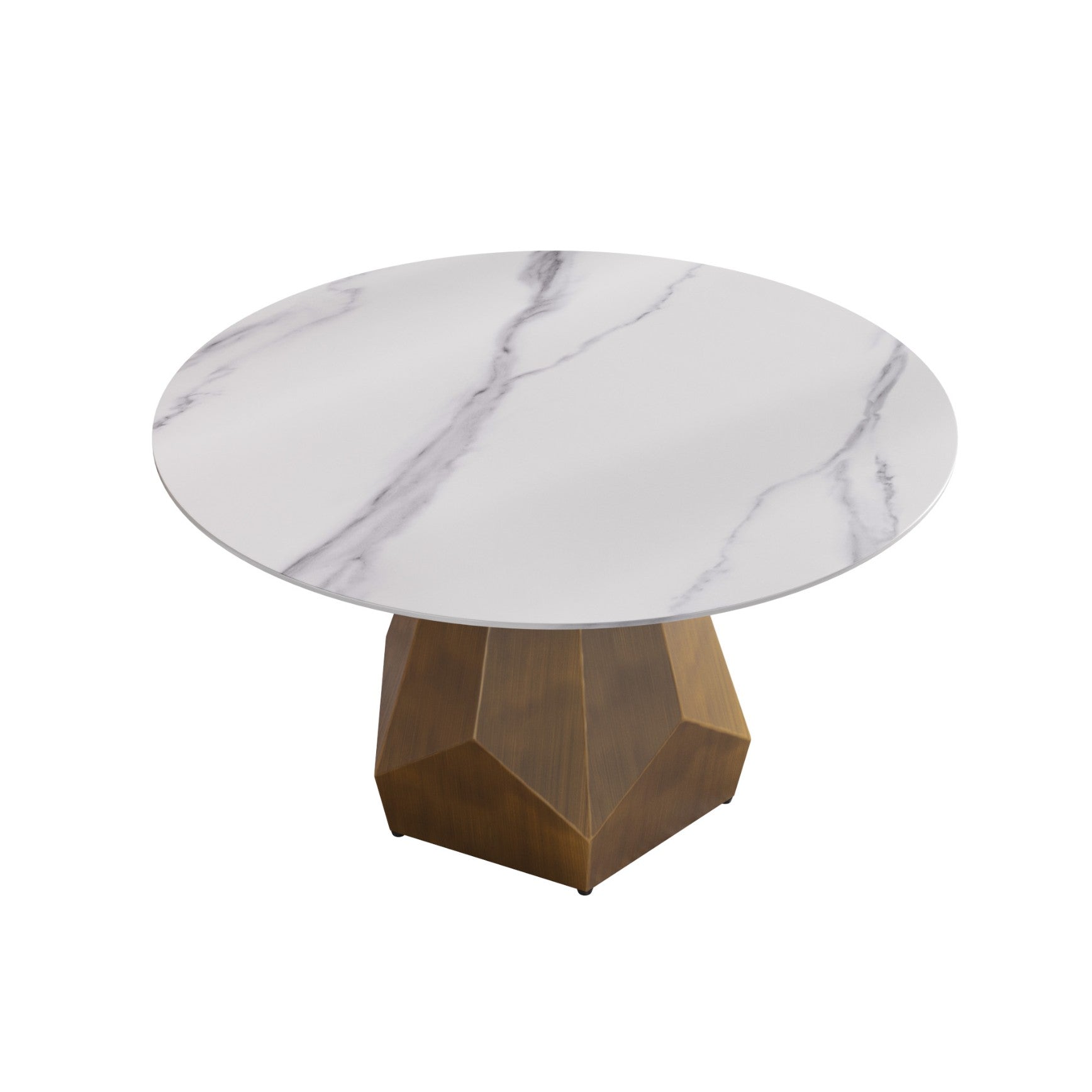 Modern Round Dining Table – White Sintered Stone Top, Bronze Base, Seats 6-8