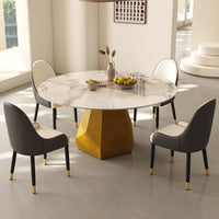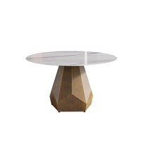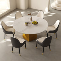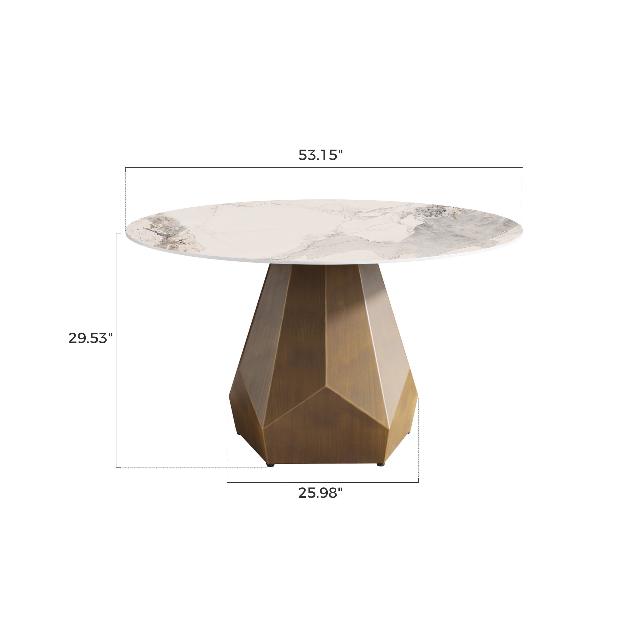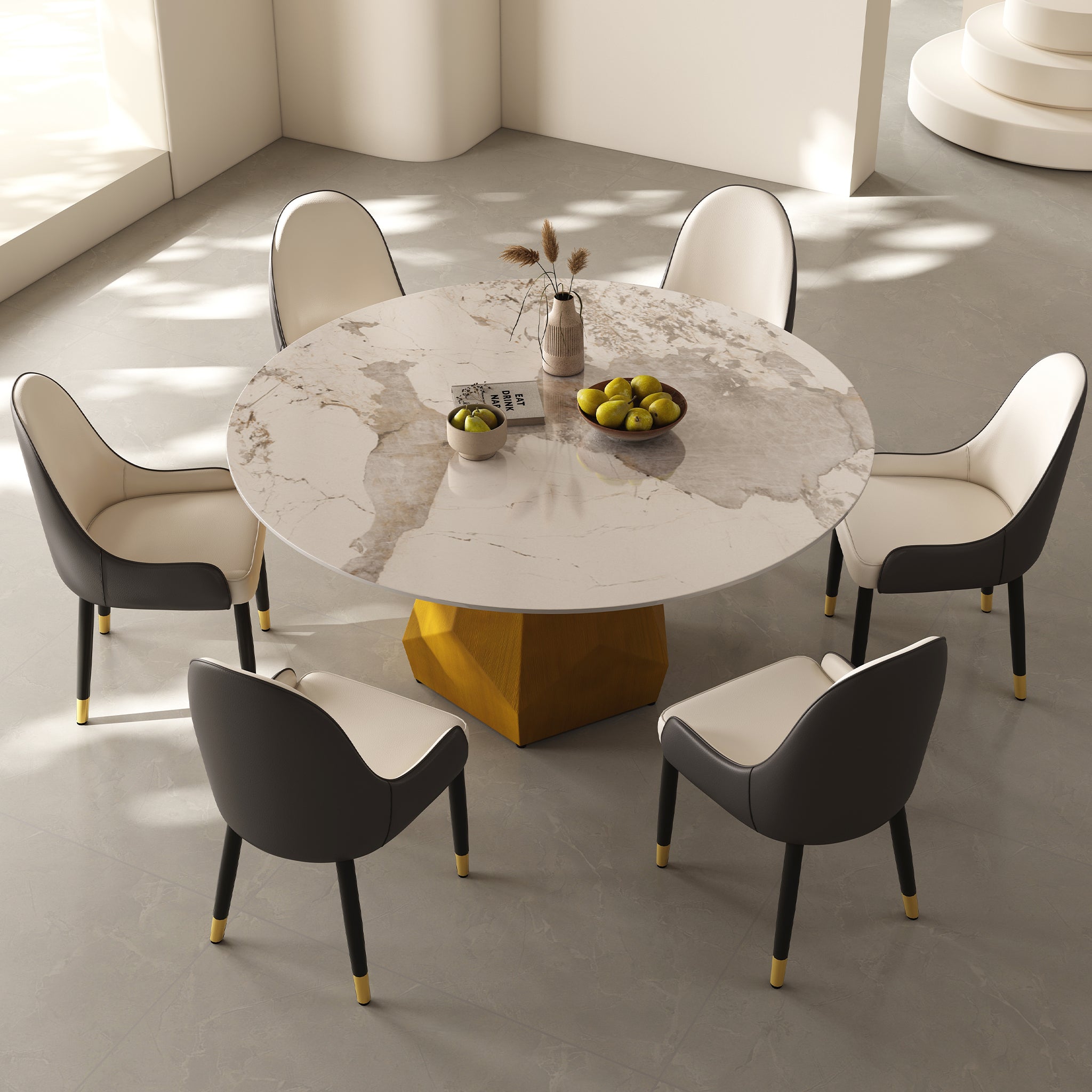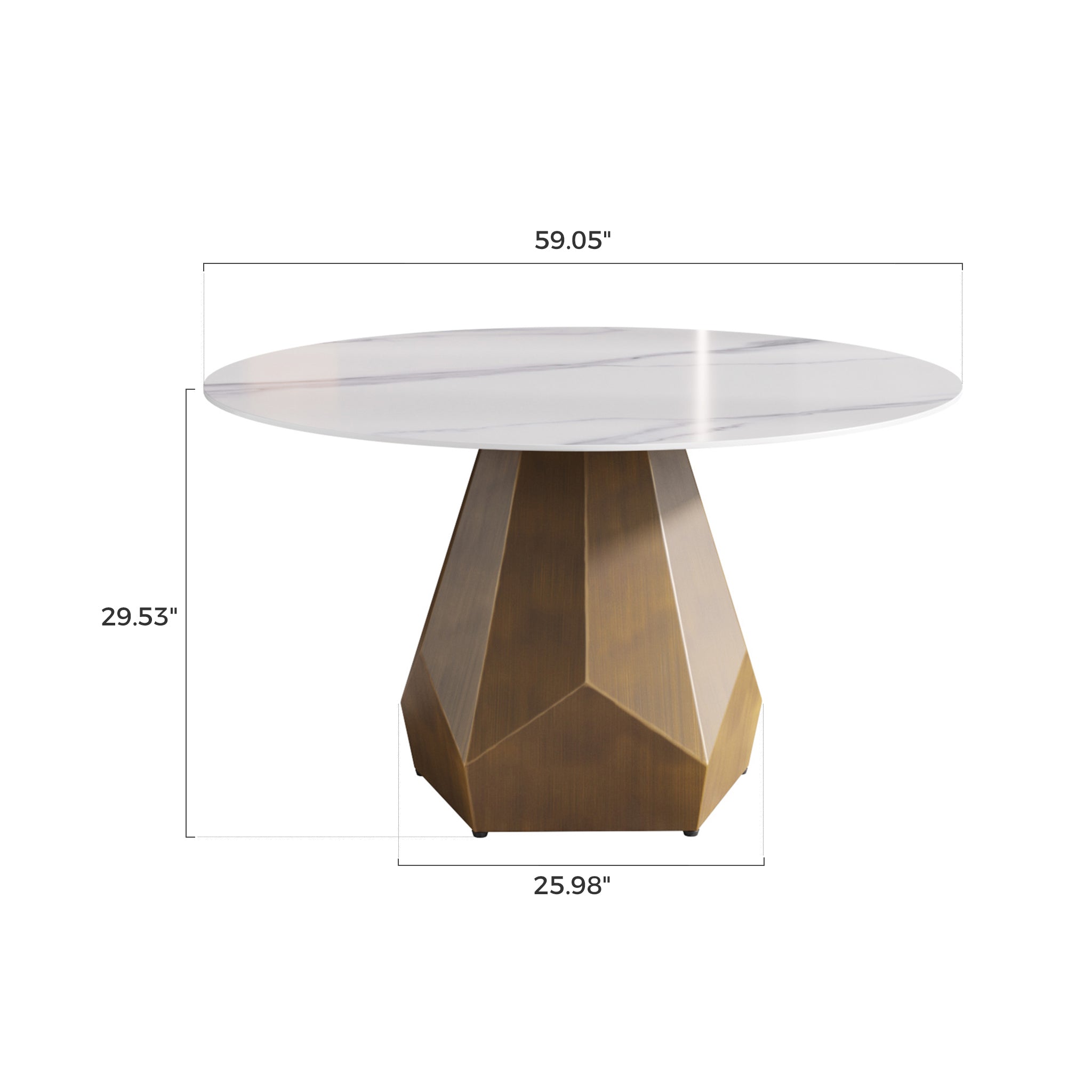Modern Round Dining Table – White Sintered Stone Top, Bronze Base, Seats 6-8