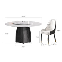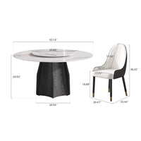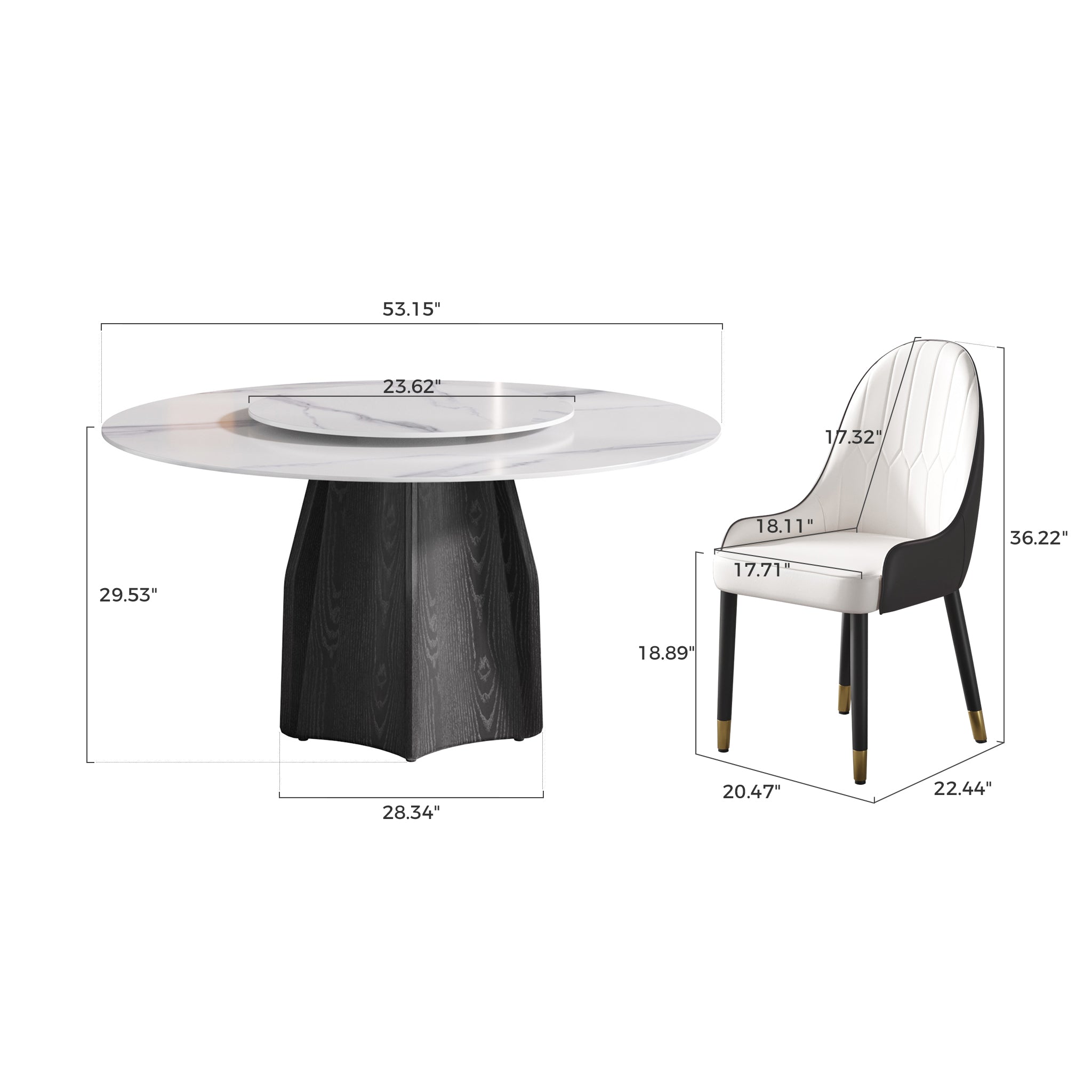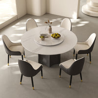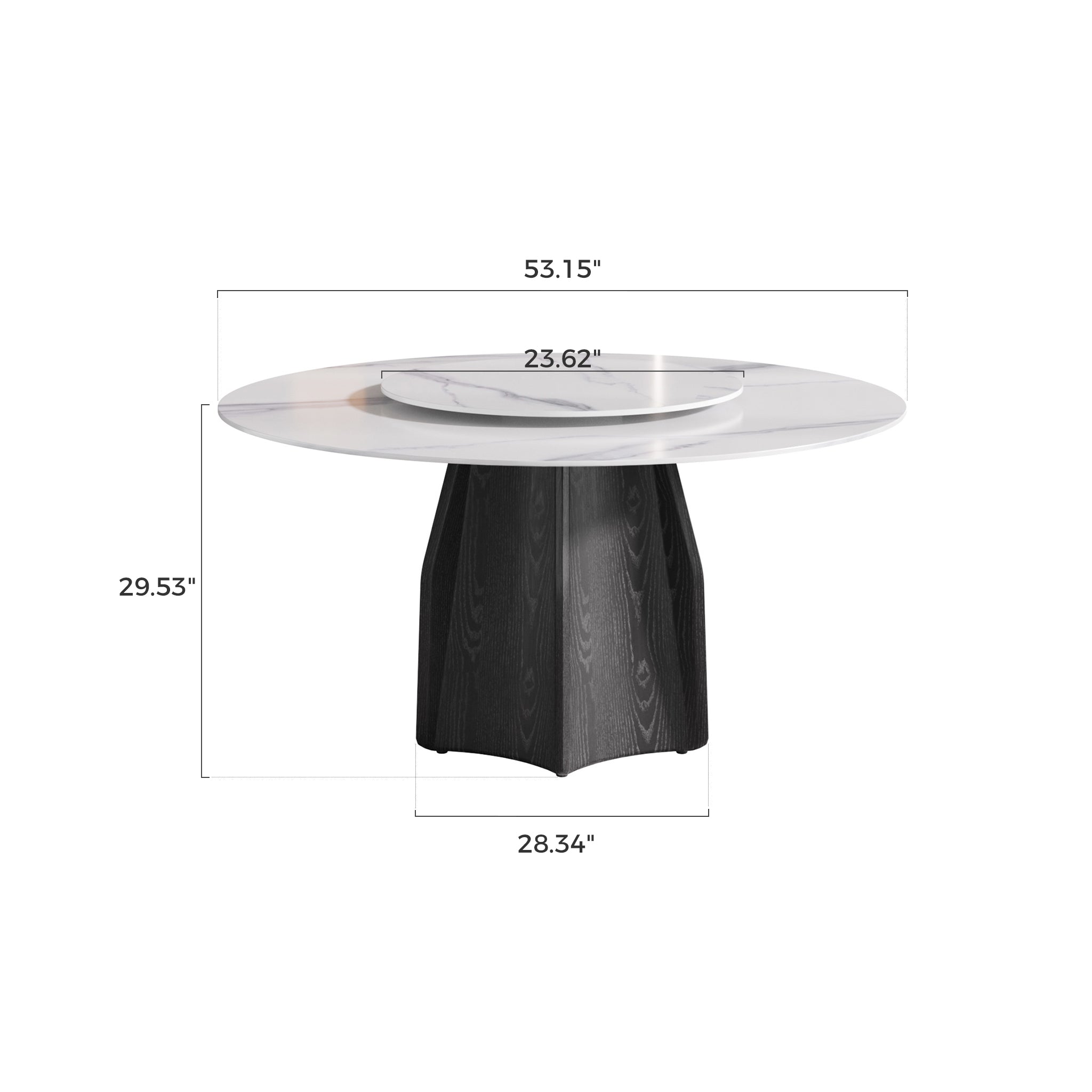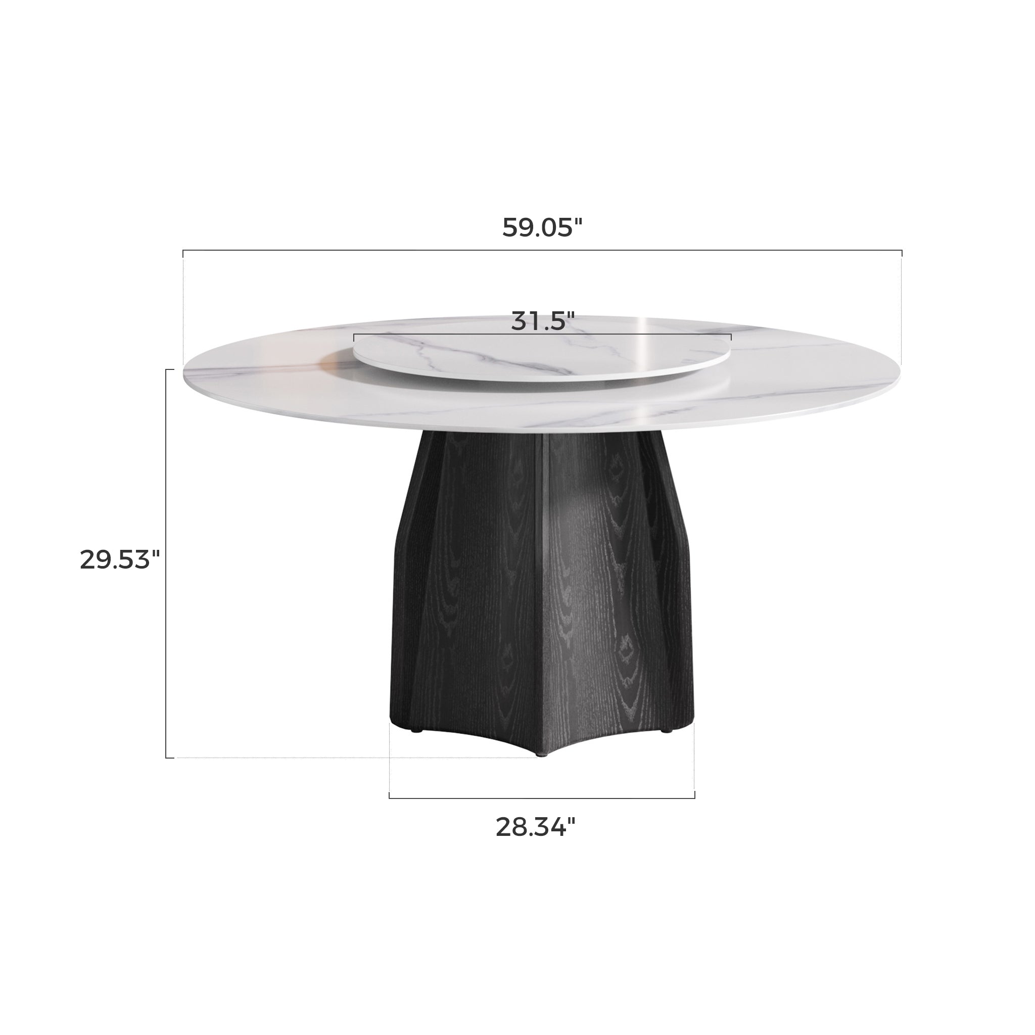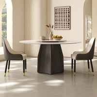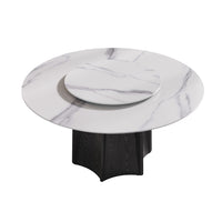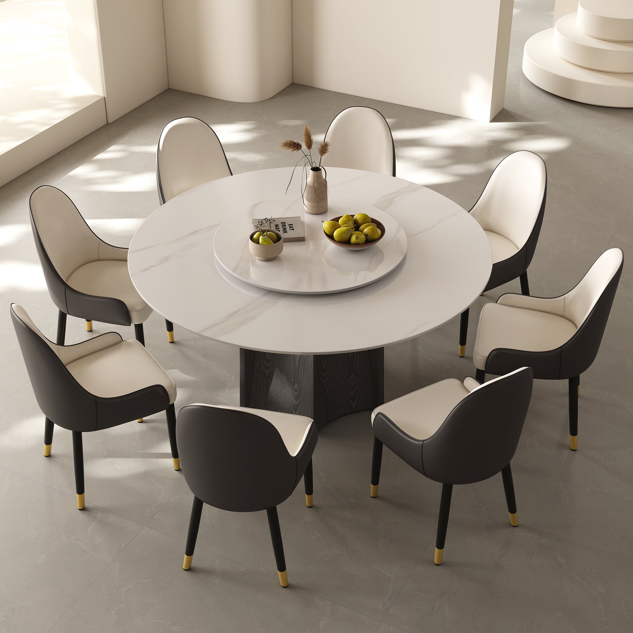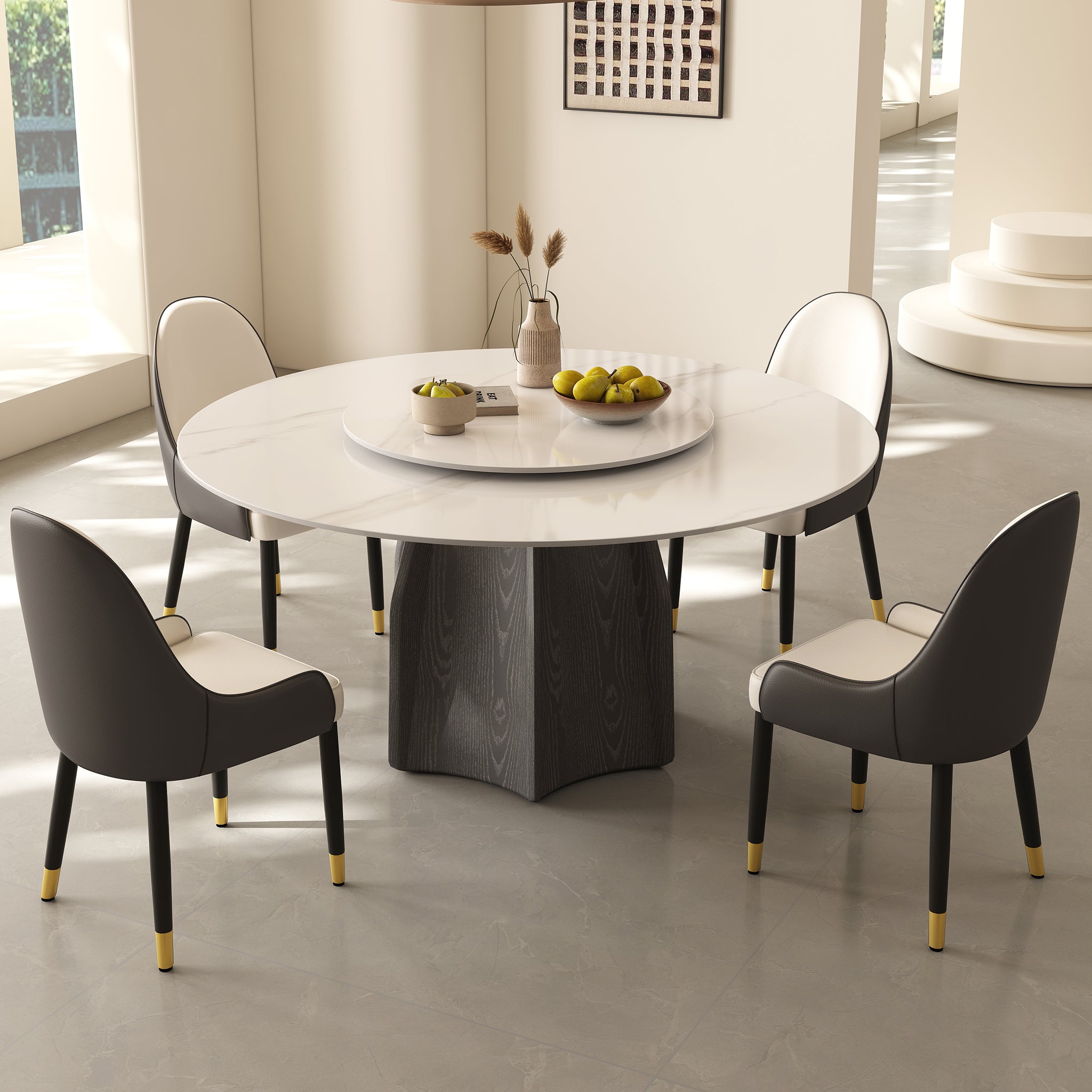 Modern Round White Stone Dining Table – Black Textured Wood Base, Seats 6