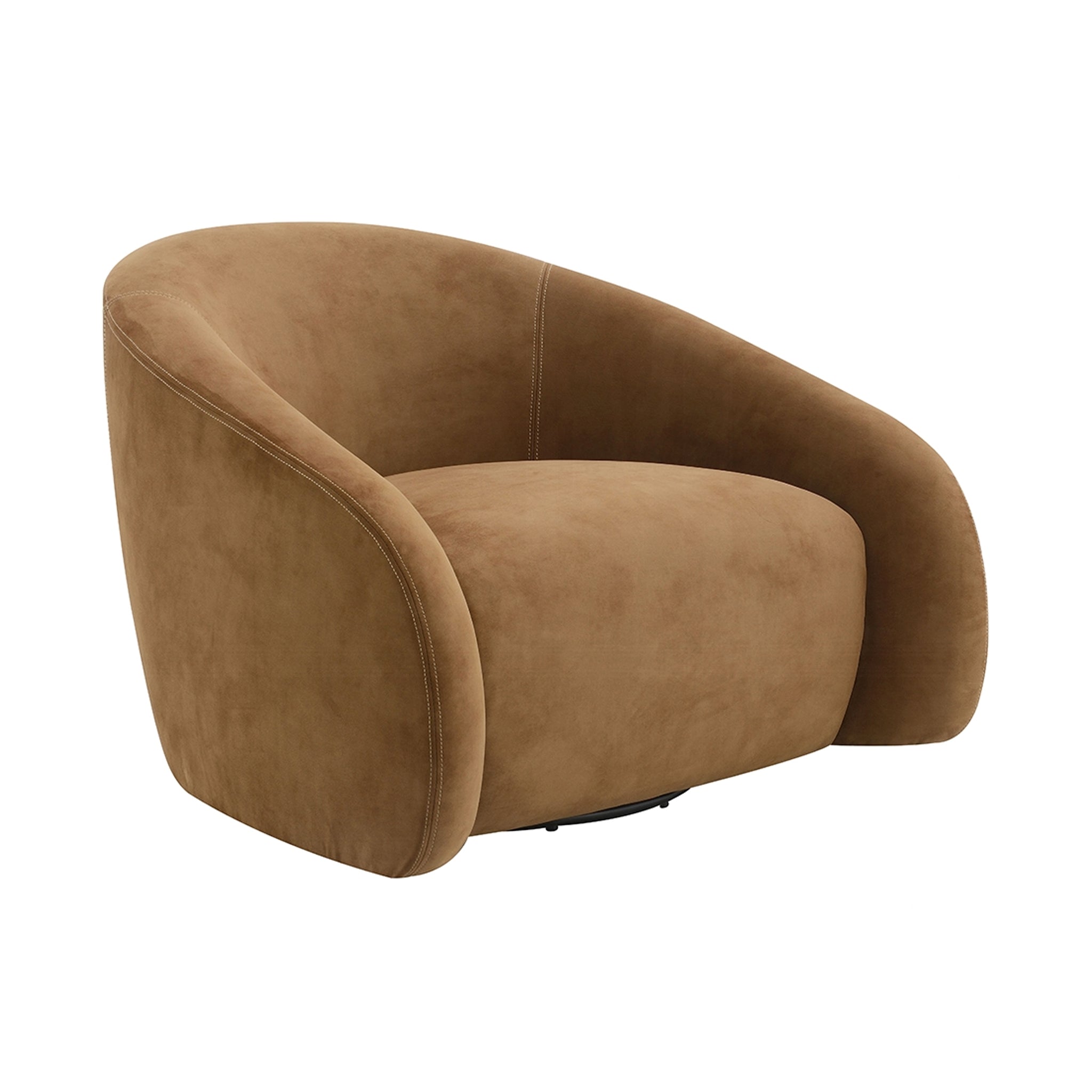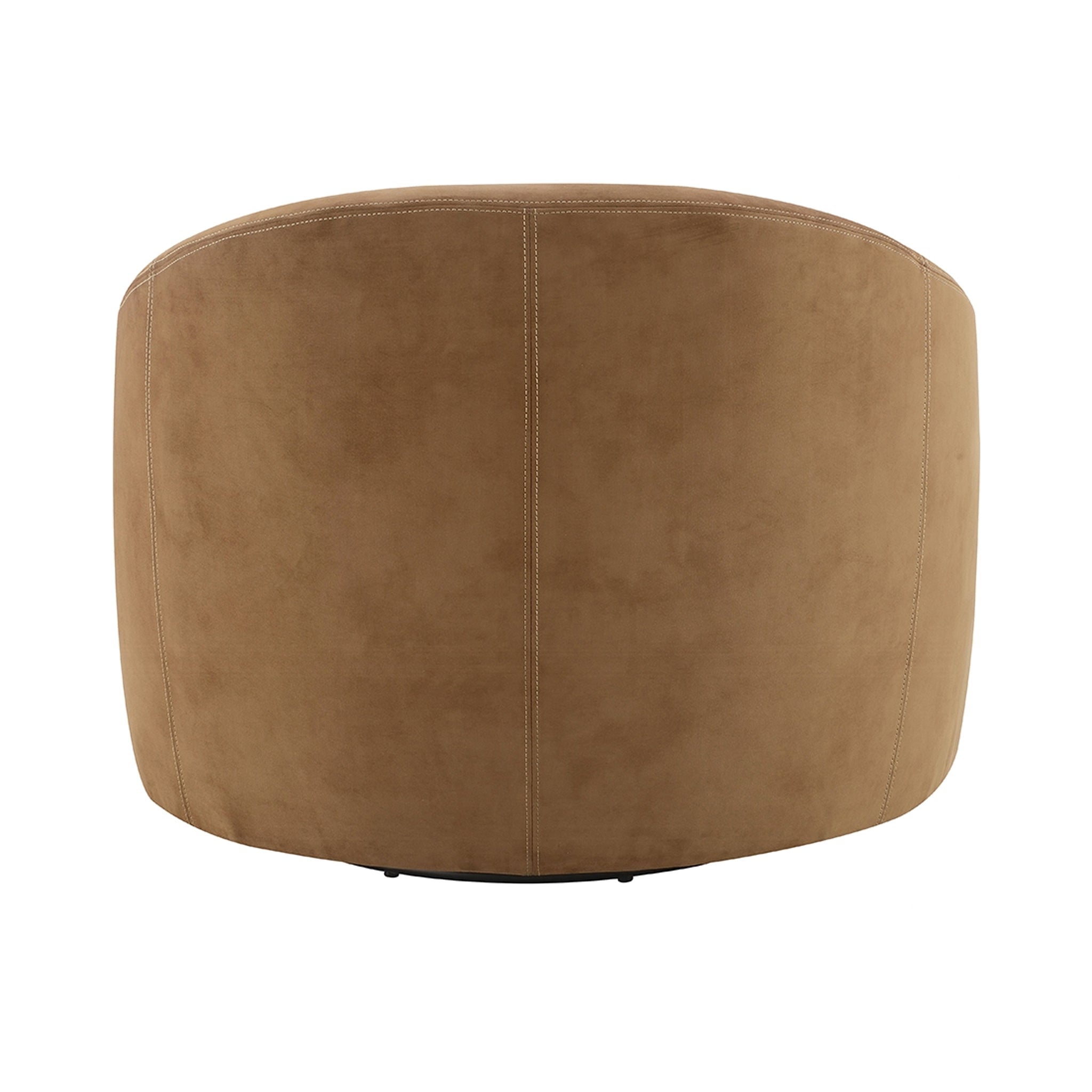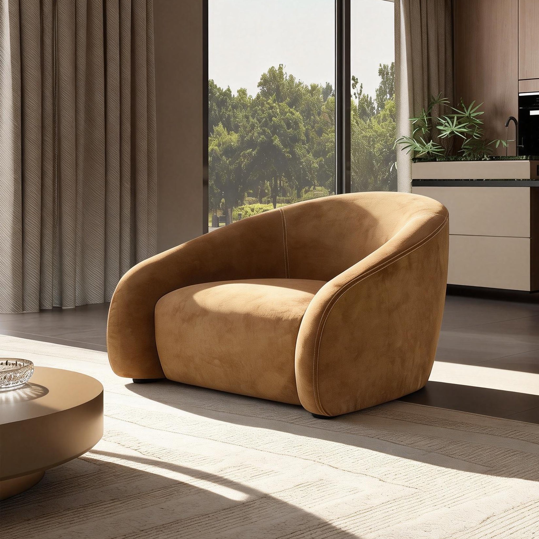 Rich chocolate suede upholstery with oak accents adds warmth and sophistication to any living room, bedroom, or reading nook.