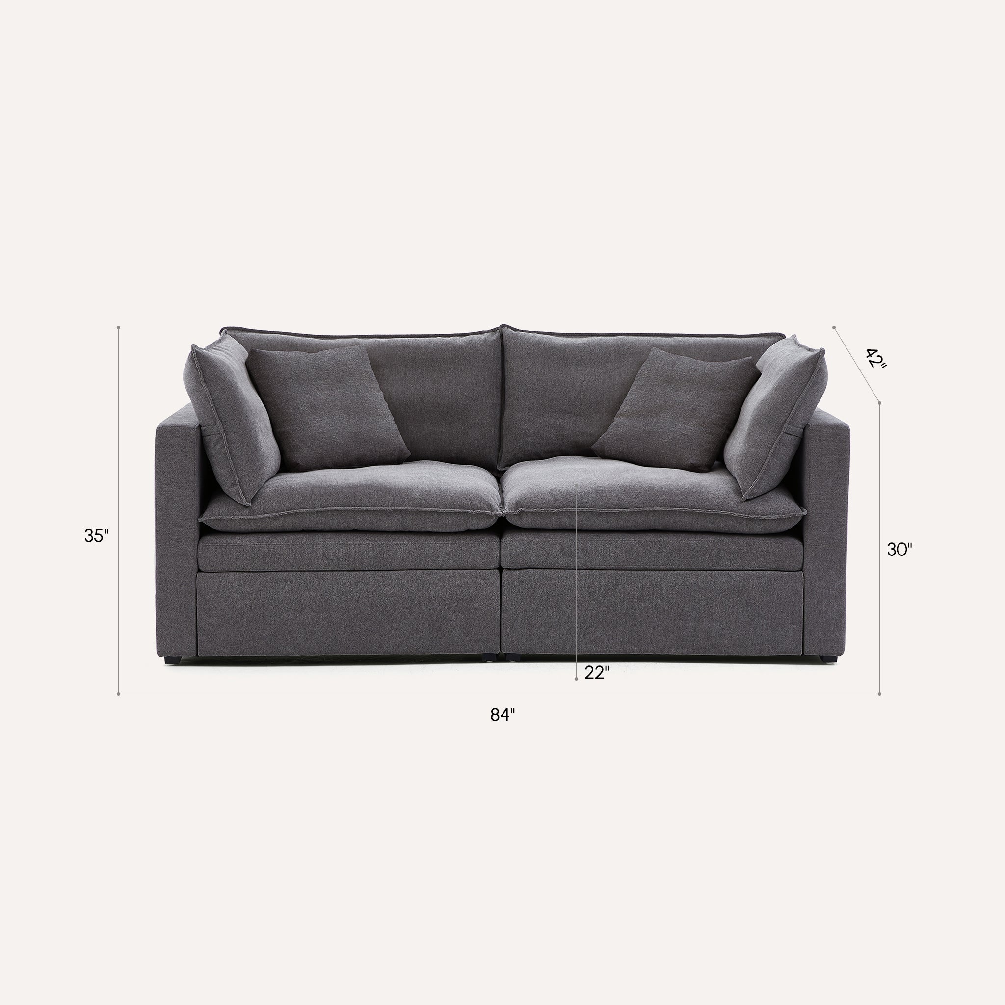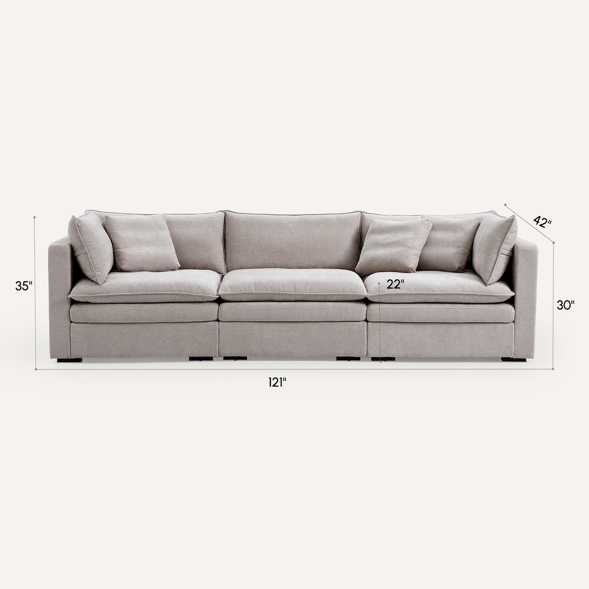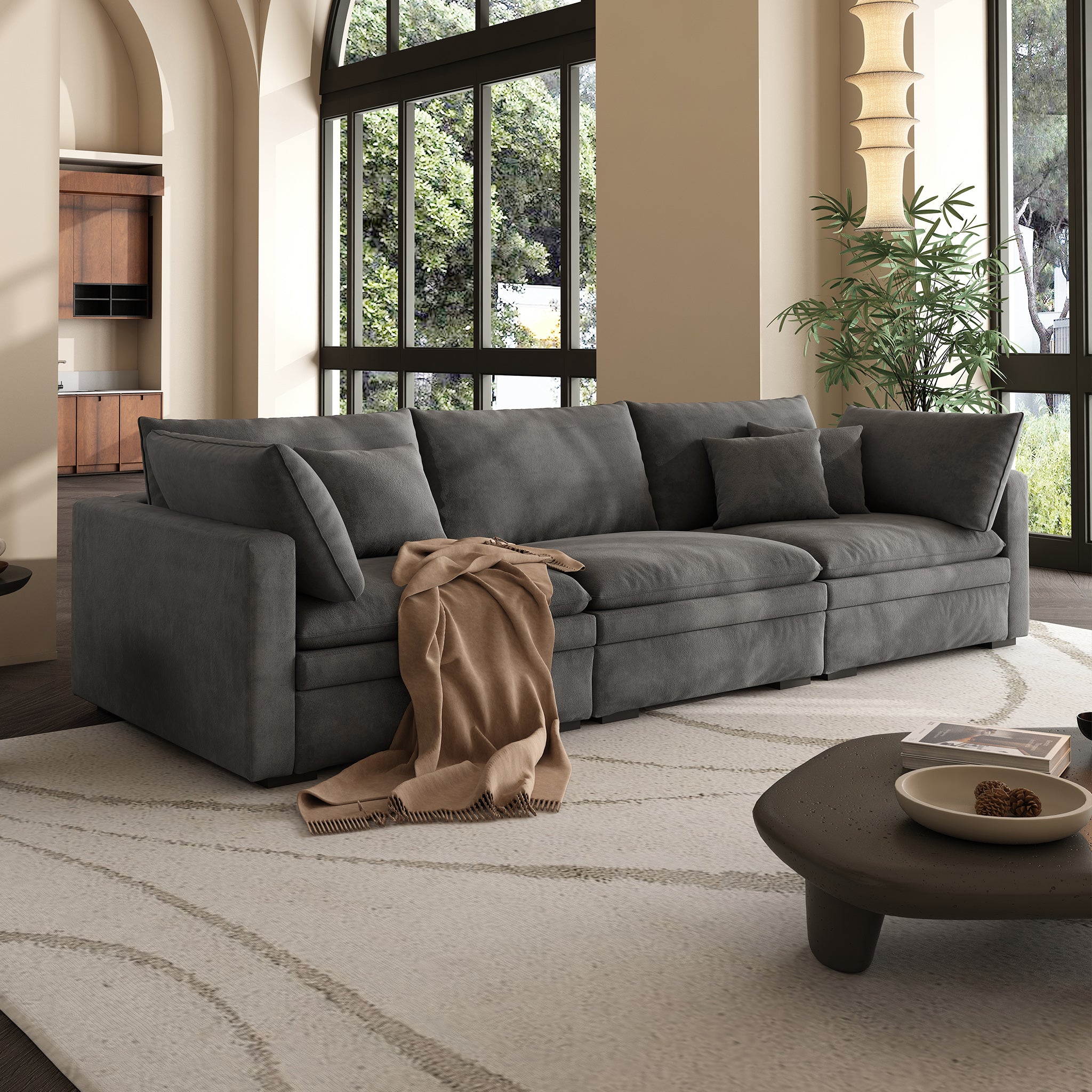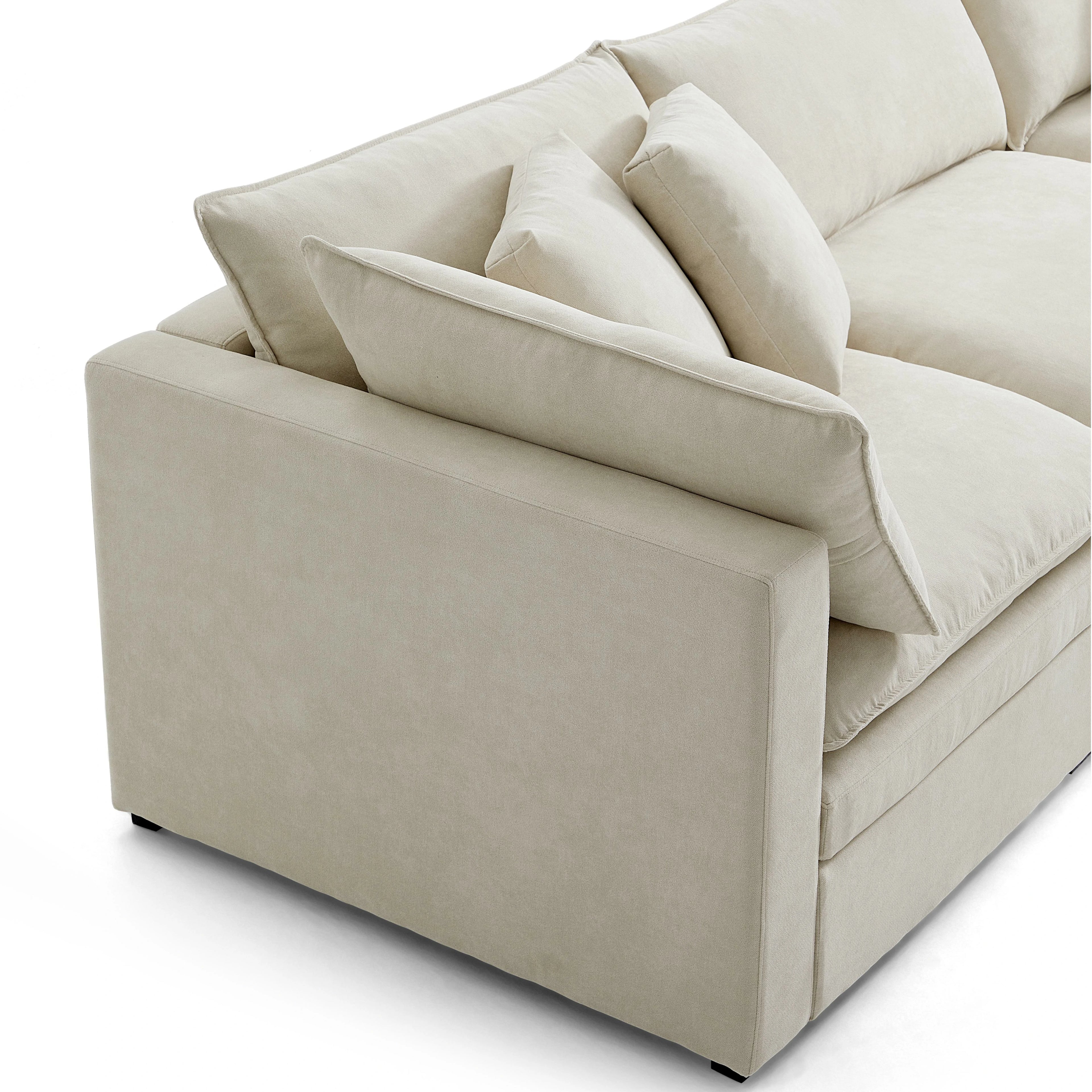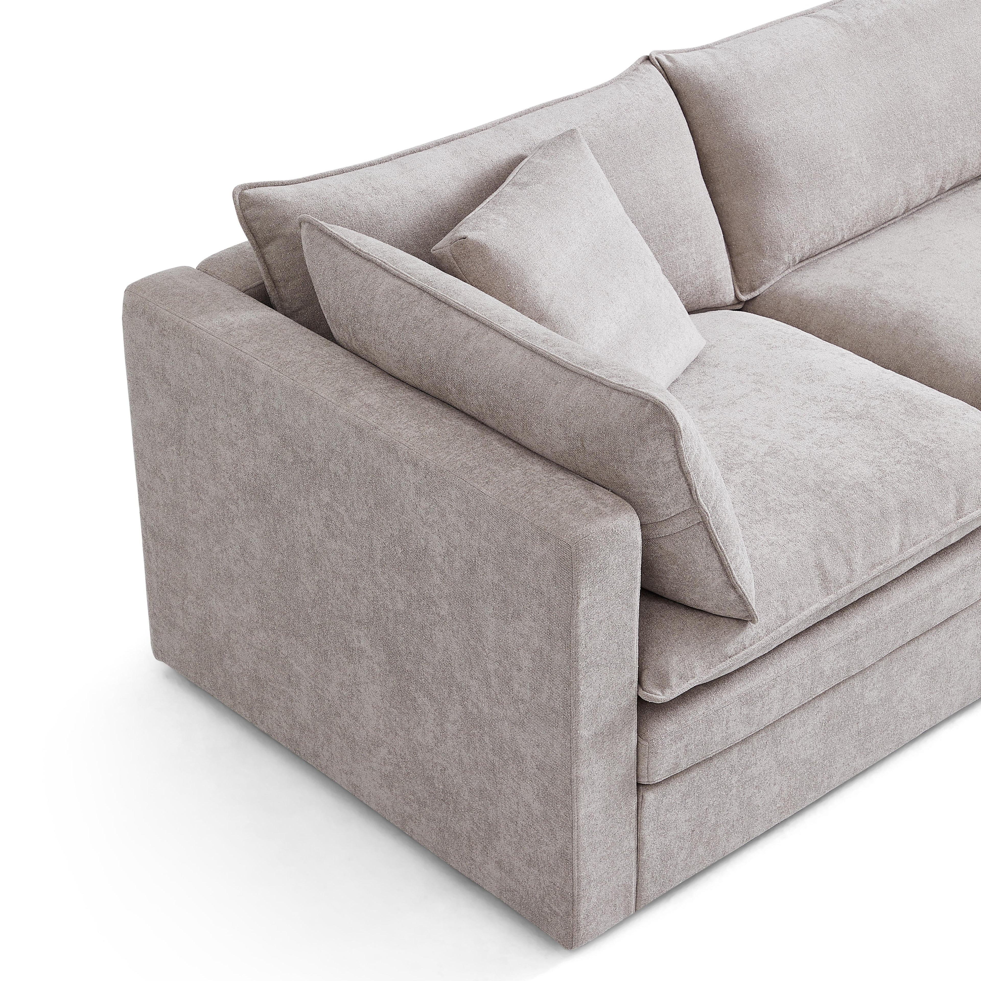 This sofa offers durable, high-resilience foam cushions and plush feather-down pillows for lasting comfort and support.