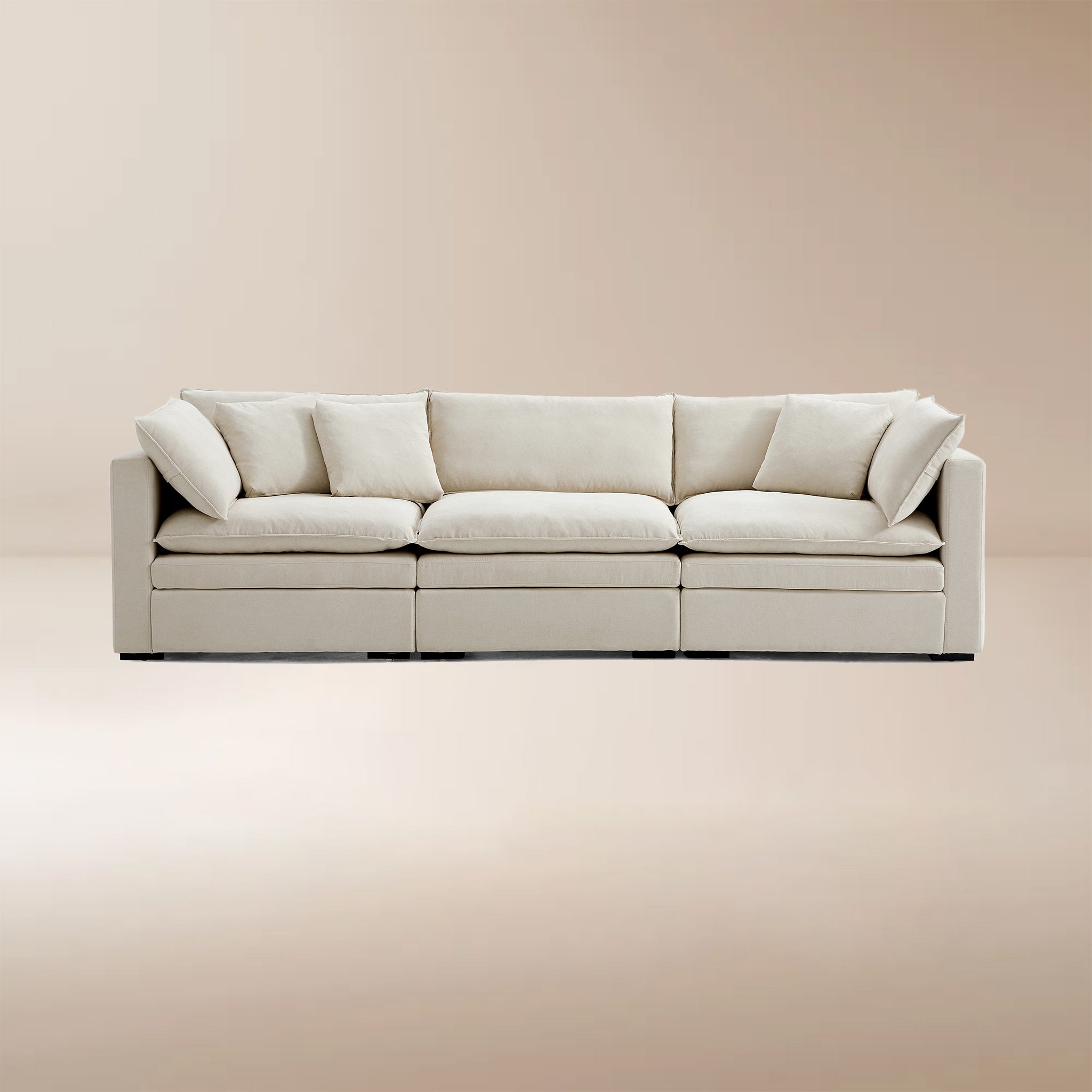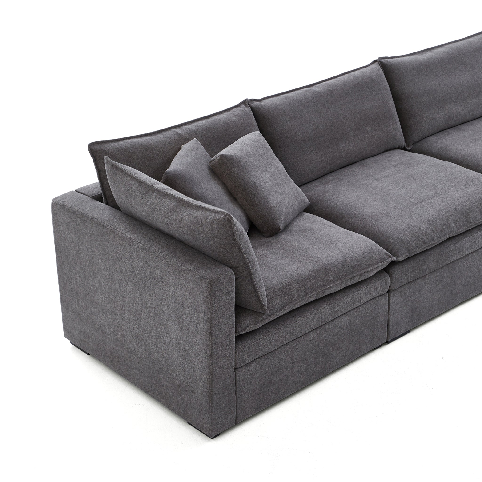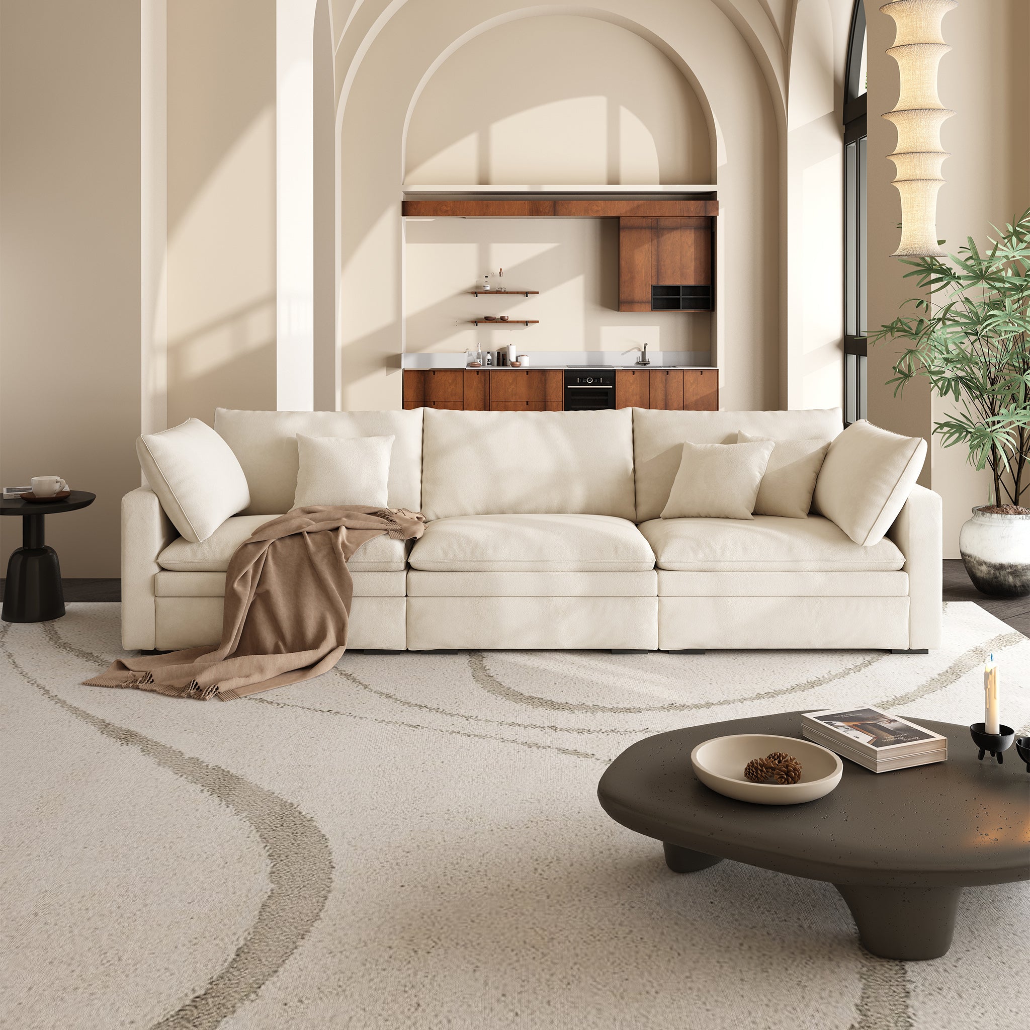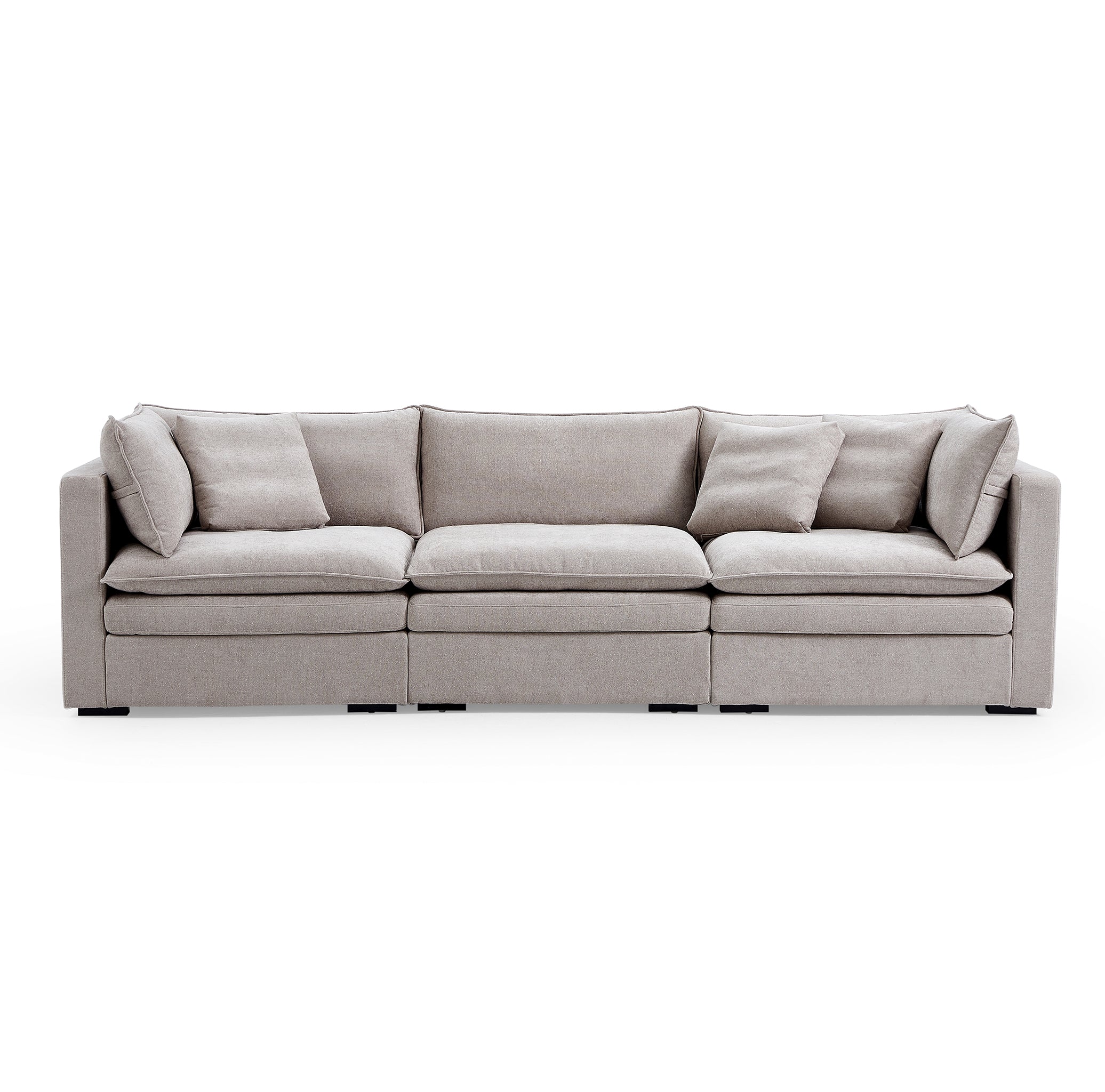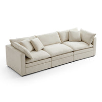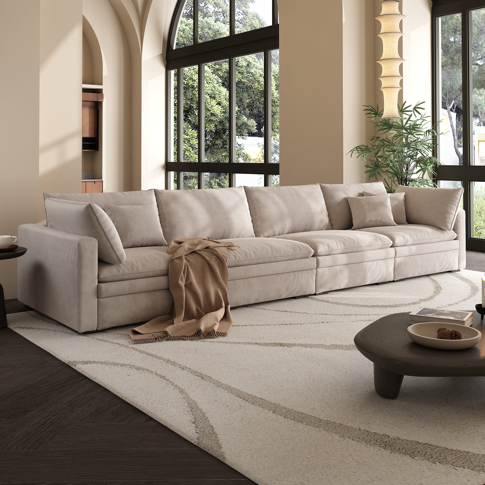 This sofa offers durable, high-resilience foam cushions and plush feather-down pillows for lasting comfort and support.