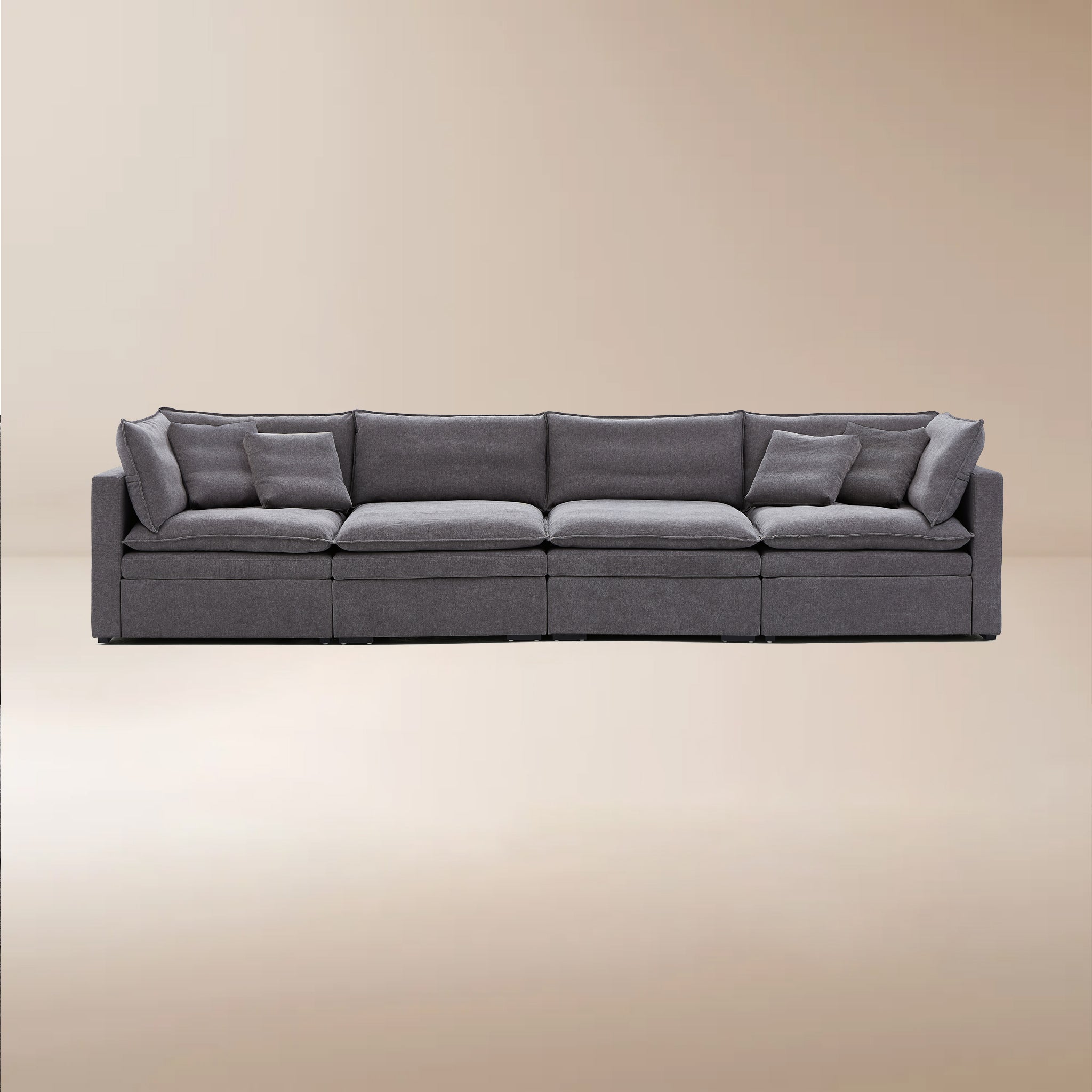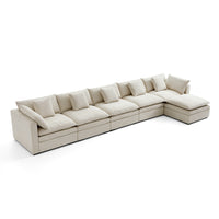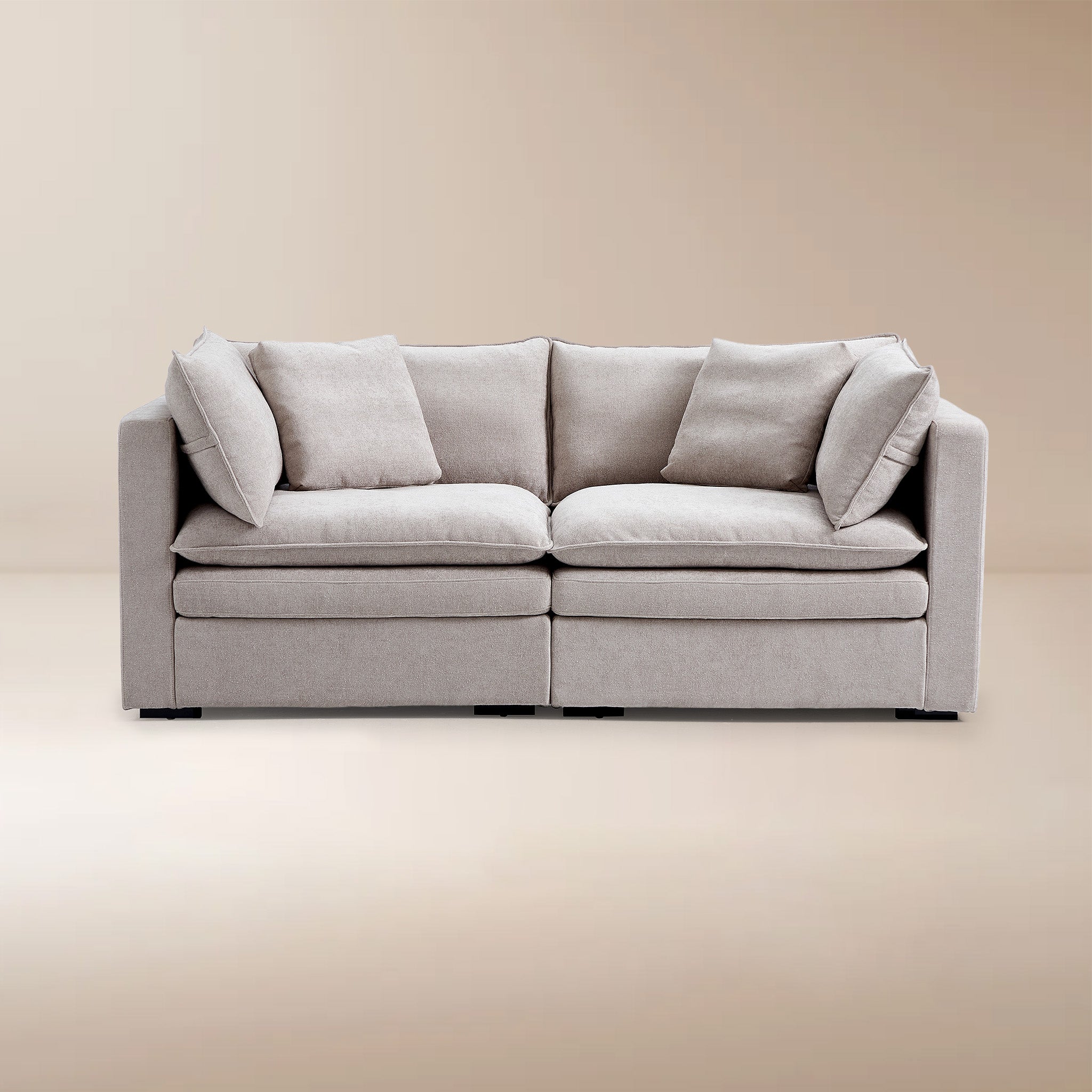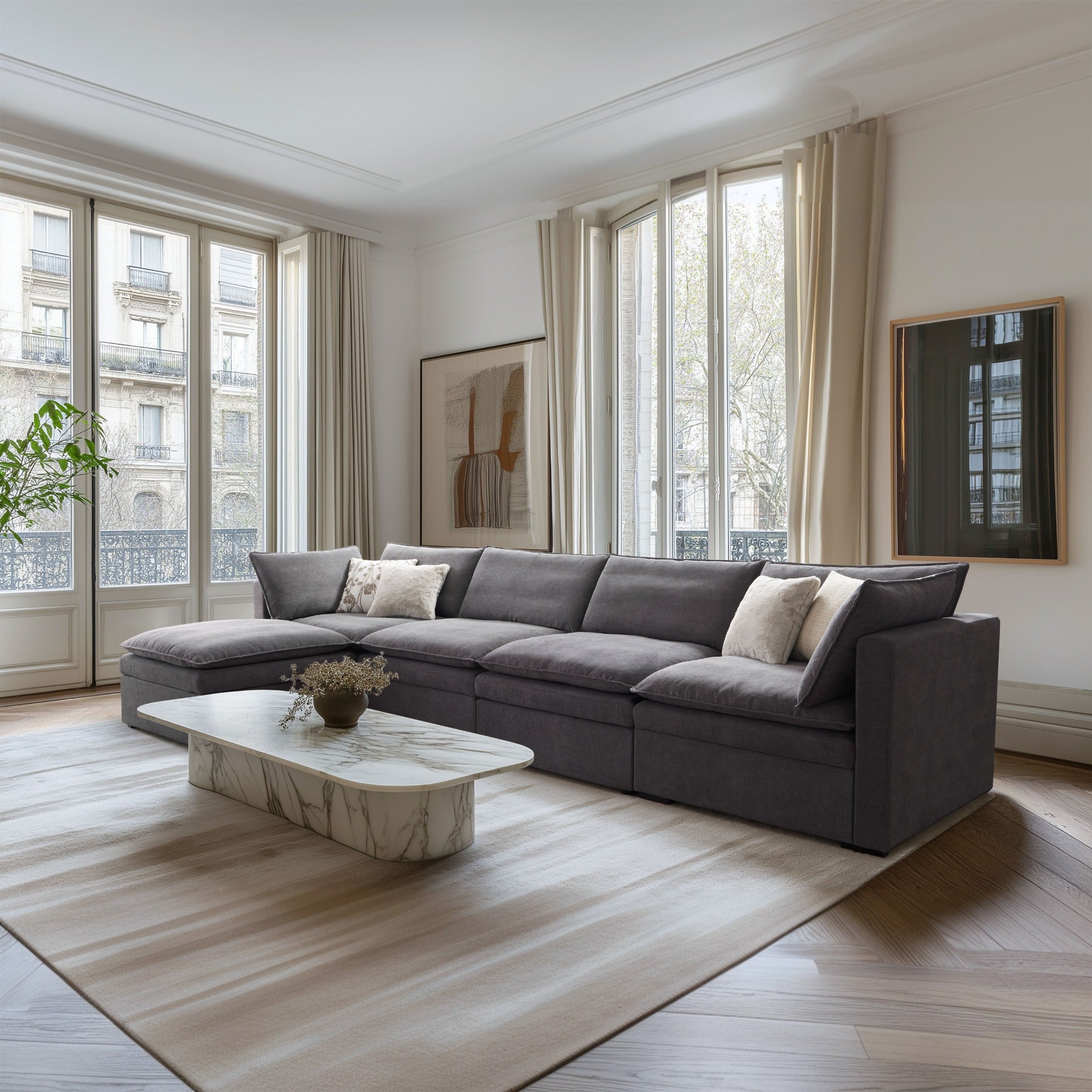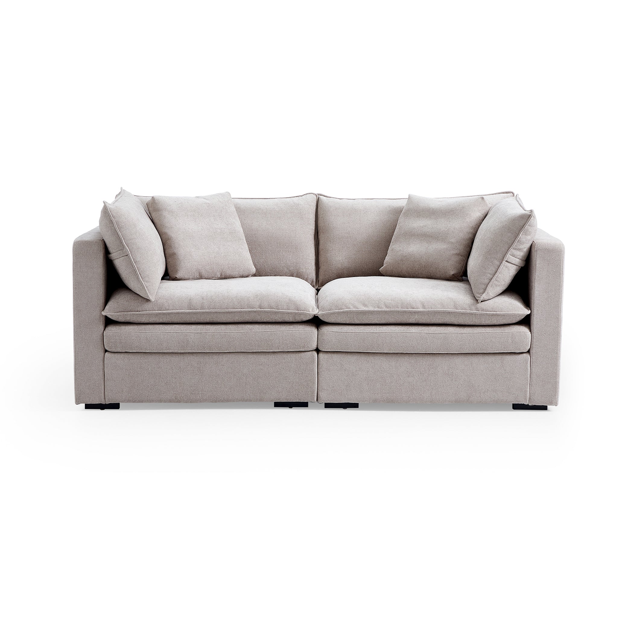 This sofa offers durable, high-resilience foam cushions and plush feather-down pillows for lasting comfort and support.