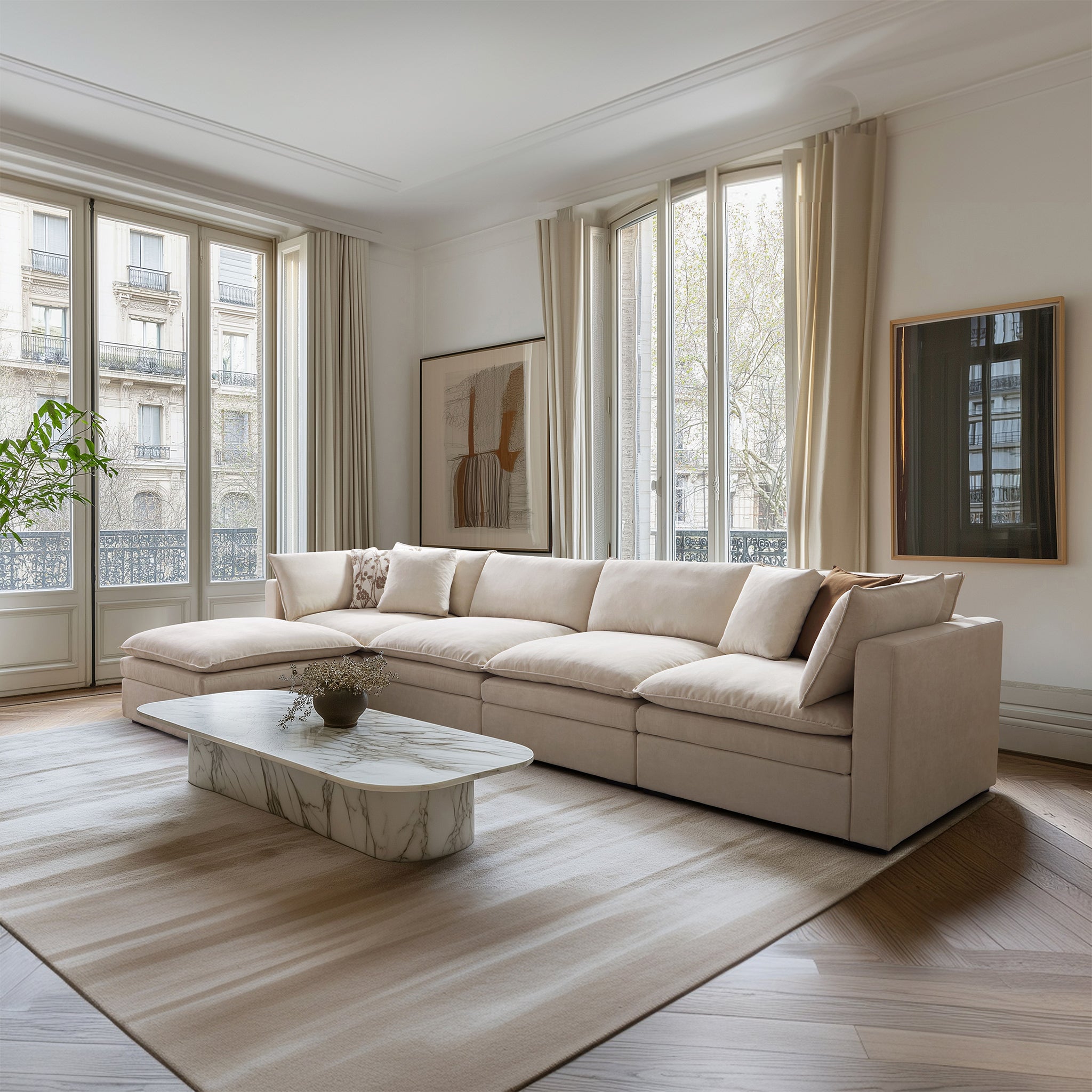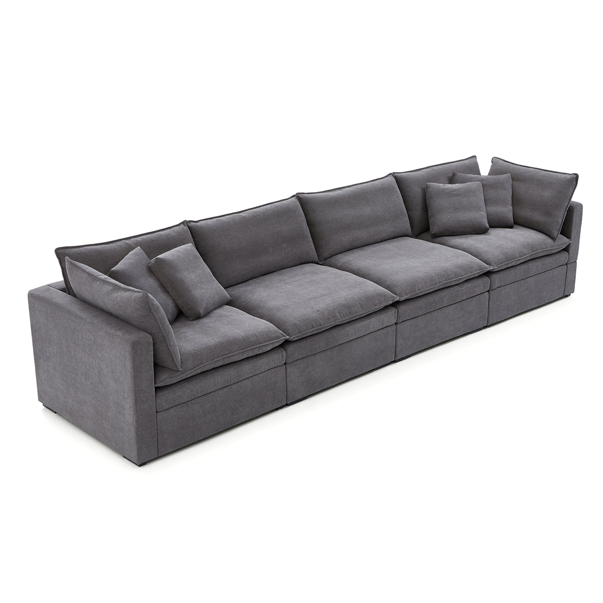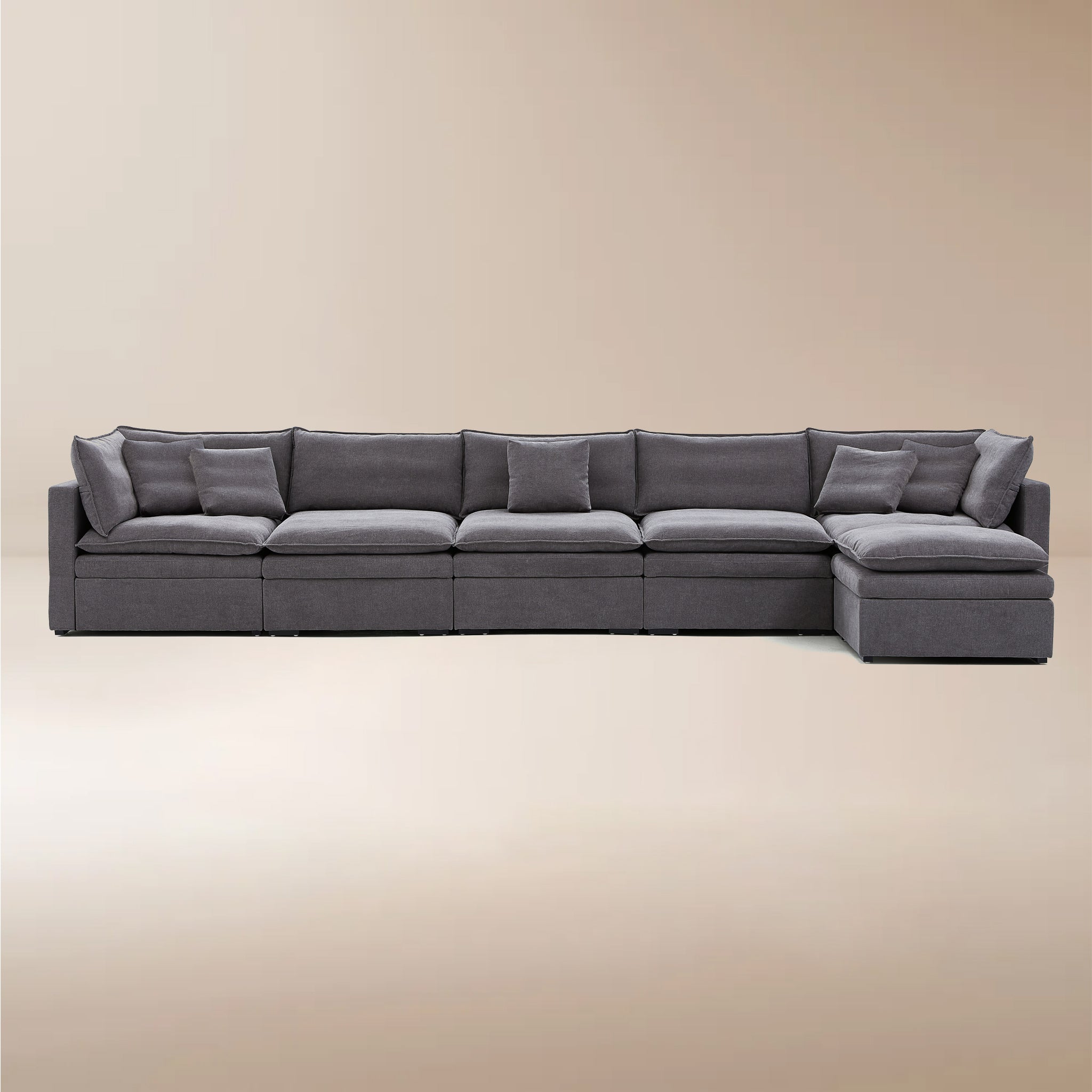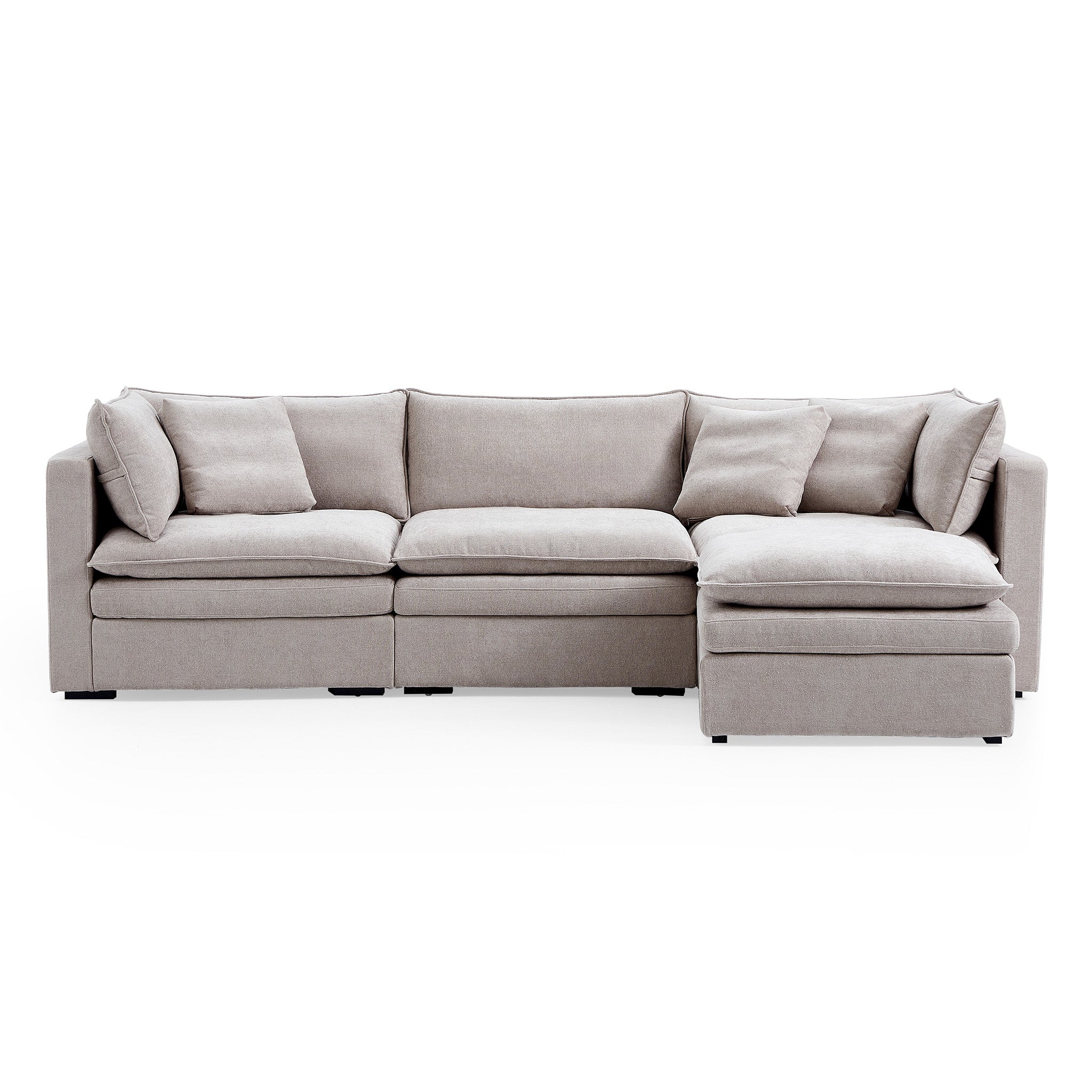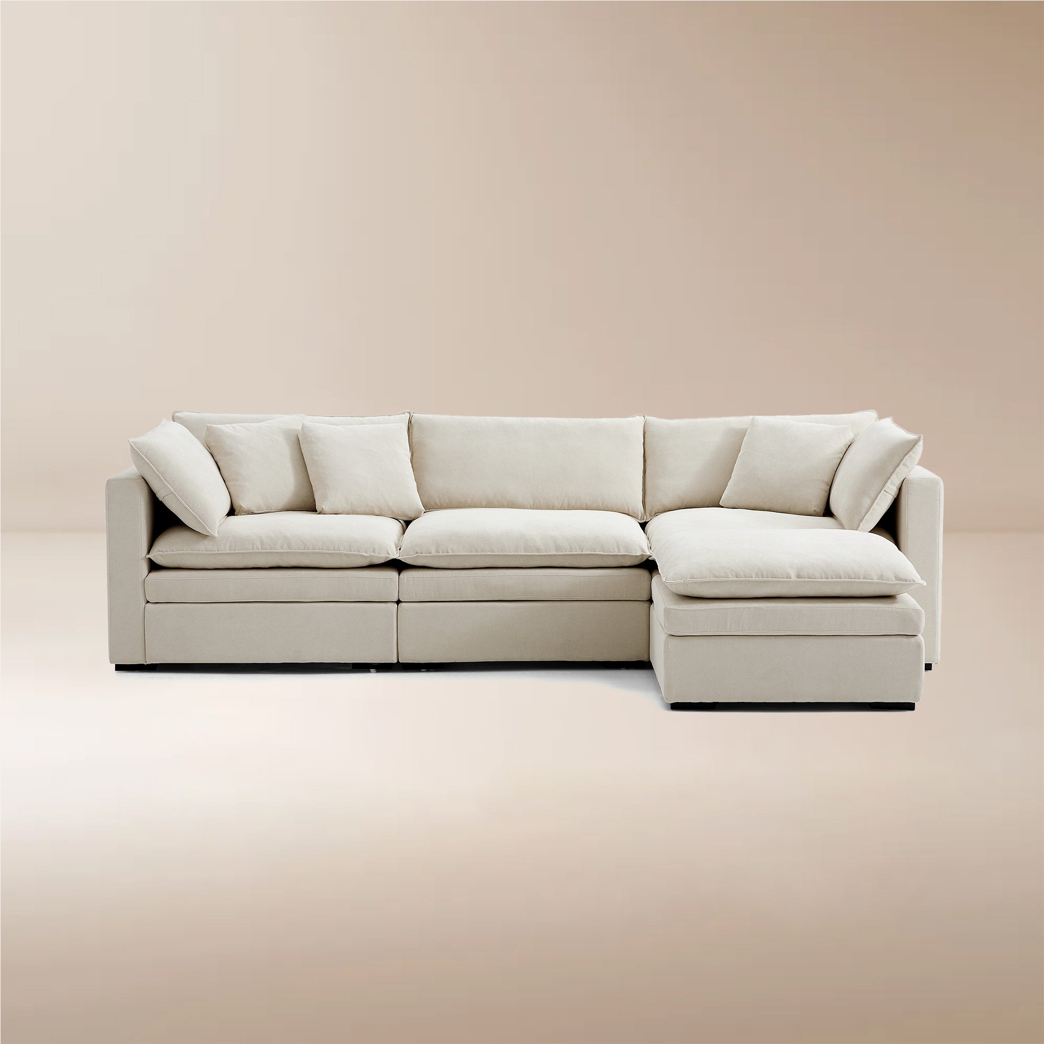 This sofa offers durable, high-resilience foam cushions and plush feather-down pillows for lasting comfort and support.