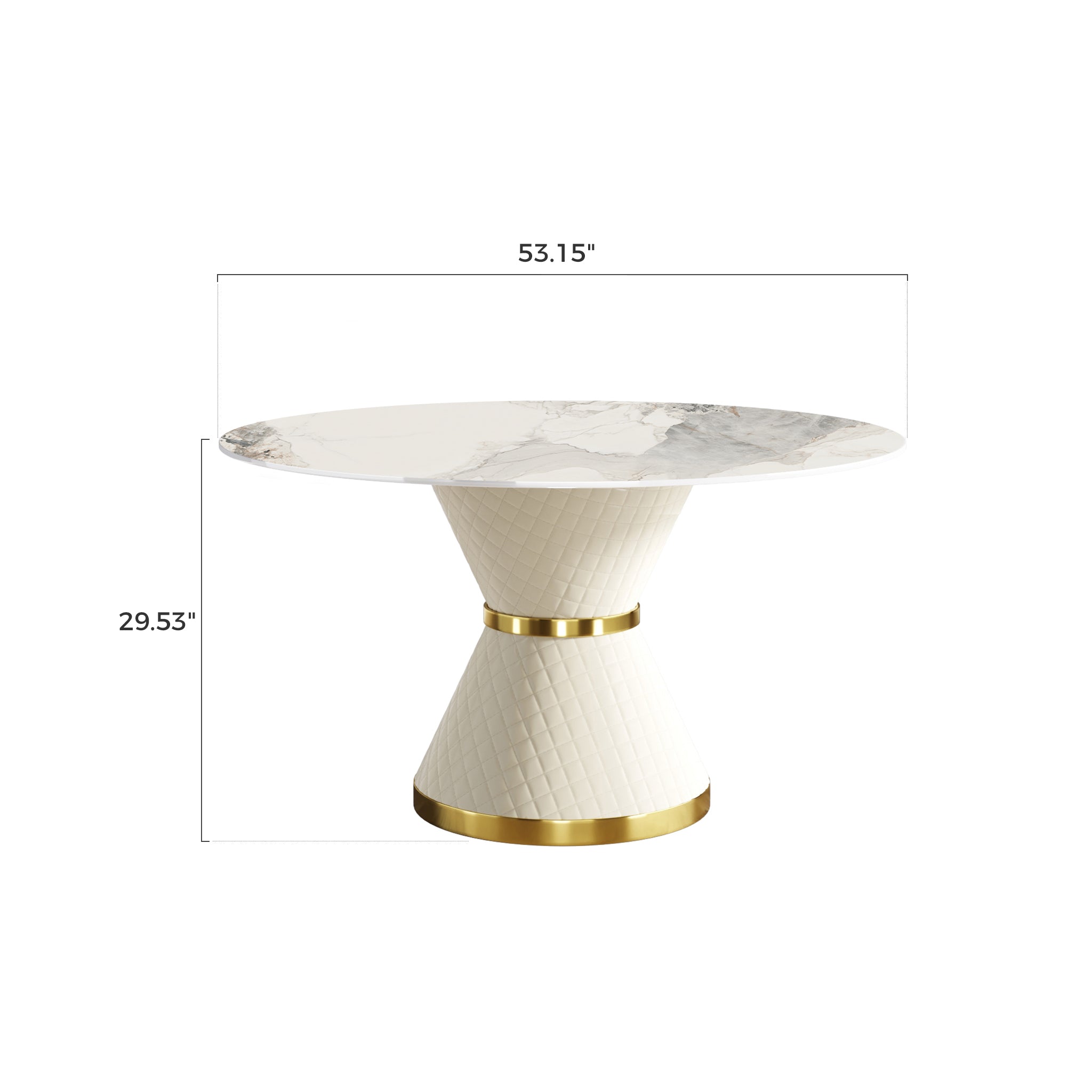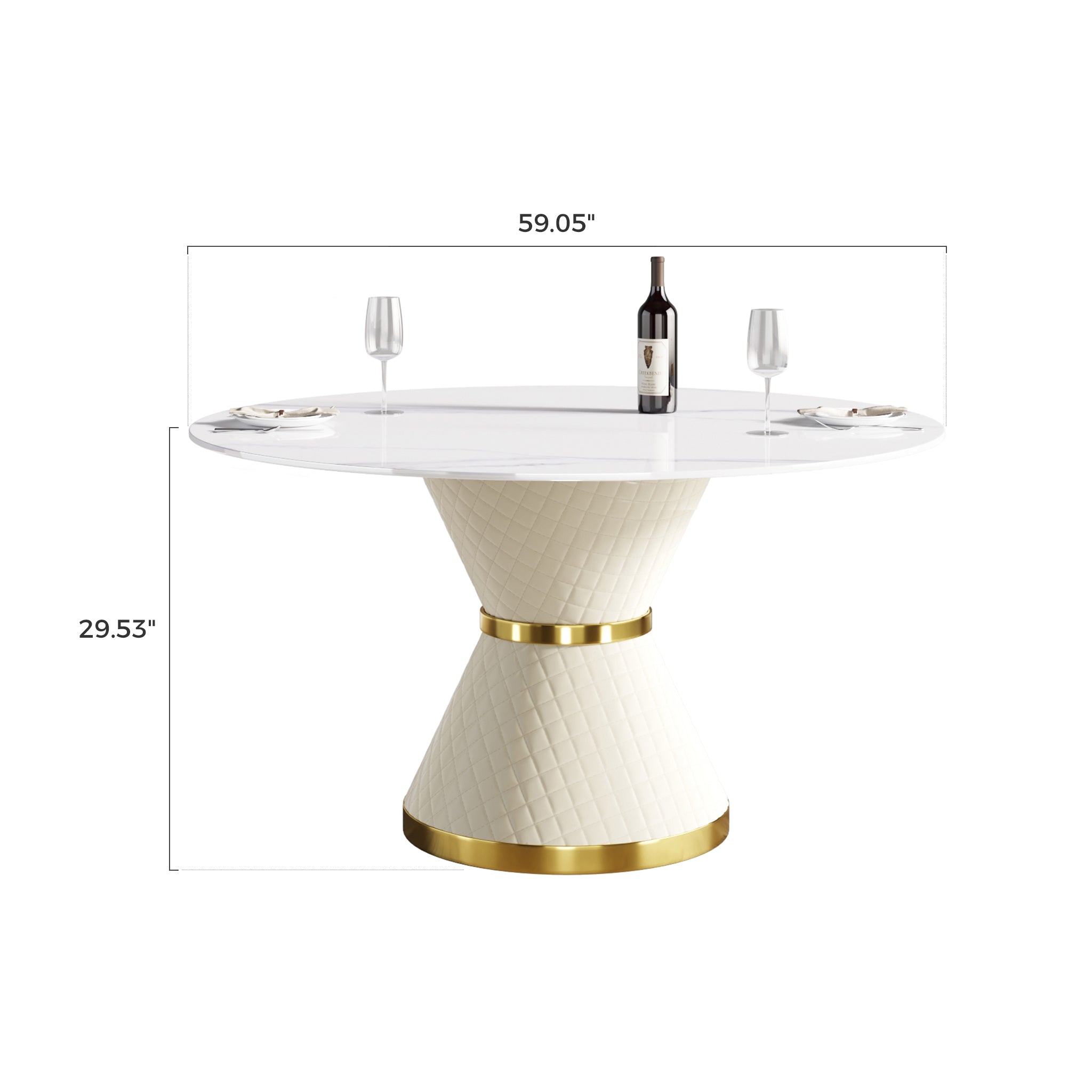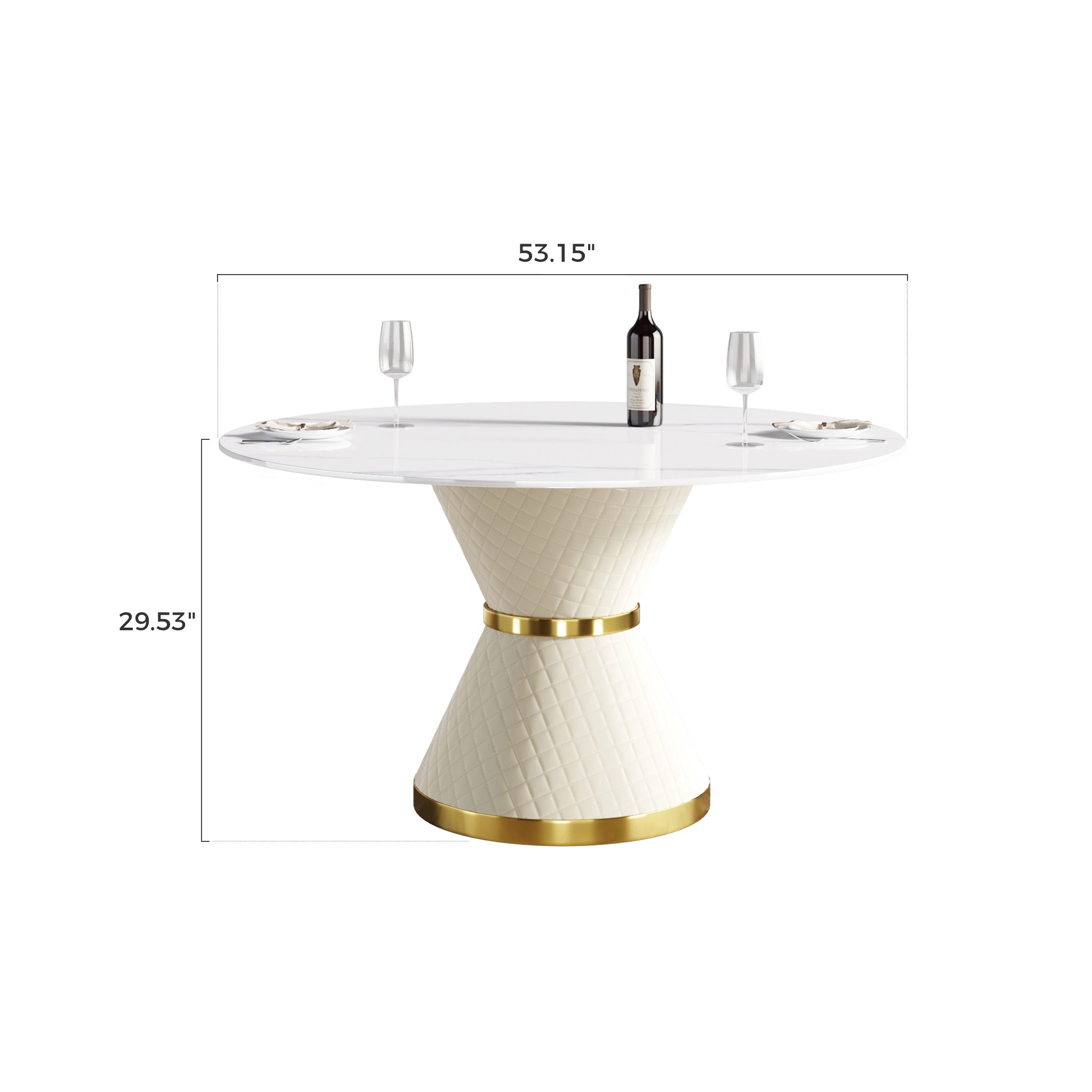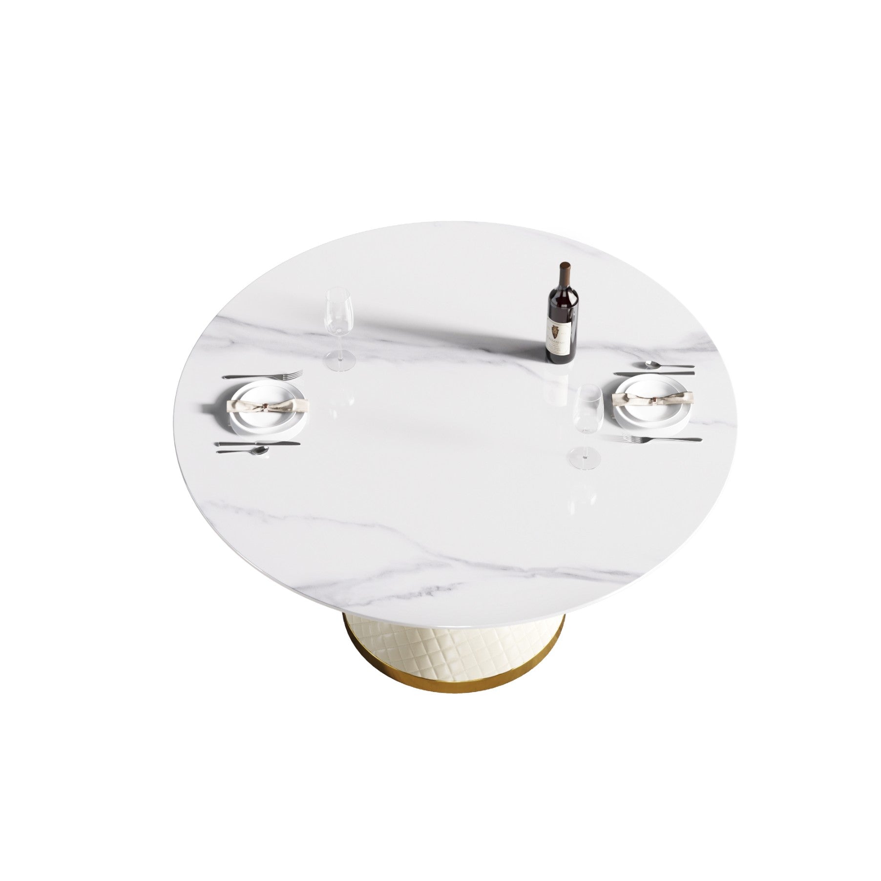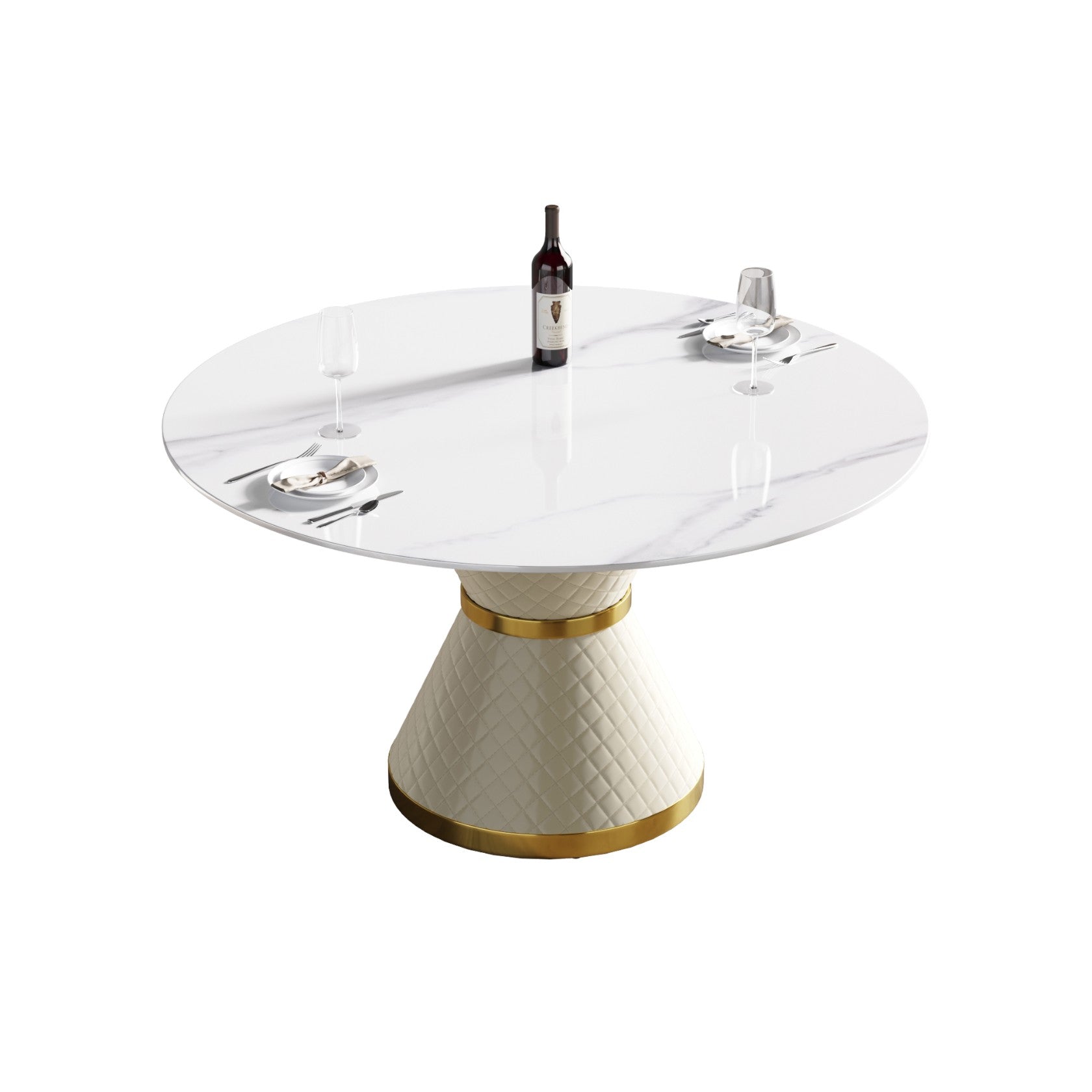 • Minimalist Round White Stone Dining Table – White Textured Wood Base, Seats 6White / White / 53" Table