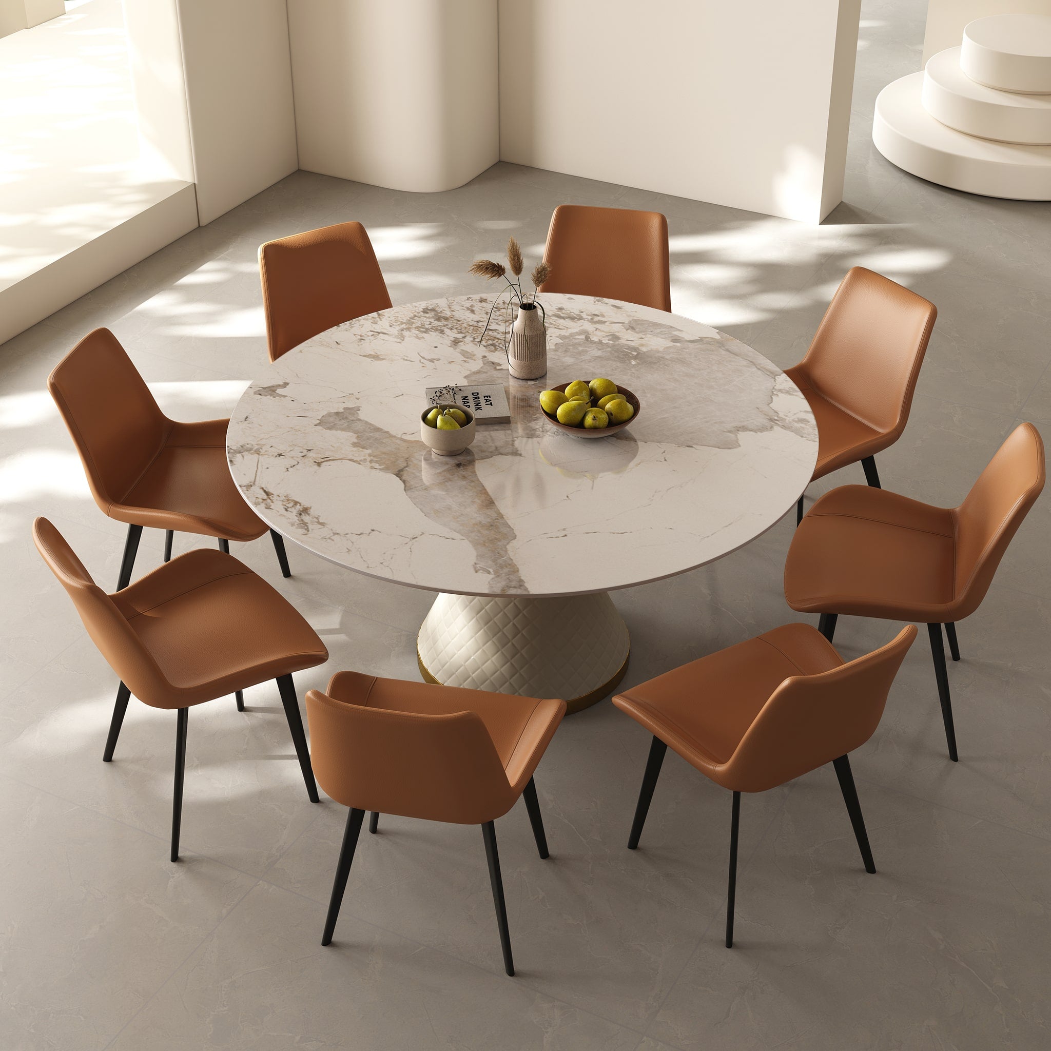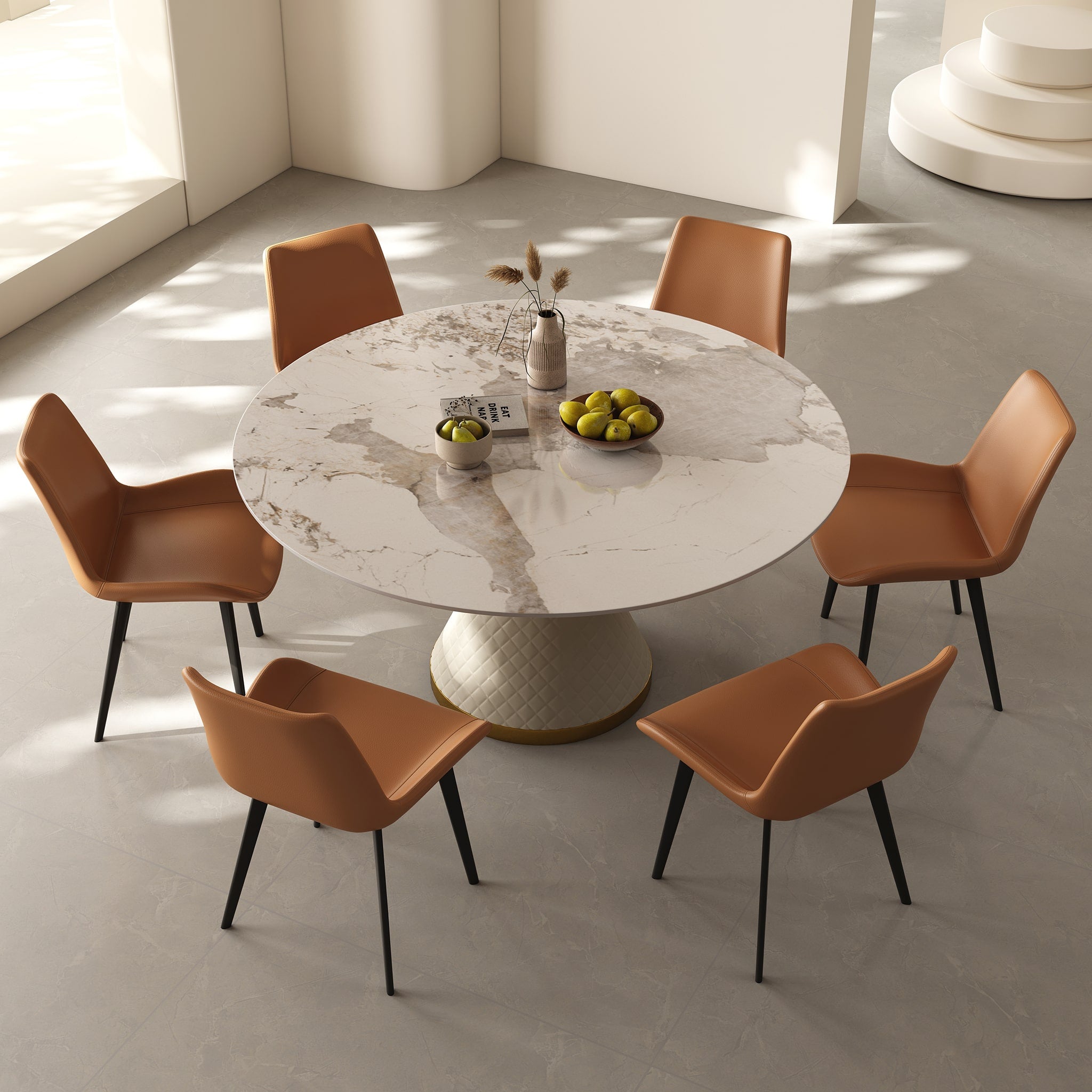 Minimalist Round White Stone Dining Table – White Textured Wood Base, Seats 6