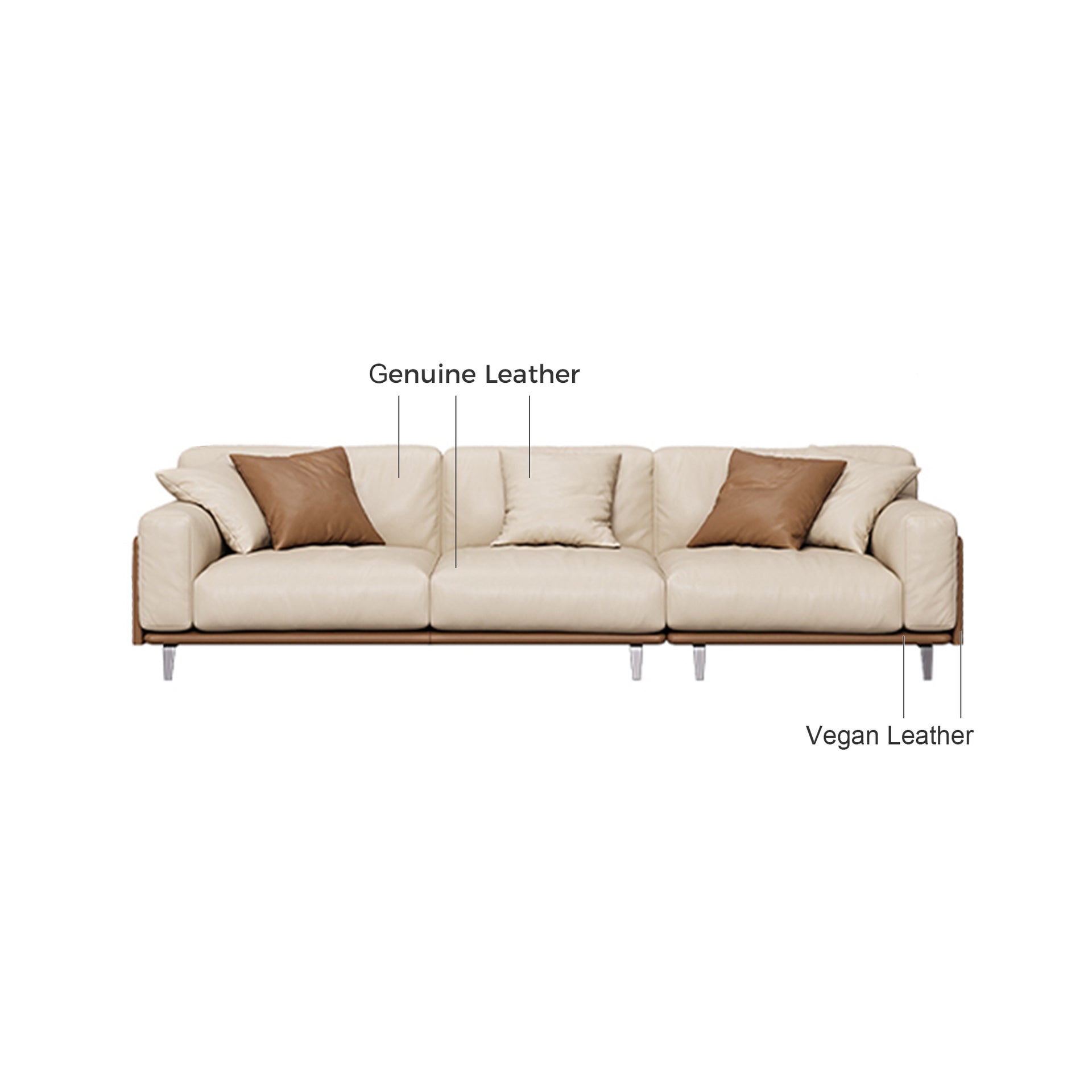 The cushion parts feature premium genuine leather, while the frame is crafted with vegan leather, both of them offering a smooth texture and long-lasting durability.