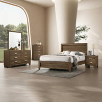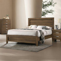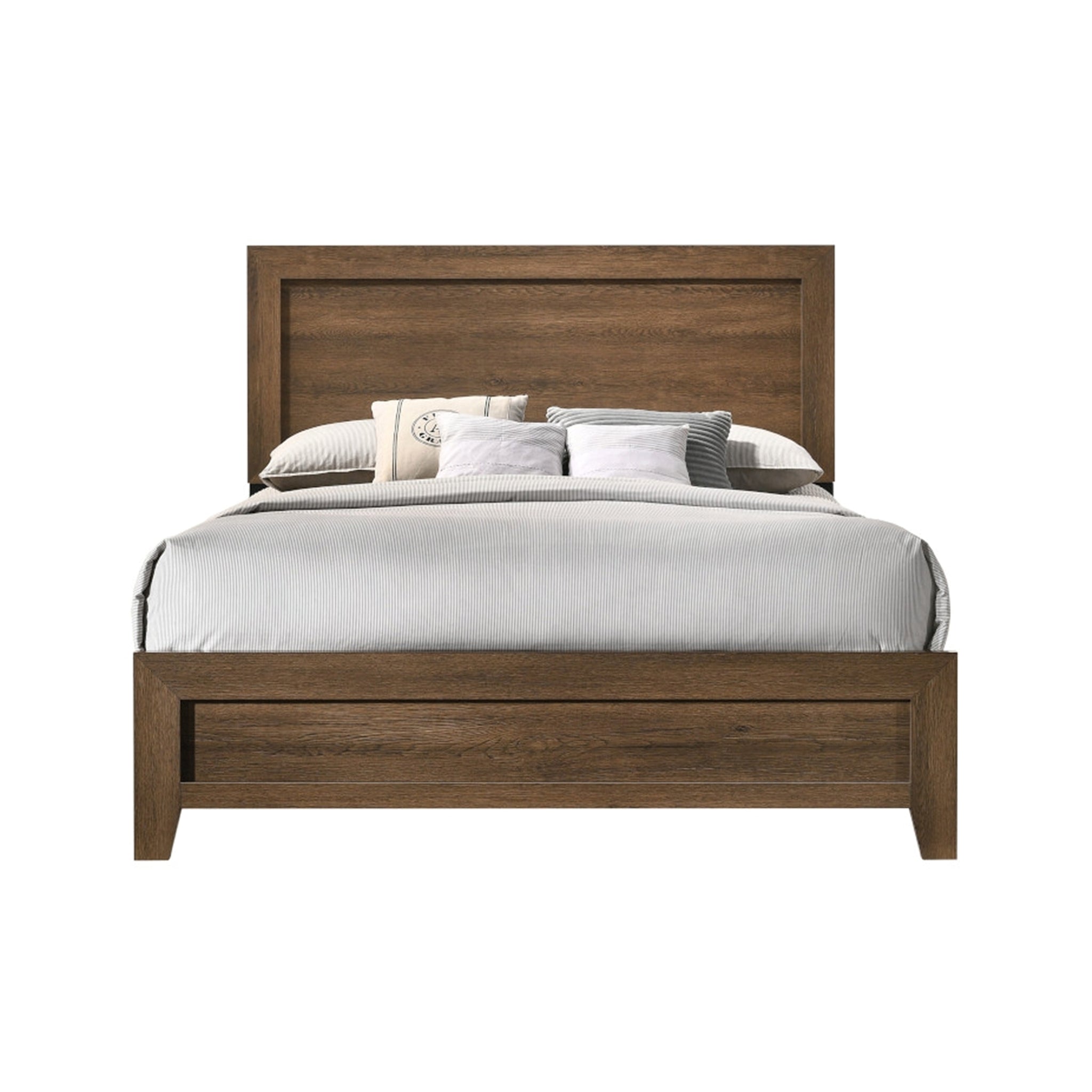 A modern, low-profile footboard and rectangular headboard with raised molding trim create a clean, contemporary look.