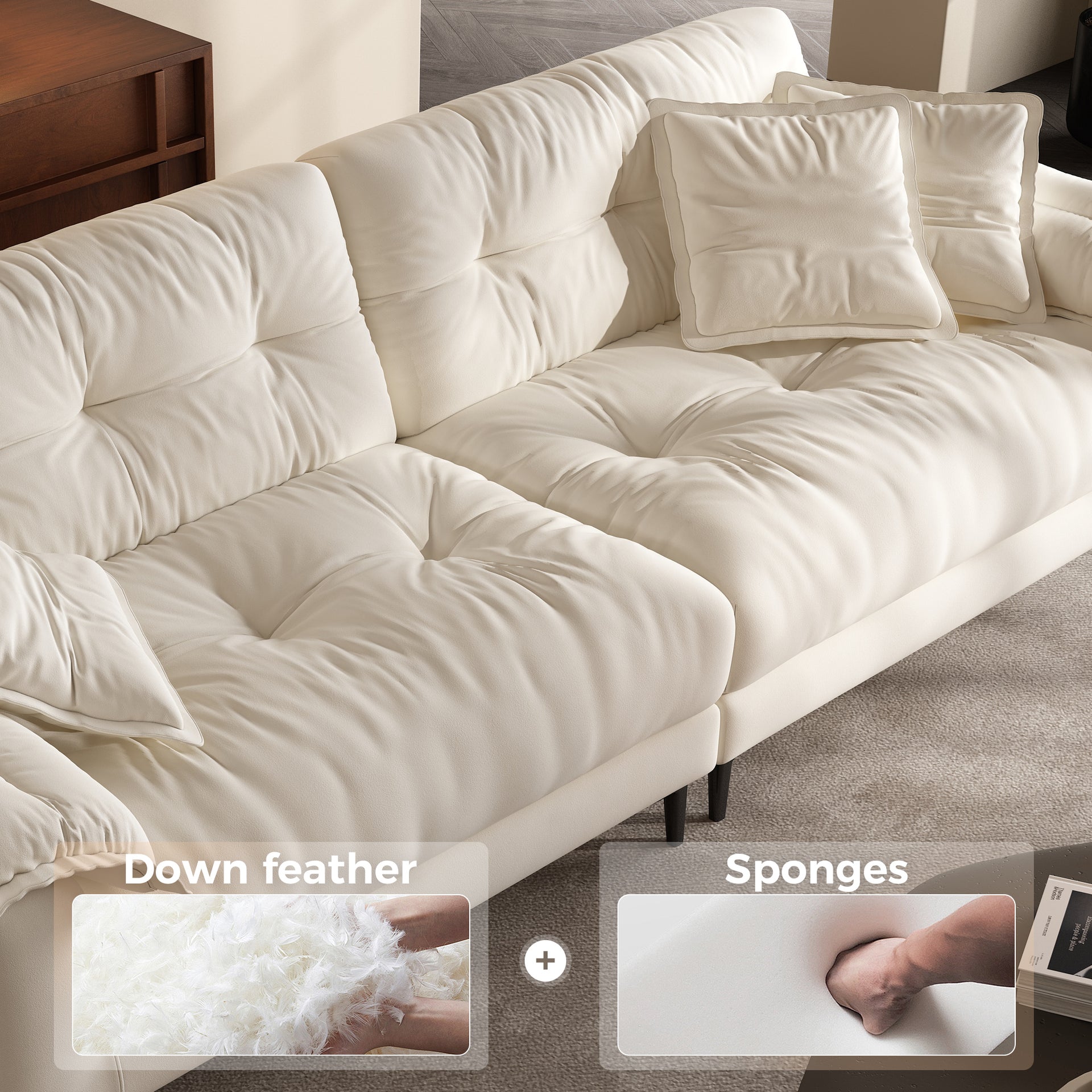 Filled with a premium blend of feathers and high-resilience foam, this sofa delivers the ideal balance between sink-in softness and lasting support. The feather layer adds a plush, cloud-like feel, while the foam core ensures structure and durability—creating a seating experience that’s both indulgent and dependable, day after day.